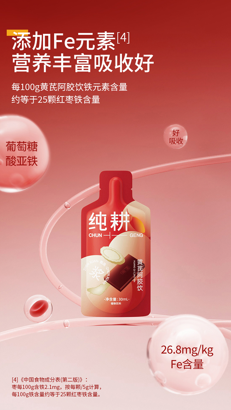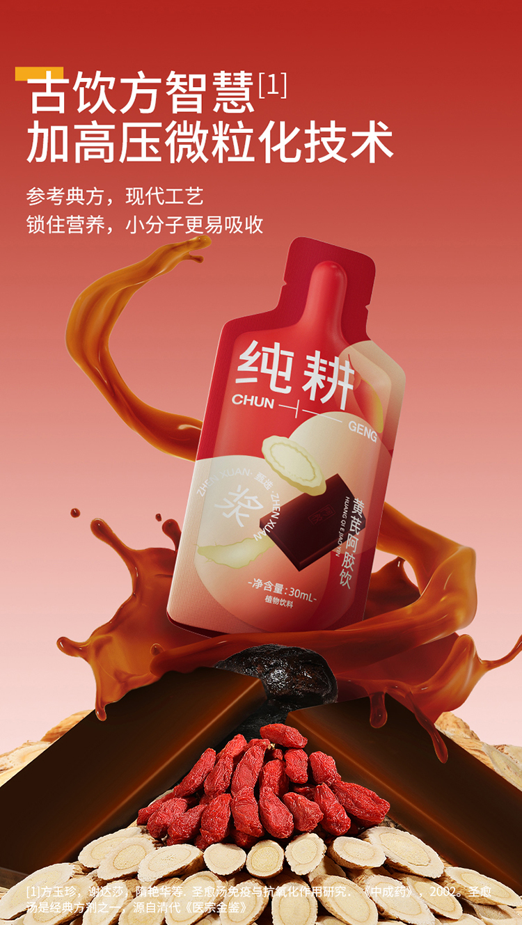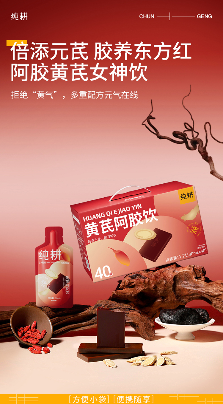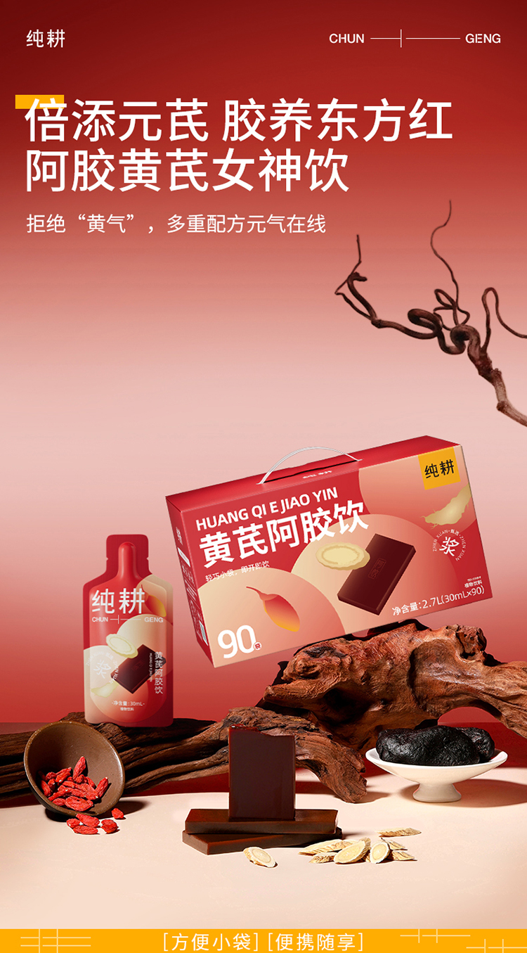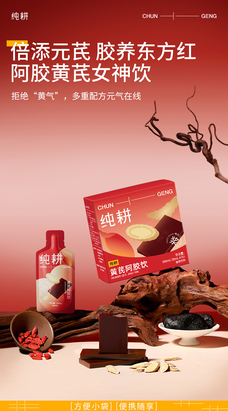 纯耕300ml(10袋)1.2L(40袋)2.7L(90袋)黄芪阿胶饮,每袋30ml;黄芪+阿胶女神饮真驴皮阿胶,丰富铁元素元气满满