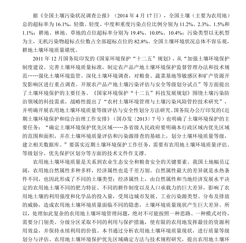 农用地土壤环境质量是关系到农业生态安全和粮食安全的关键要素,需要分门别类、分级分区采取不同的利用与保护措施,使有限的农用地发挥最佳的资源利用效益,并保持永续利用的价值。本书在环保公益性行业科研专项项目“农用地土壤环境质量评估与等级划分及优先保护区域确定技术研究”(No.201409044)研究报告基础上编纂而成,通过分析农用地土壤环境质量现状,进行质量等级划分与评估、农用地土壤环境保护优先区域确定方法与技术规程研究,提出农用地土壤环境保护优先区域确定方法,为我国农用地土壤环境保护和分类管理提供技术支撑。