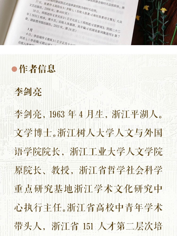 李剑亮,1963年4月生,浙江平湖人。文学博士。浙江树人大学人文与外国语学院院长,浙江工业大学人文学院原院长、教授,浙江省哲学社会科学重点研究基地浙江学术文化研究中心执行主任。浙江省高校中青年学术带头人,浙江省151人才第二层次培养人员。国家级精品资源共享课“中国古代文学”负责人。浙江省文学学会副会长,浙江省汉语言文学专业教学指导委员会秘书长。主持国家社科基金项目、教育部人文项目、省社科基金项目等。出版《唐宋词与唐宋歌妓制度》、《唐宋词汇评》(与吴熊和教授等合著)、《宋词诠释学论稿》、《流行歌曲与古典诗词》、《夏承焘年谱》、《民国词的多元解读》、《民国教授与民国词坛》、《吴熊和学术年谱》等著作,在《文学遗产》《词学》等刊物发表论文60多篇。获教育部国家教育成果二等奖(合作)1项,浙江省哲学社会科学优秀成果一等奖1项(合作),三等奖、优秀奖各1项,第五、六届夏承焘词学奖二等奖各1项。曾被评为浙江省高校优秀中青年教师,浙江省师德先进个人。
