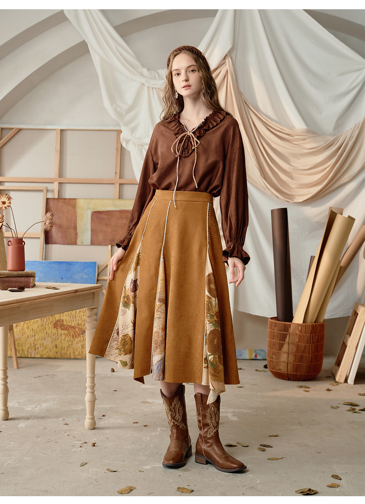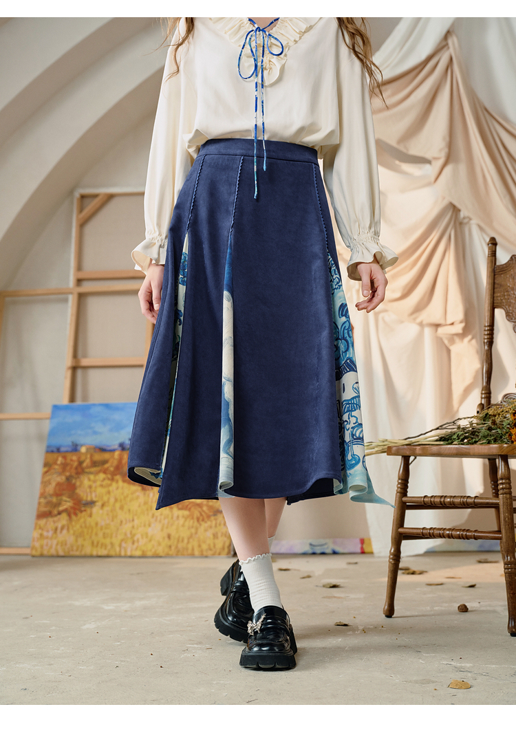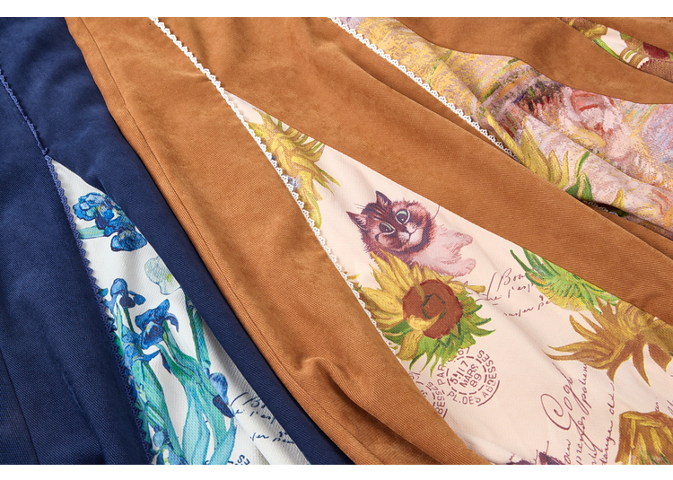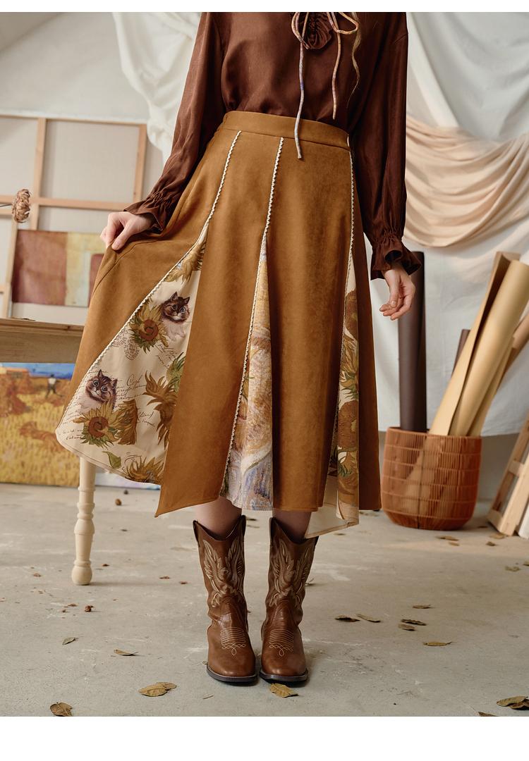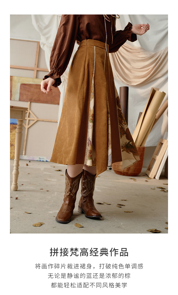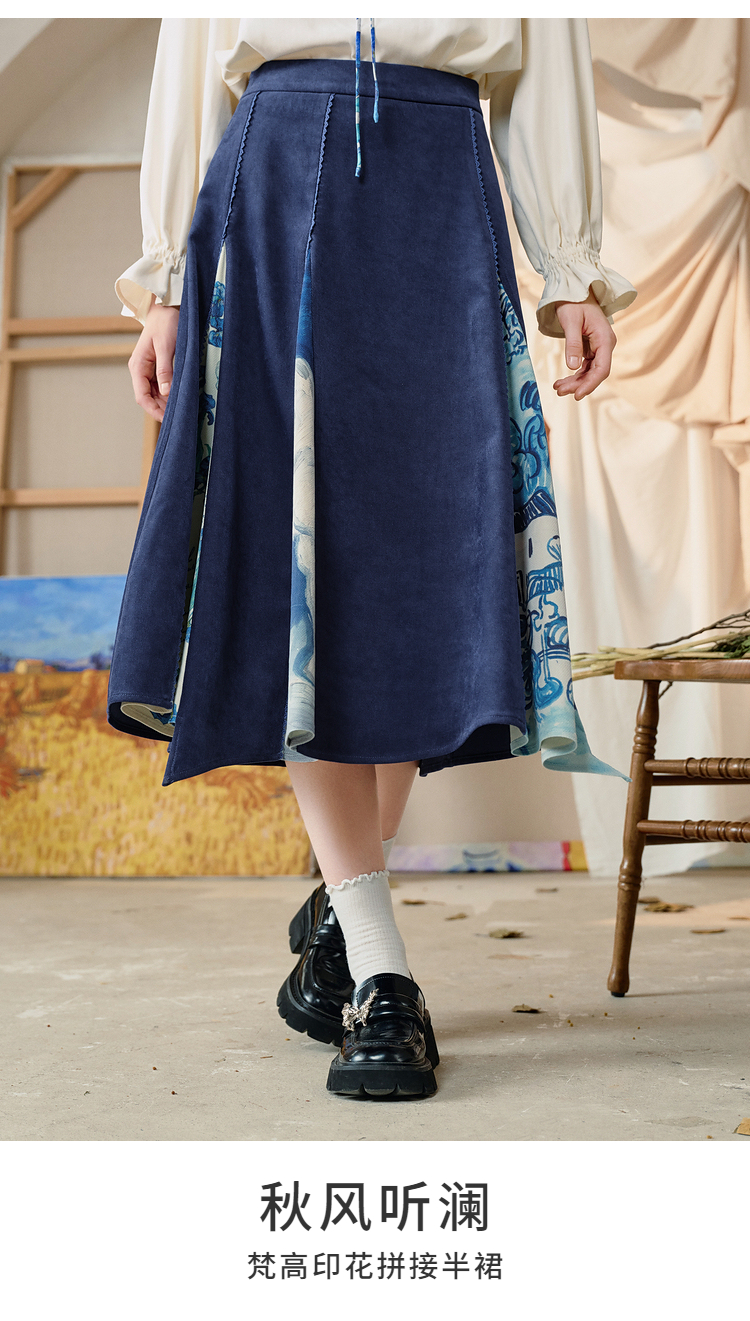 两三事梵高文艺 秋风听澜 2025秋冬新款印花布拼接a字半身裙长裙