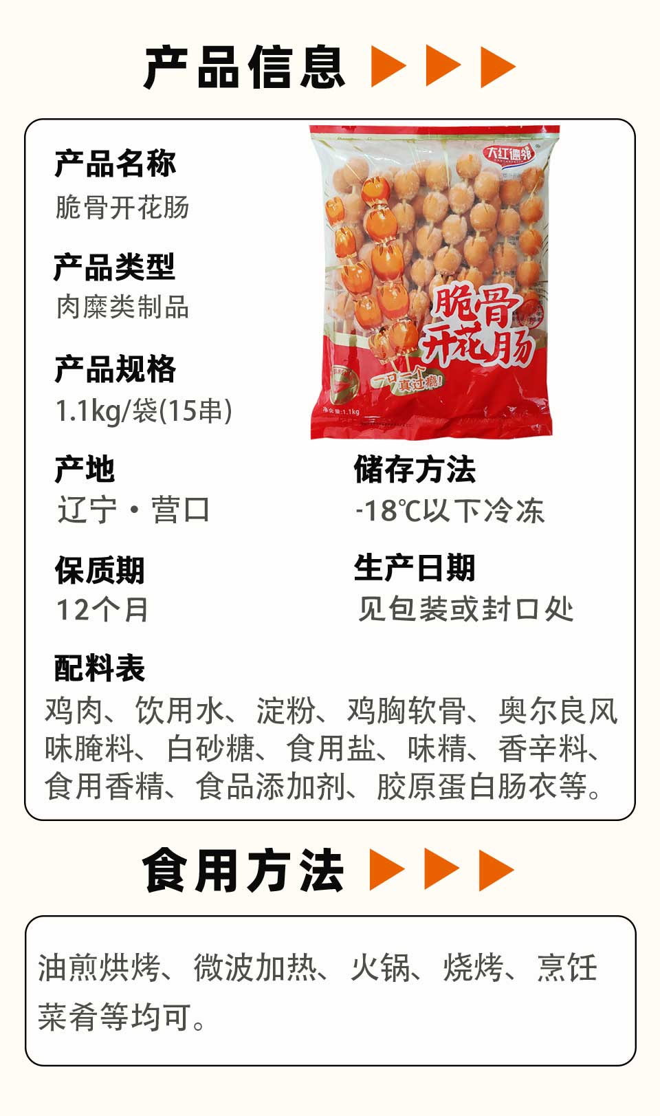 K大红德邻脆骨开花肠 1.1kg/袋(15串) 8袋/件