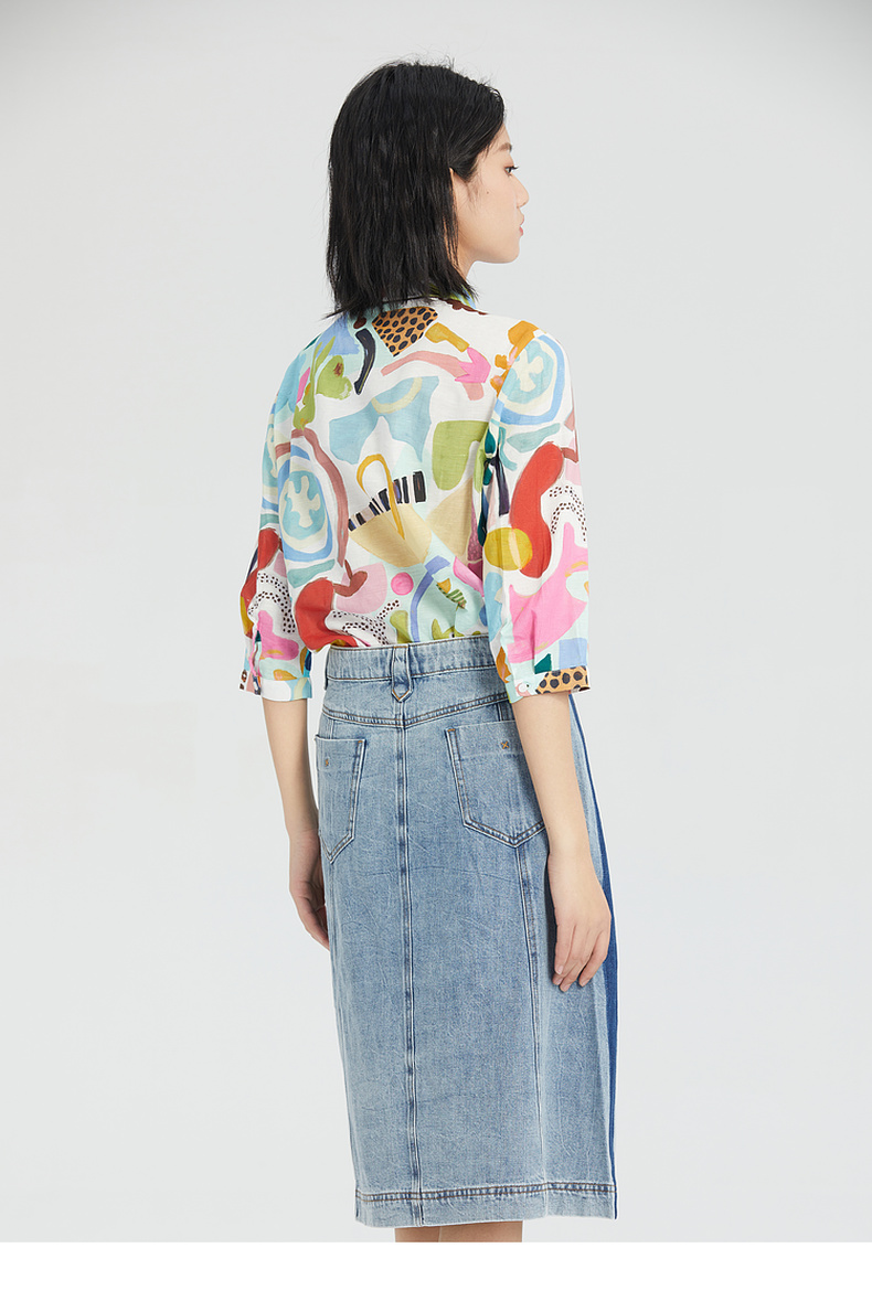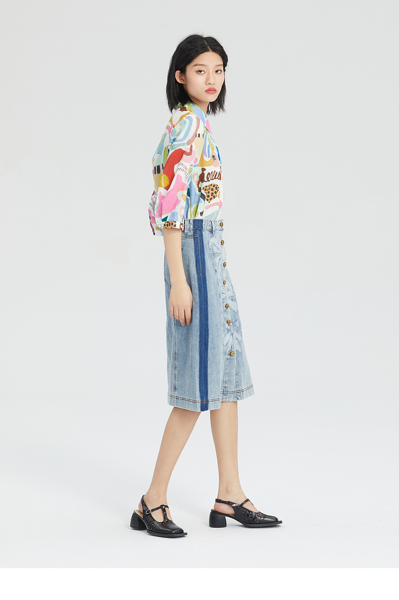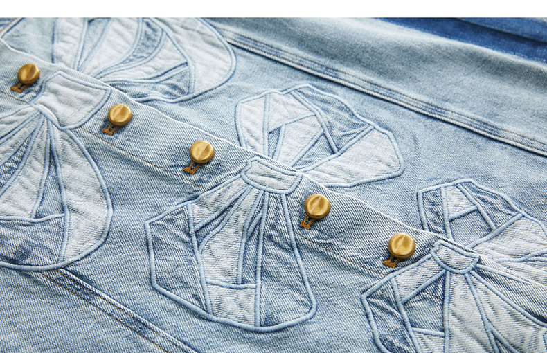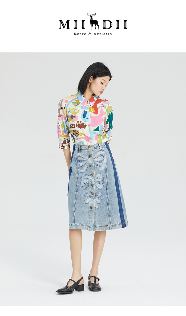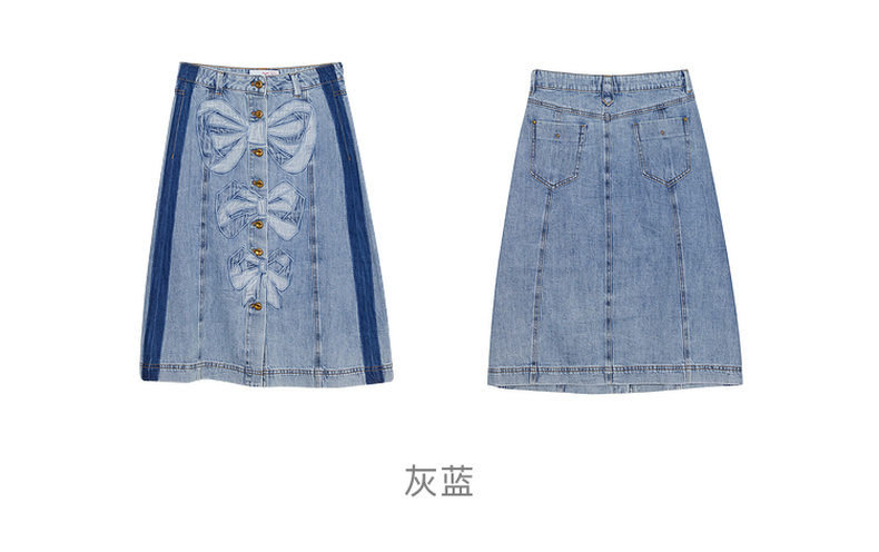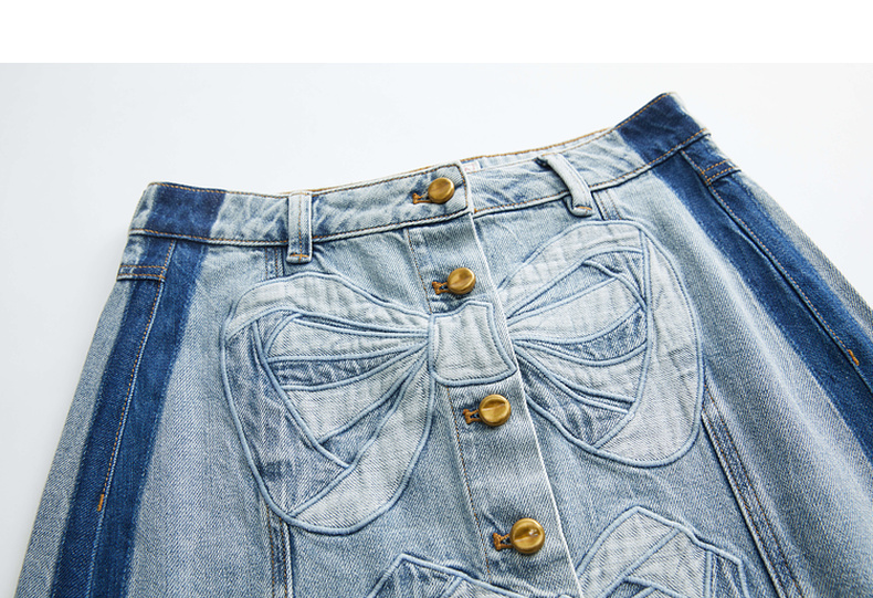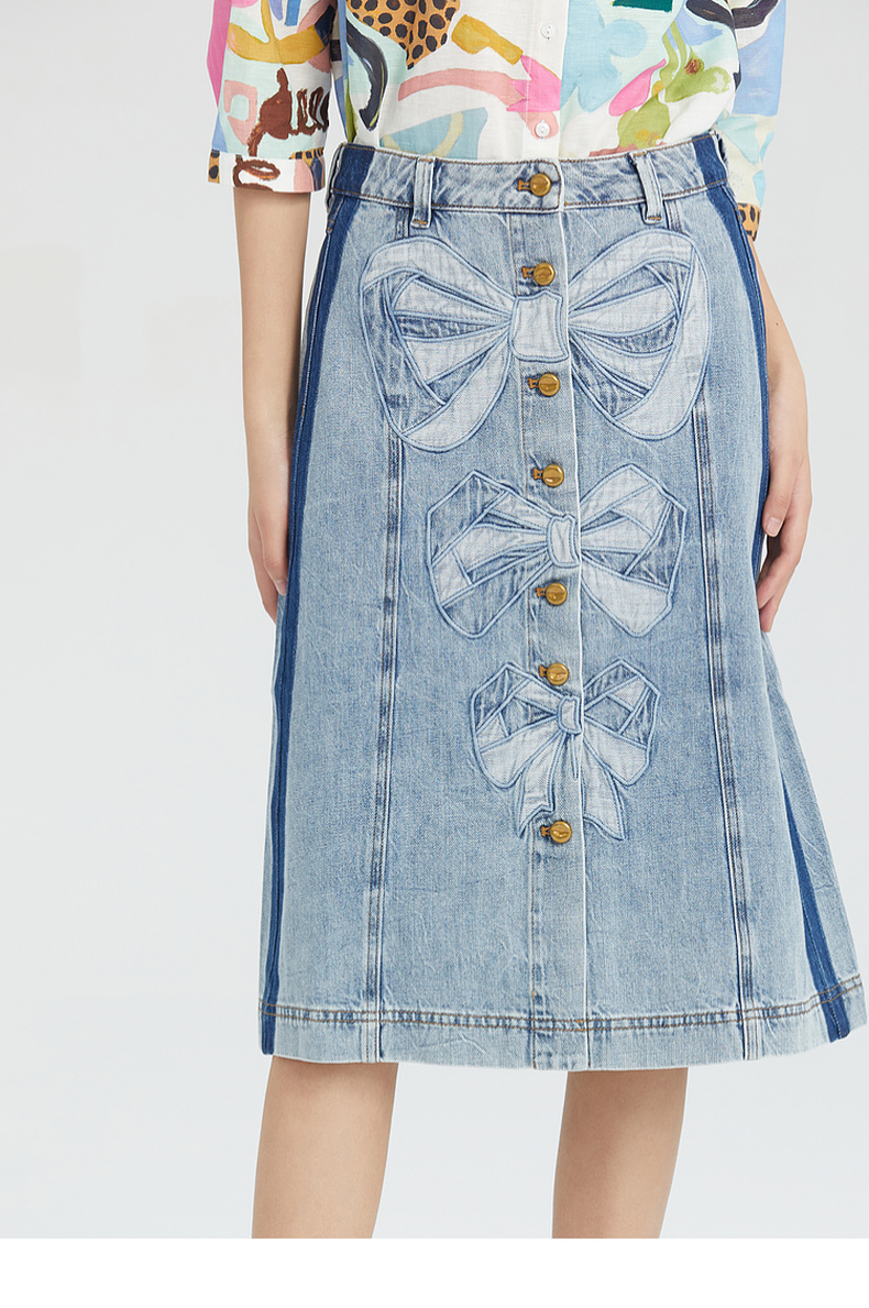 谜底2023夏季复古减龄蝴蝶结贴布绣A字型纯棉牛仔半身裙235MB6002