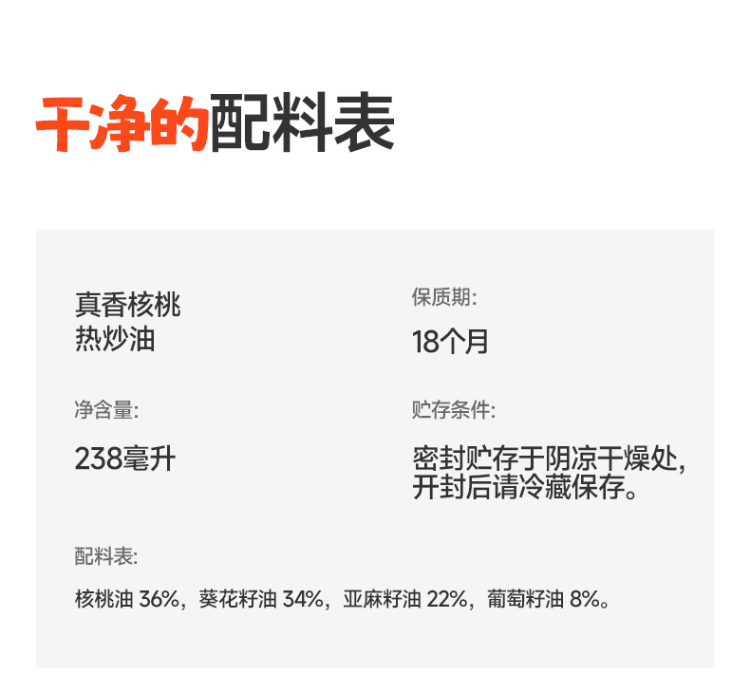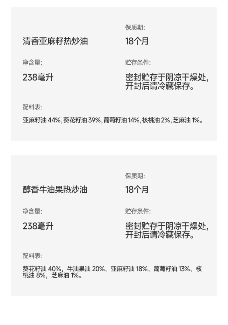 【调味】【新品-热炒油】清香亚麻籽热炒油238mL/真香核桃热炒油238mL/醇香牛油果热炒油238ml