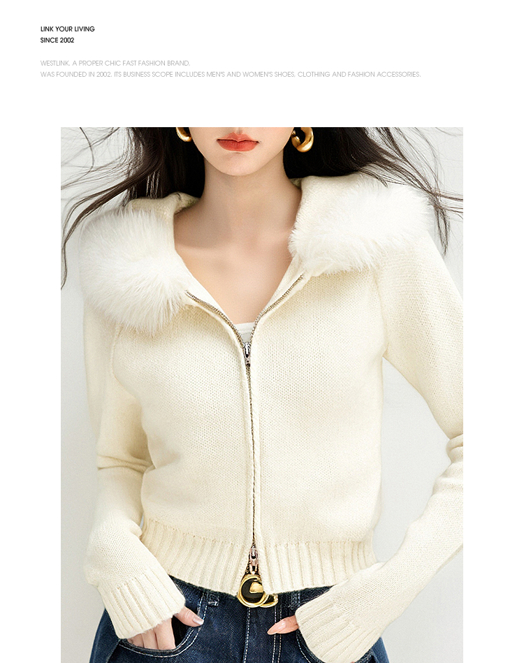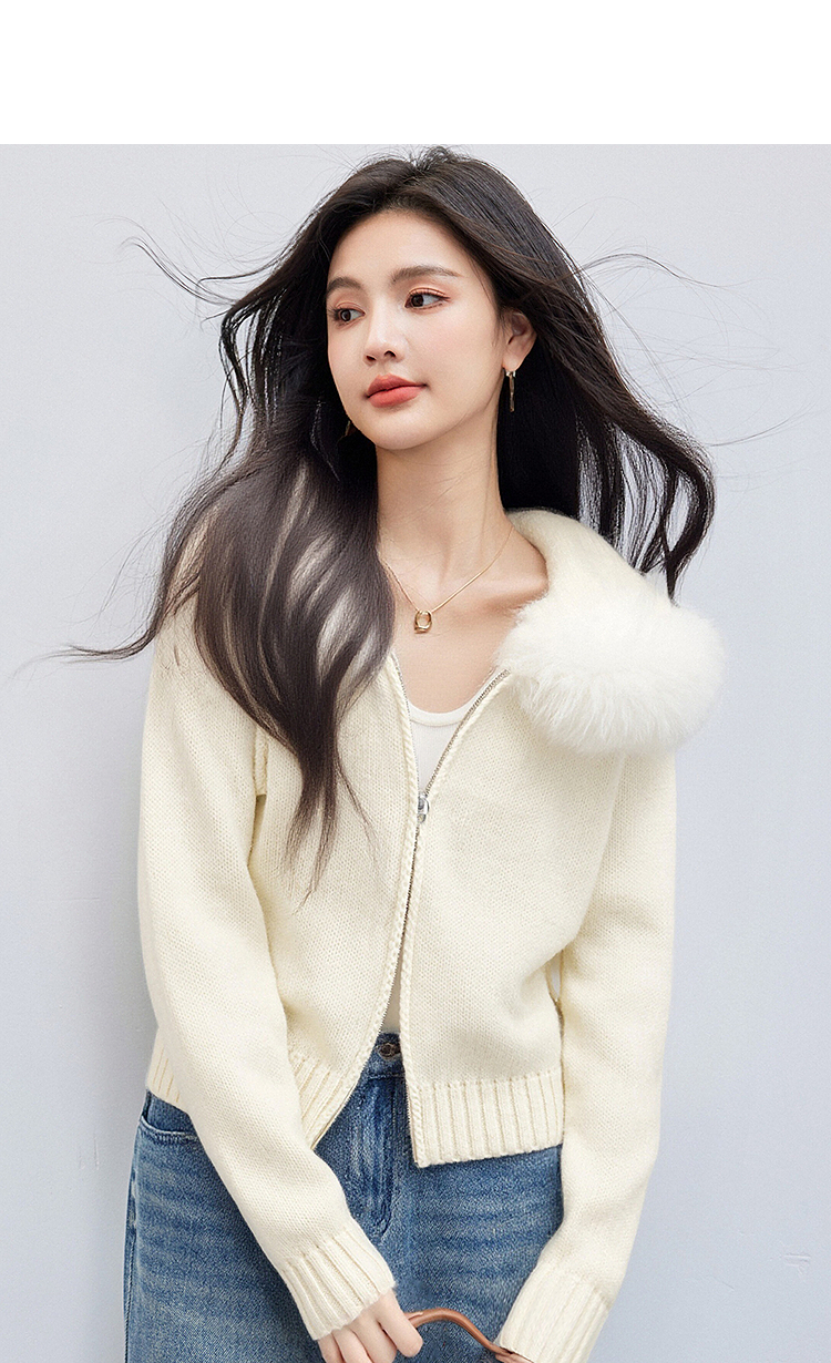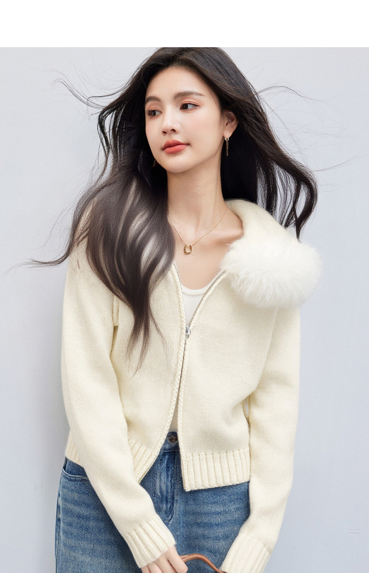 西遇白色连帽针织衫女冬季新款毛领双拉链短款毛衣外套SS051706