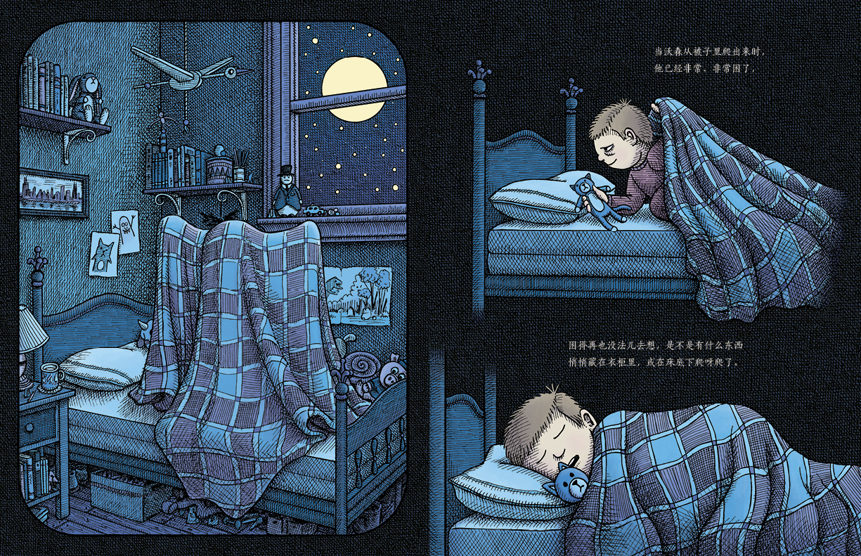 一个挣扎着入睡的男孩,在他的被窝里发现了一个充满了夜间冒险的世界。他晚上躺在床上睡不着,尽量不去想那些潜伏的、爬来爬去的东西,它们可能藏在他的衣橱里或床底下。但他越努力,就越难睡着。然后,他注意到从他的被子下面发出一束神秘的光。当他小便时,他发现了一个美丽的、帐篷般的夜空,布满了闪烁的星星。因为他不困,星星带着他穿过一片森林,开始了一场冒险,遇到了友好的生物,乘坐神奇的电车来到一个小岛上,那里有一座非常高的塔——最后,终于睡着了。