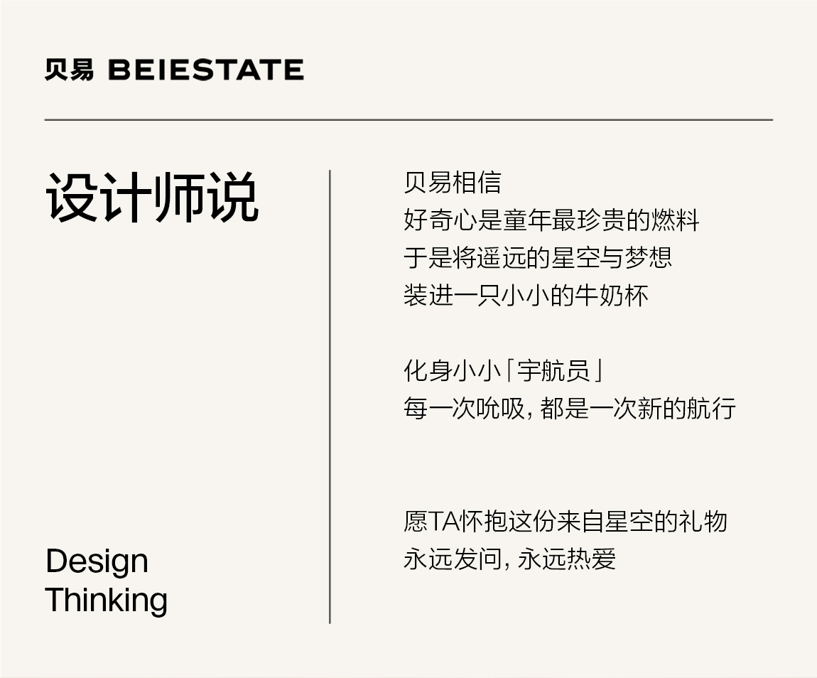 - 「BEIESTATE贝易」以极简设计为风格,主打兼顾设计、品 质和性价比的母婴产品,以创造极致细腻、不张扬、 不世俗的当代母婴用具,为用户日常亲子生活与幼儿 的启蒙早教提供新选择。