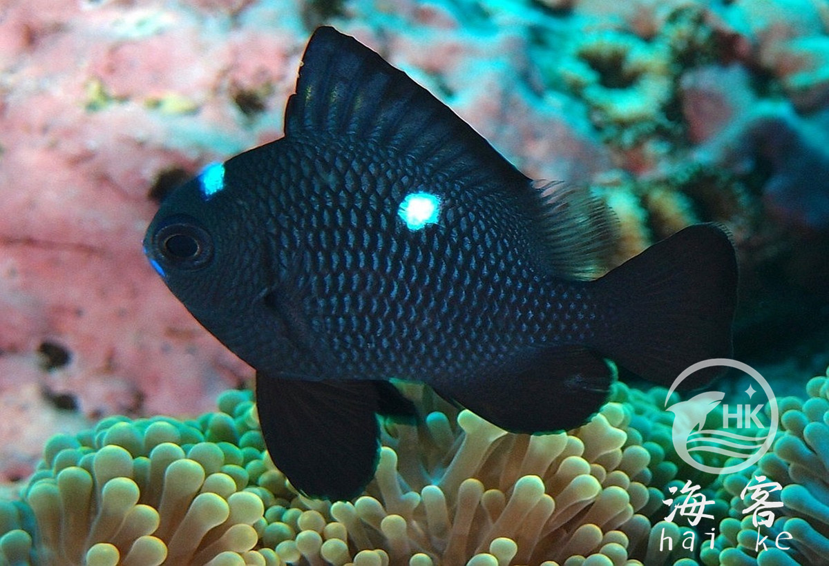 身体黑色,带有三个白色的点。成鱼后会很凶猛,白色斑点会消失,并开始与地毯海葵建立共生关系。