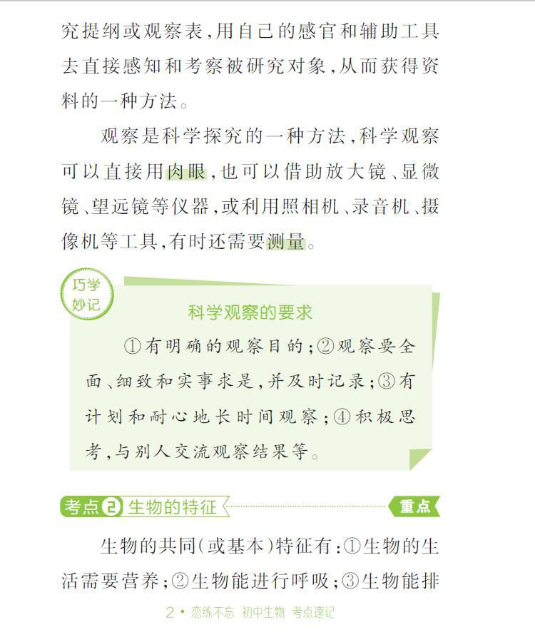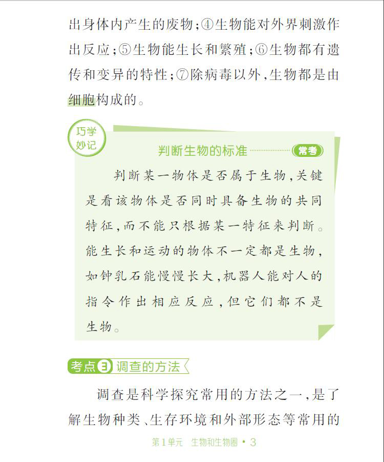 在目录设置上,本书按照统编初中生物学科的教材章节来设置,分为单元—章—考点三级,这样既能照顾正在学习的学生,也方便进入复习阶段的学生参照教材使用。