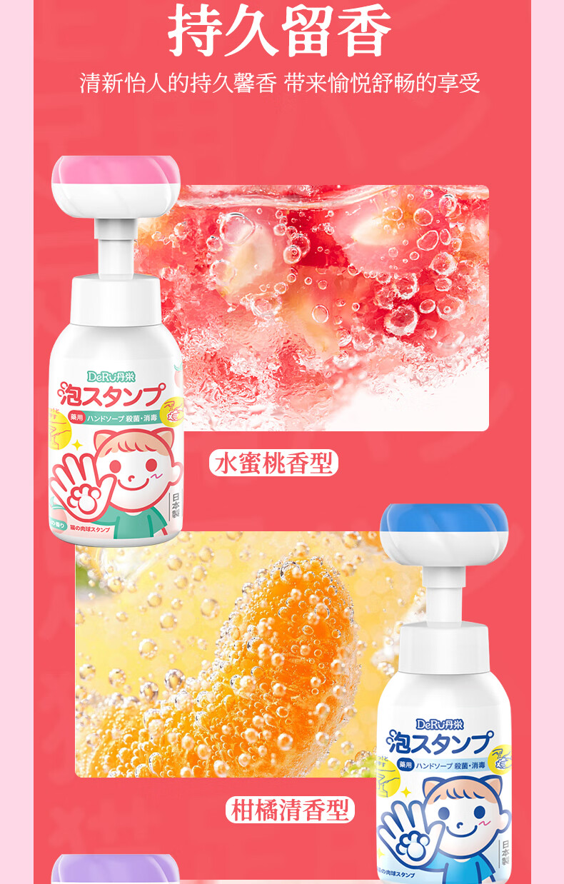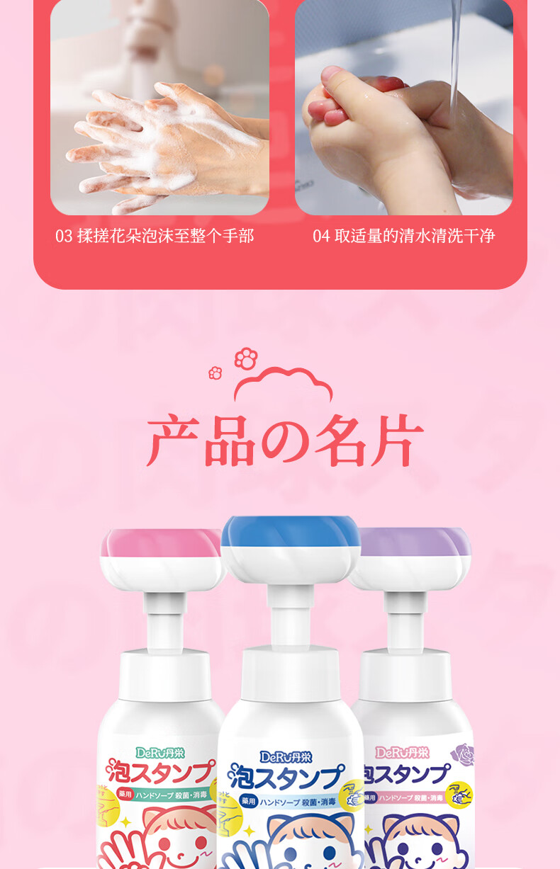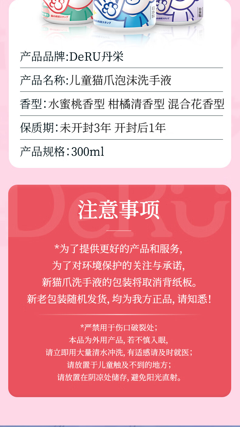 DeRU丹之荣 日本进口儿童猫爪泡泡洗手液花果香抗菌去污 300ml/瓶
