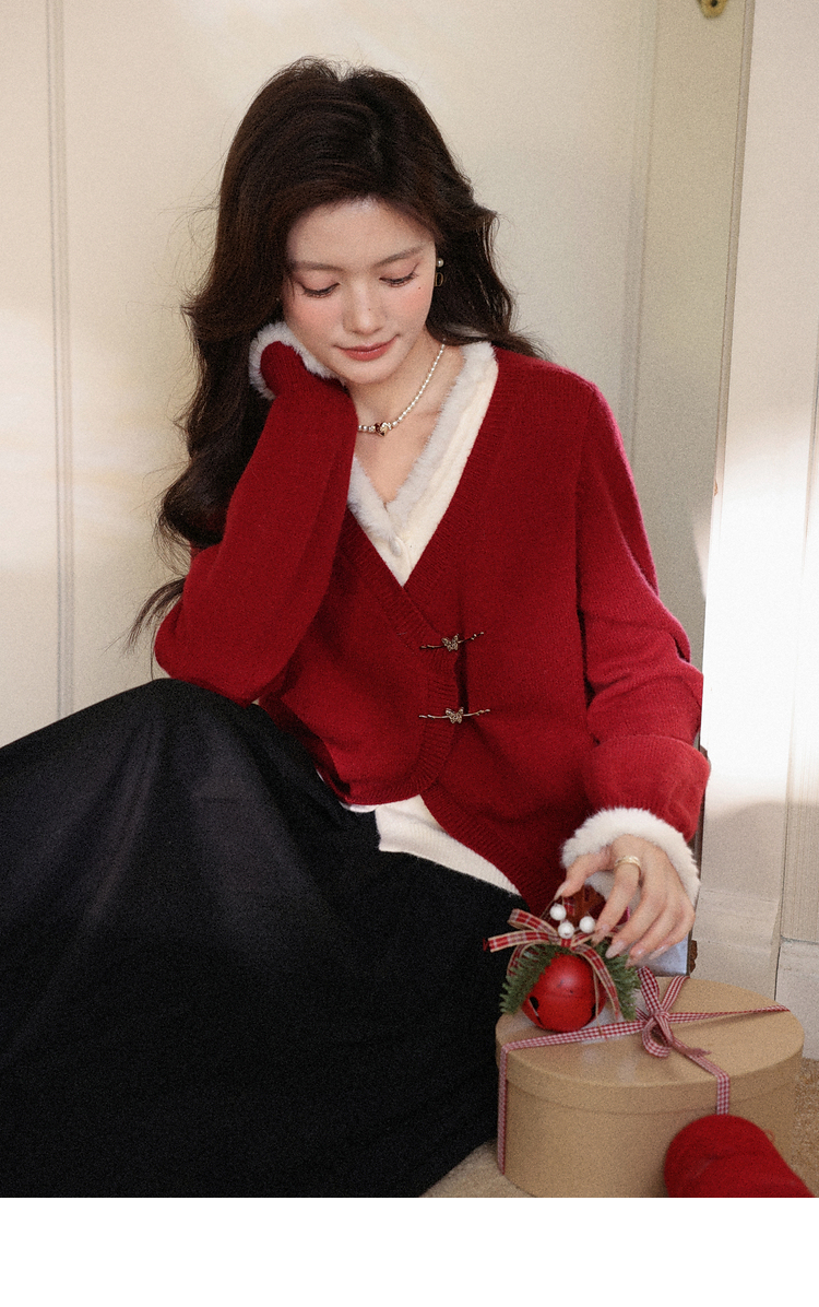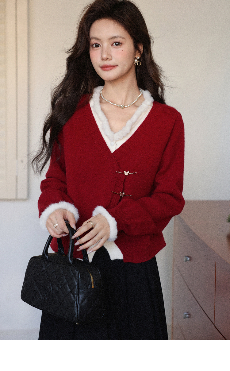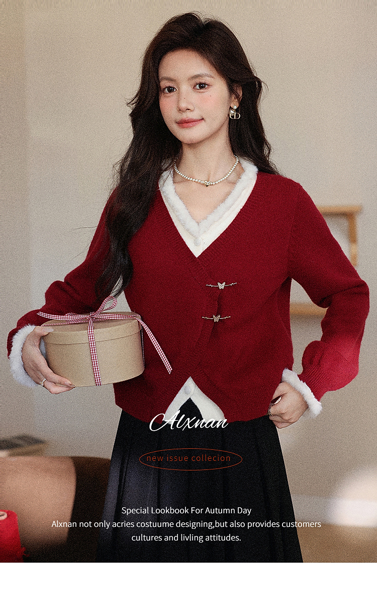 鹿向南「花辰夕月」假两件圣诞红色毛衣女秋冬设计感气质长袖上衣