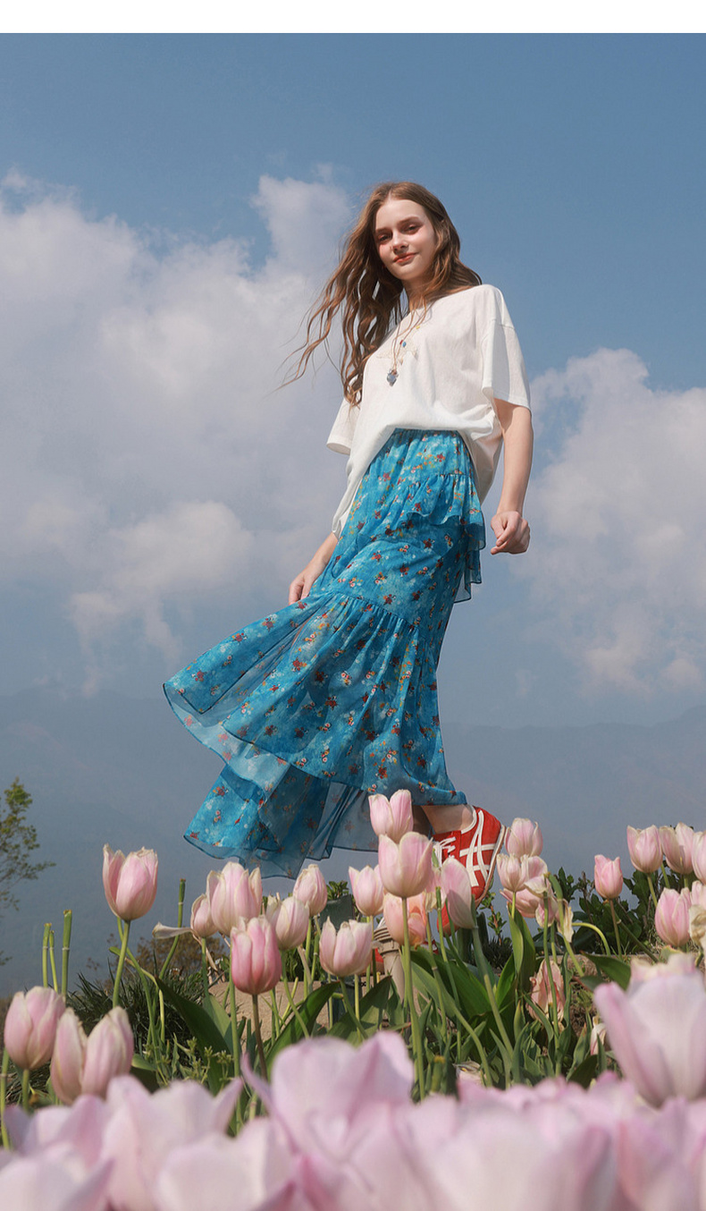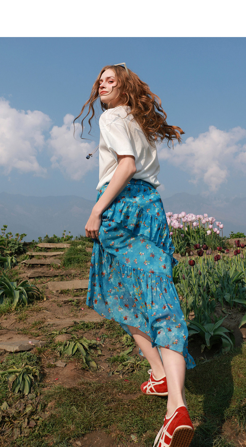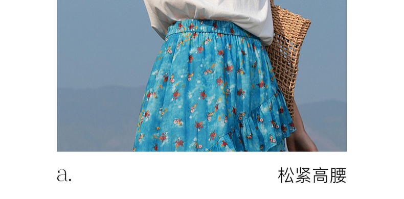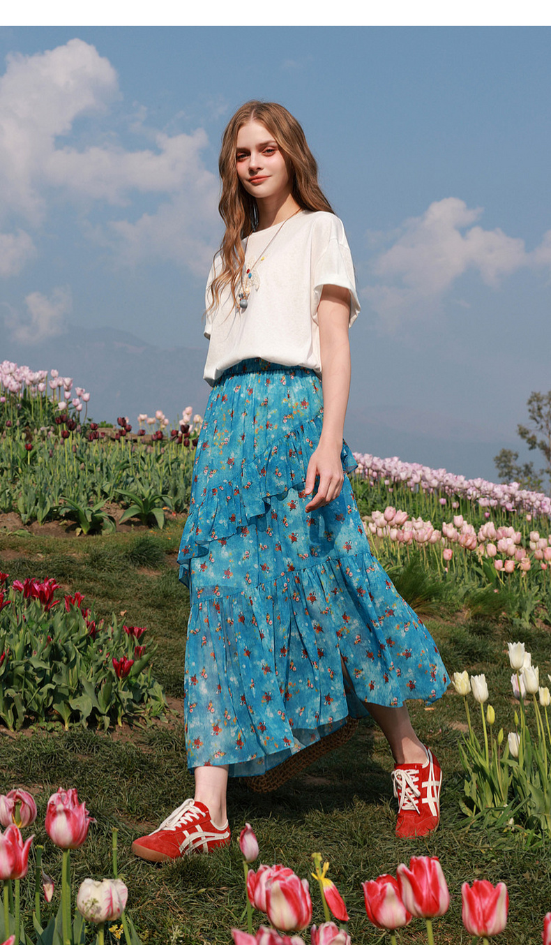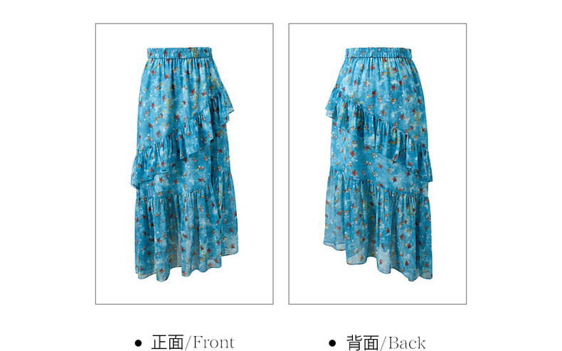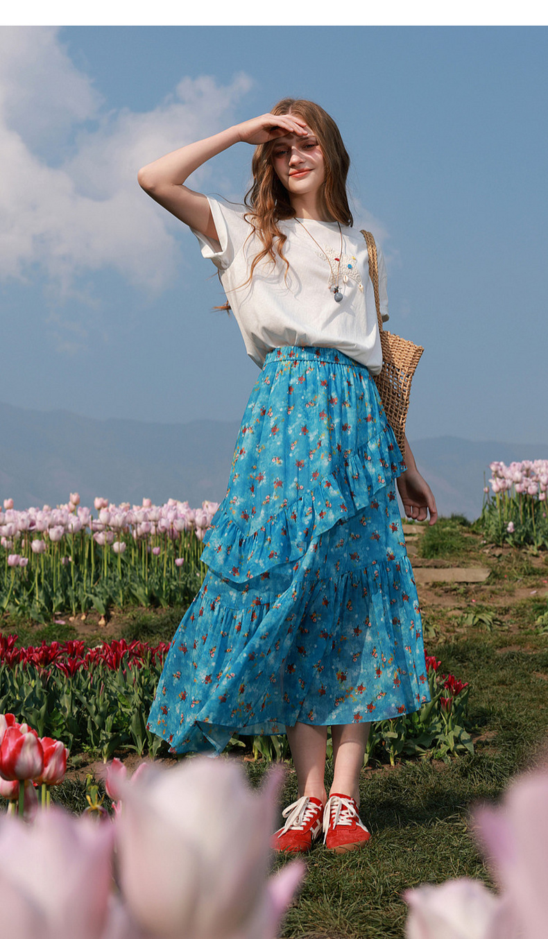 三彩2026夏季新款高腰半身裙印花荷叶边雪纺裙长裙A字裙显瘦M