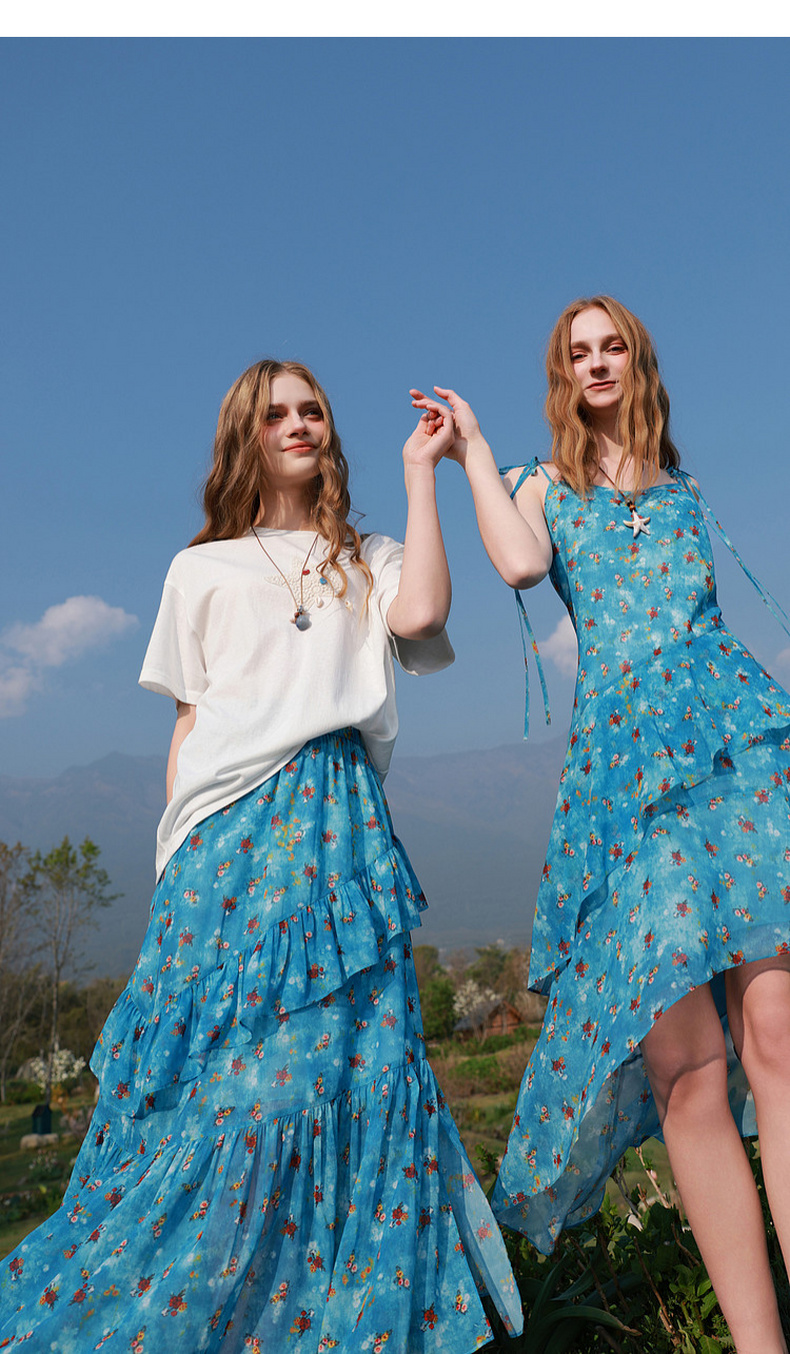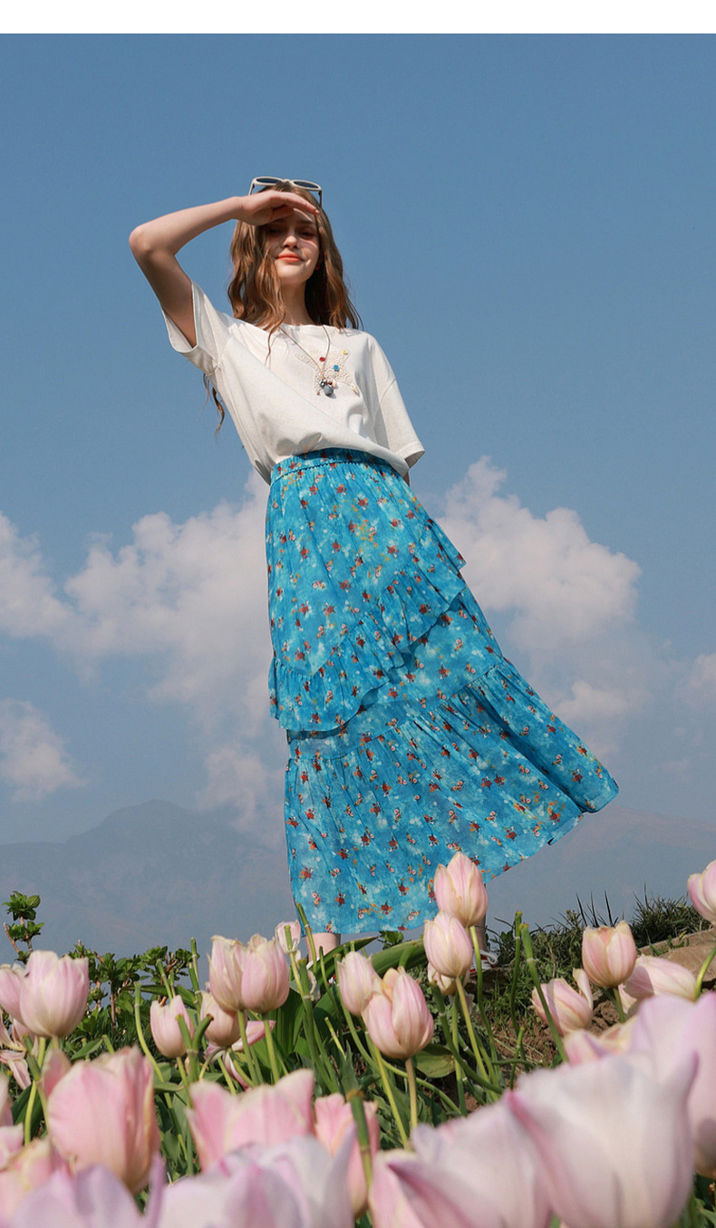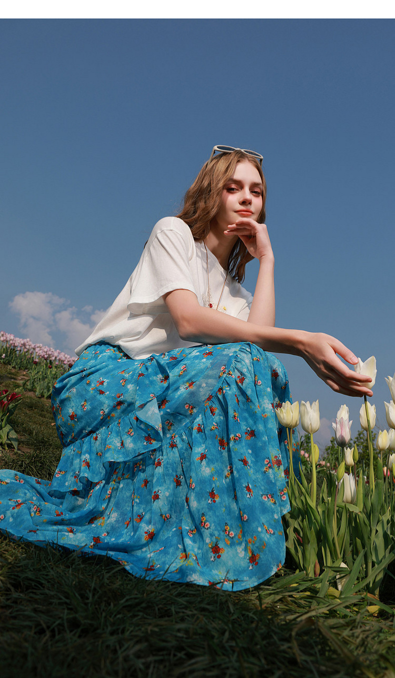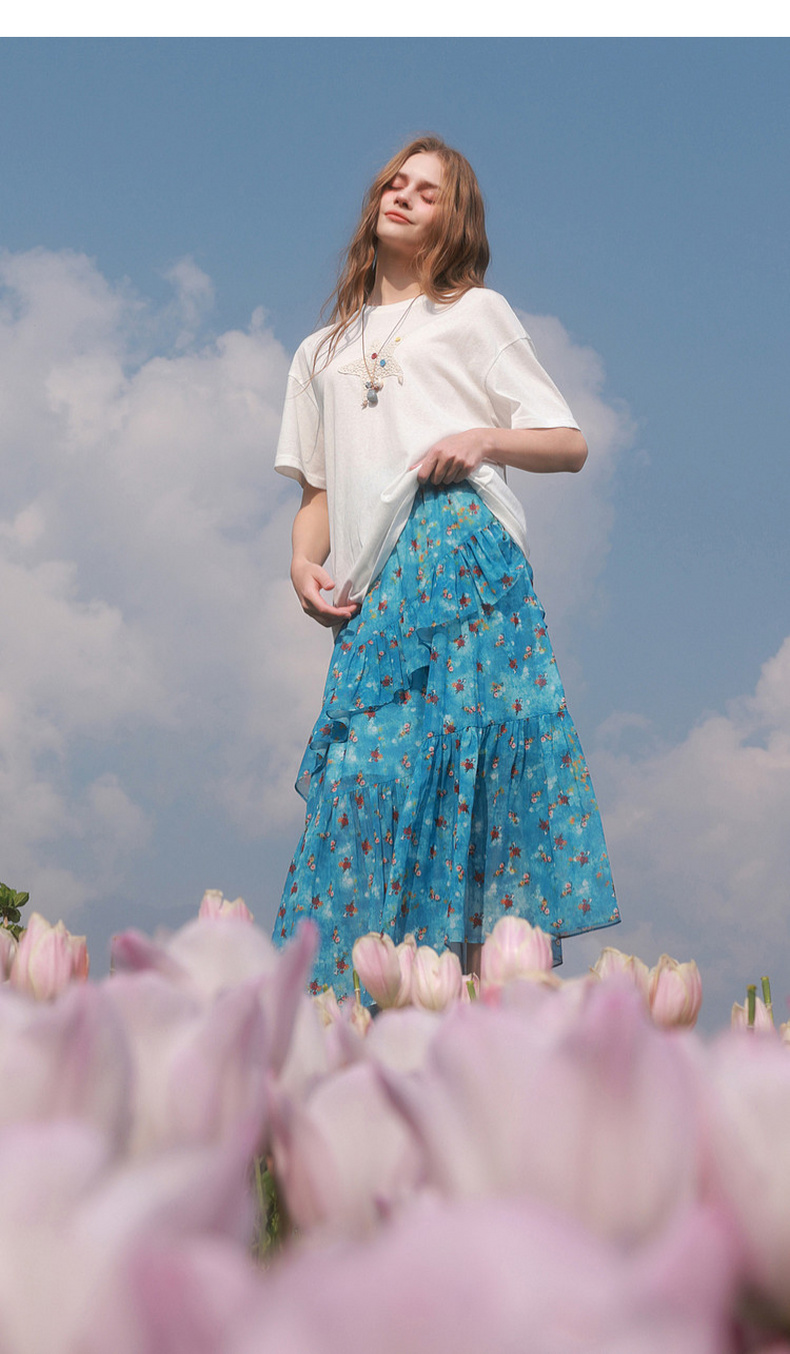 三彩2026夏季新款高腰半身裙印花荷叶边雪纺裙长裙A字裙显瘦M