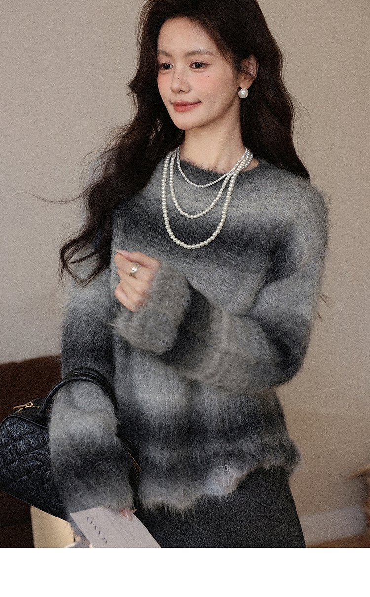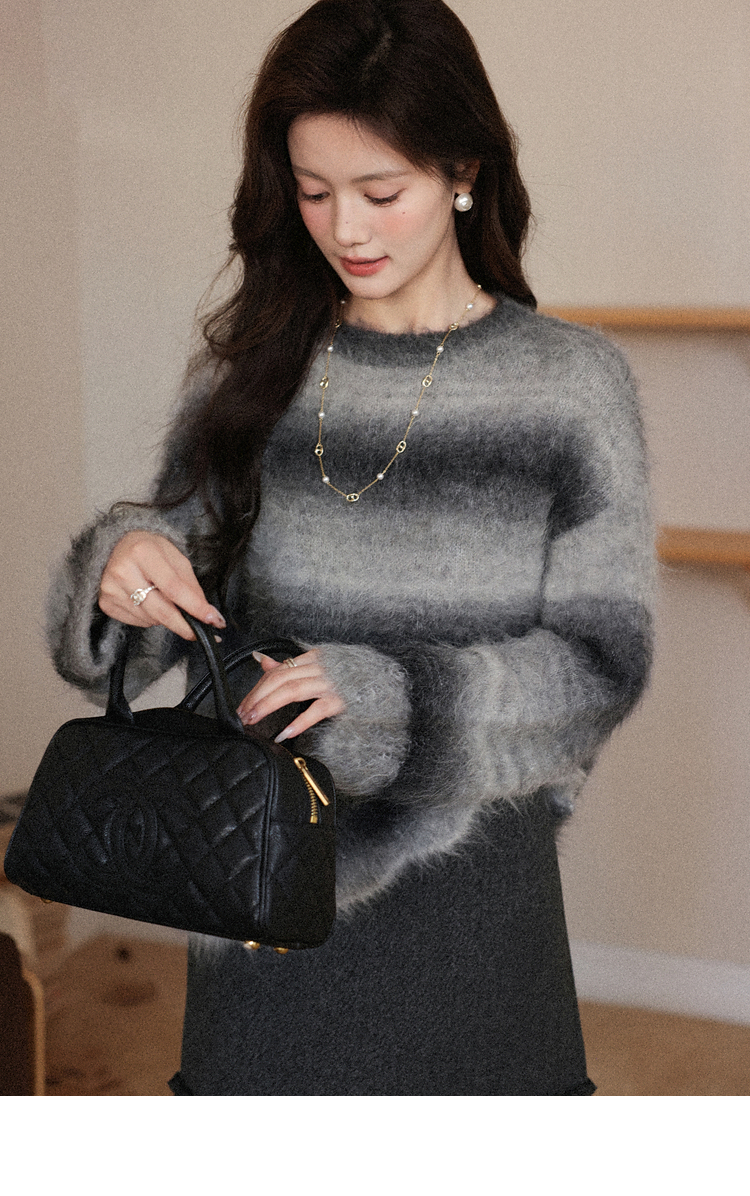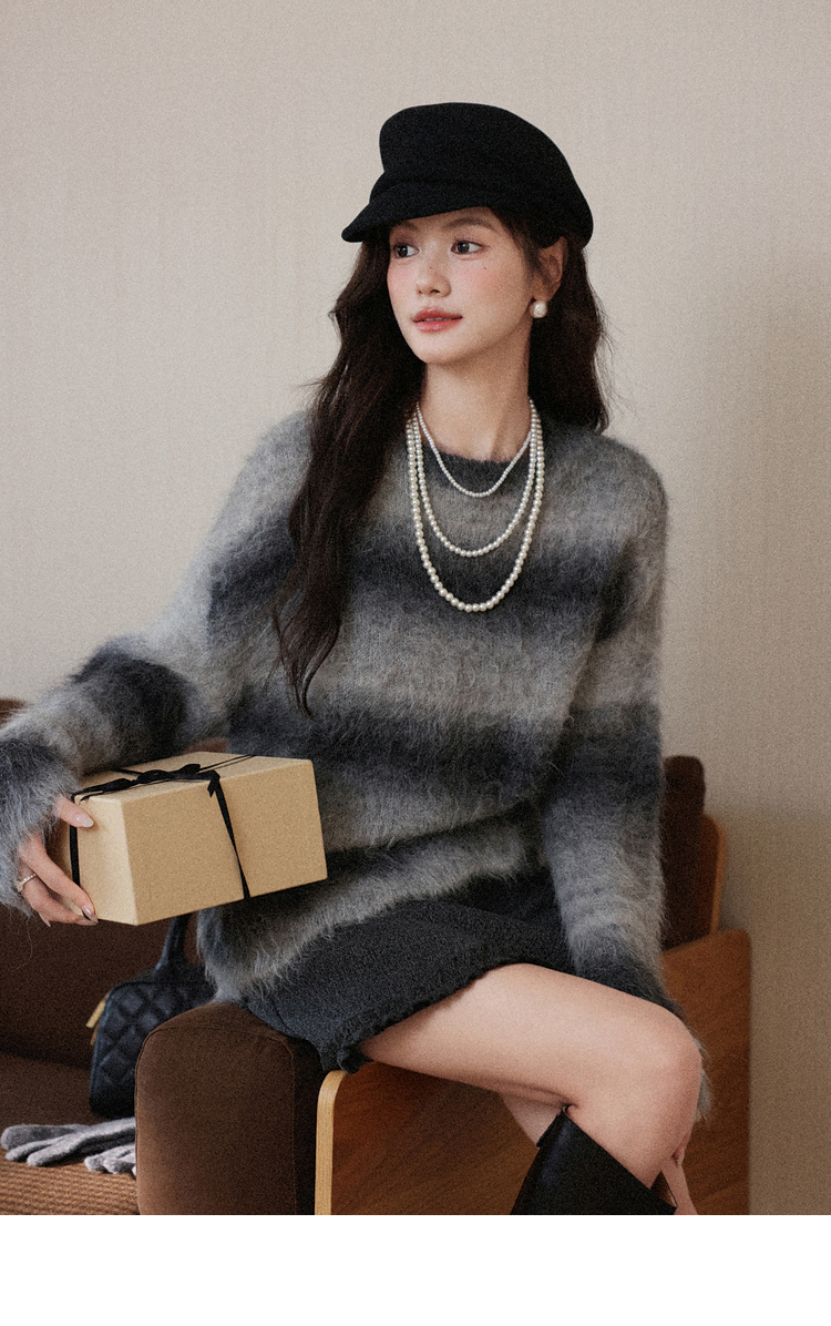 黑标鹿向南「古雅云海」深灰条纹绒毛慵懒感圆领毛衣女秋宽松上衣