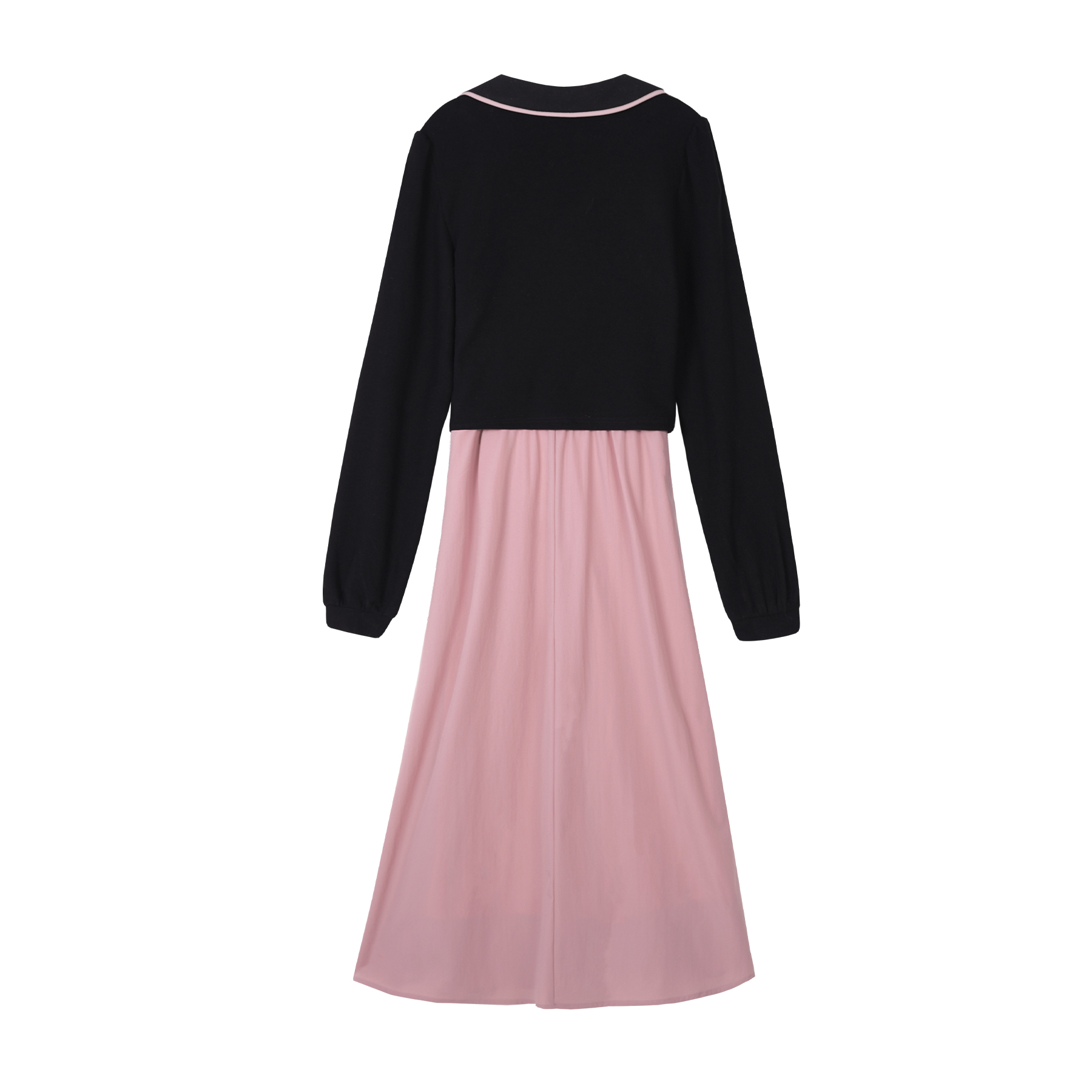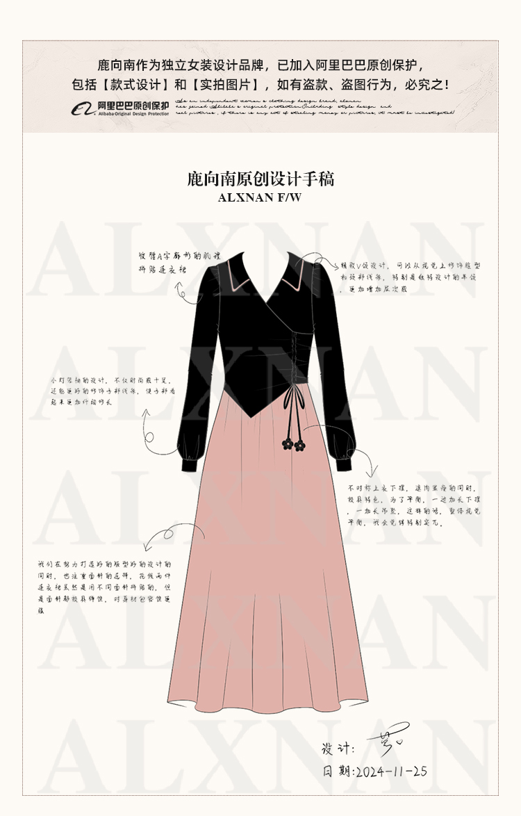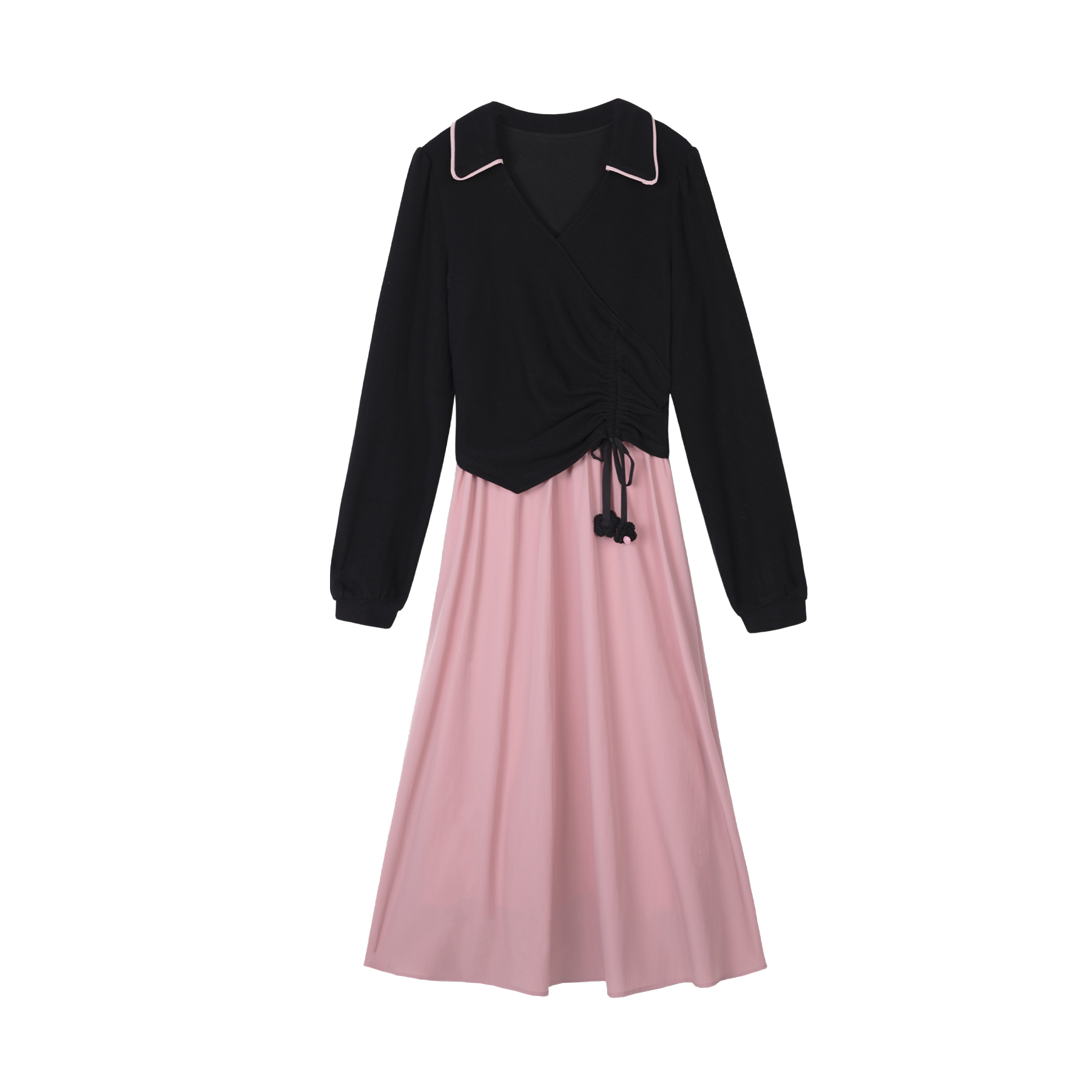 鹿向南「柏林邂逅」法式假两件V领连衣裙2024新款女秋冬显瘦裙子QYM002431