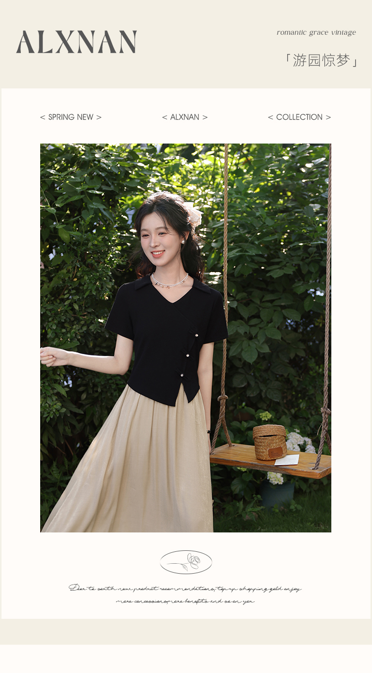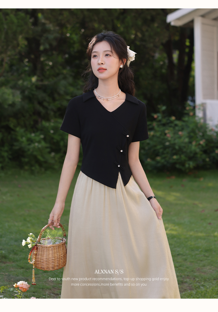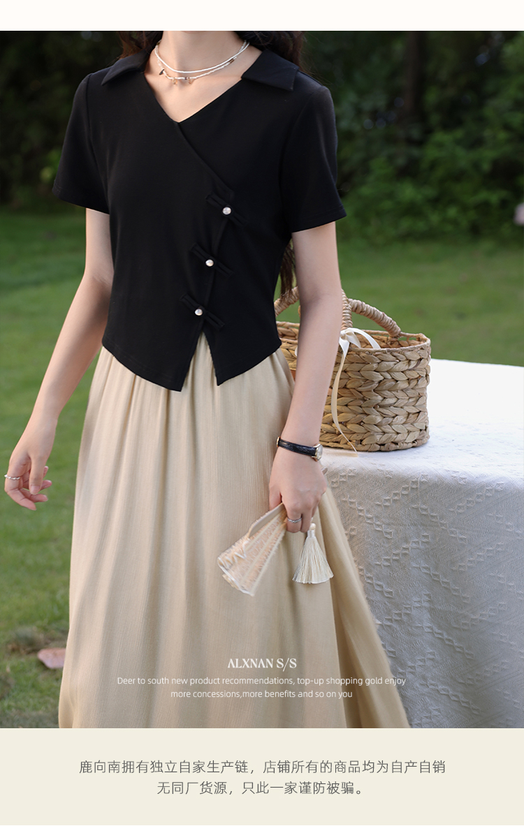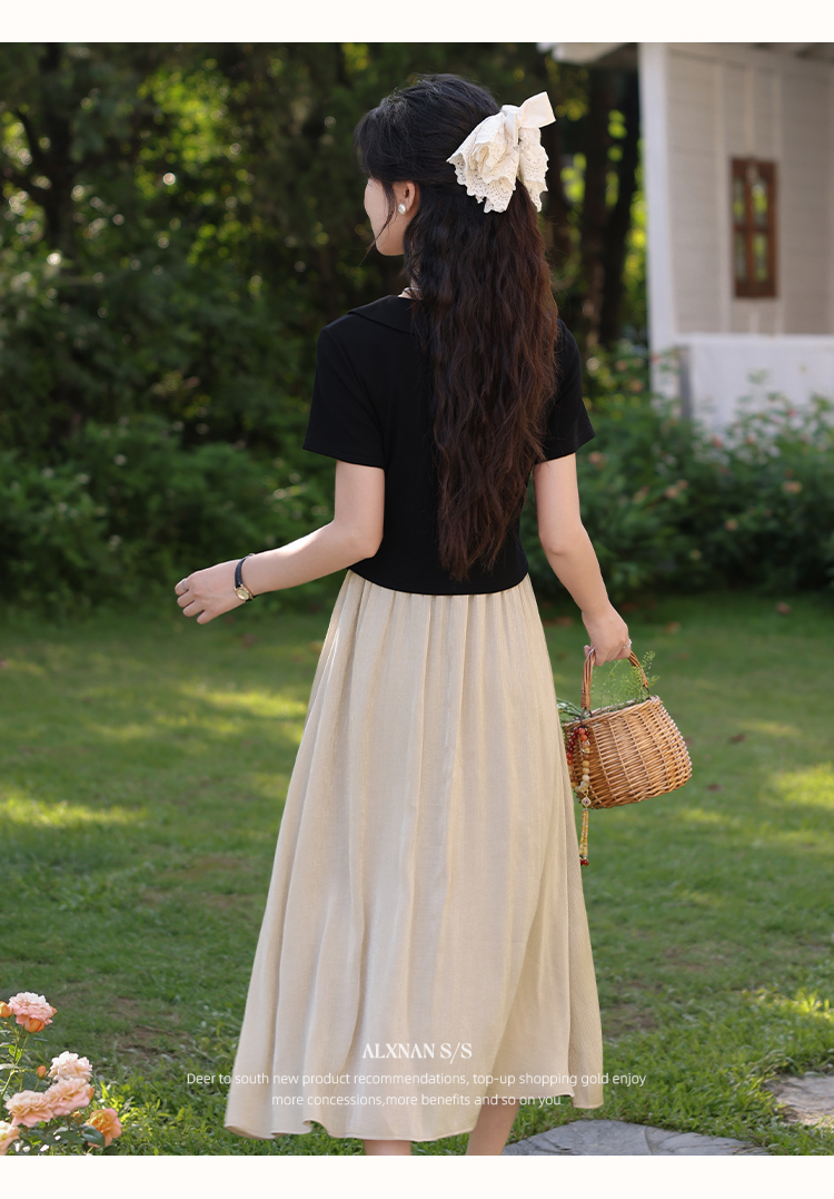 鹿向南「游园惊梦」气质假两件黑杏拼接短袖连衣长裙A字显瘦女夏