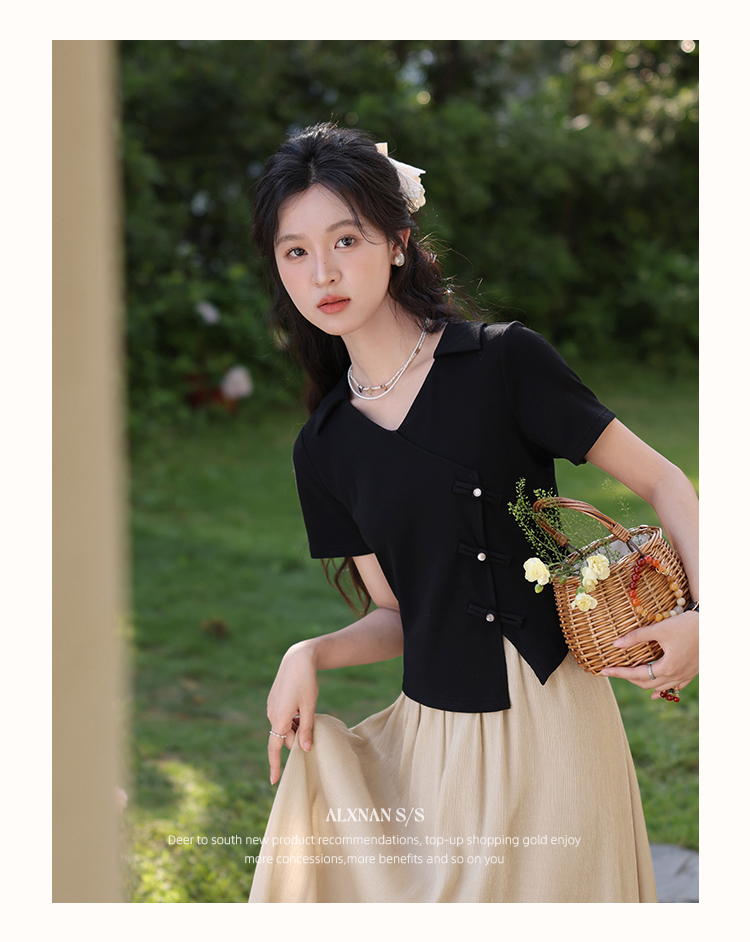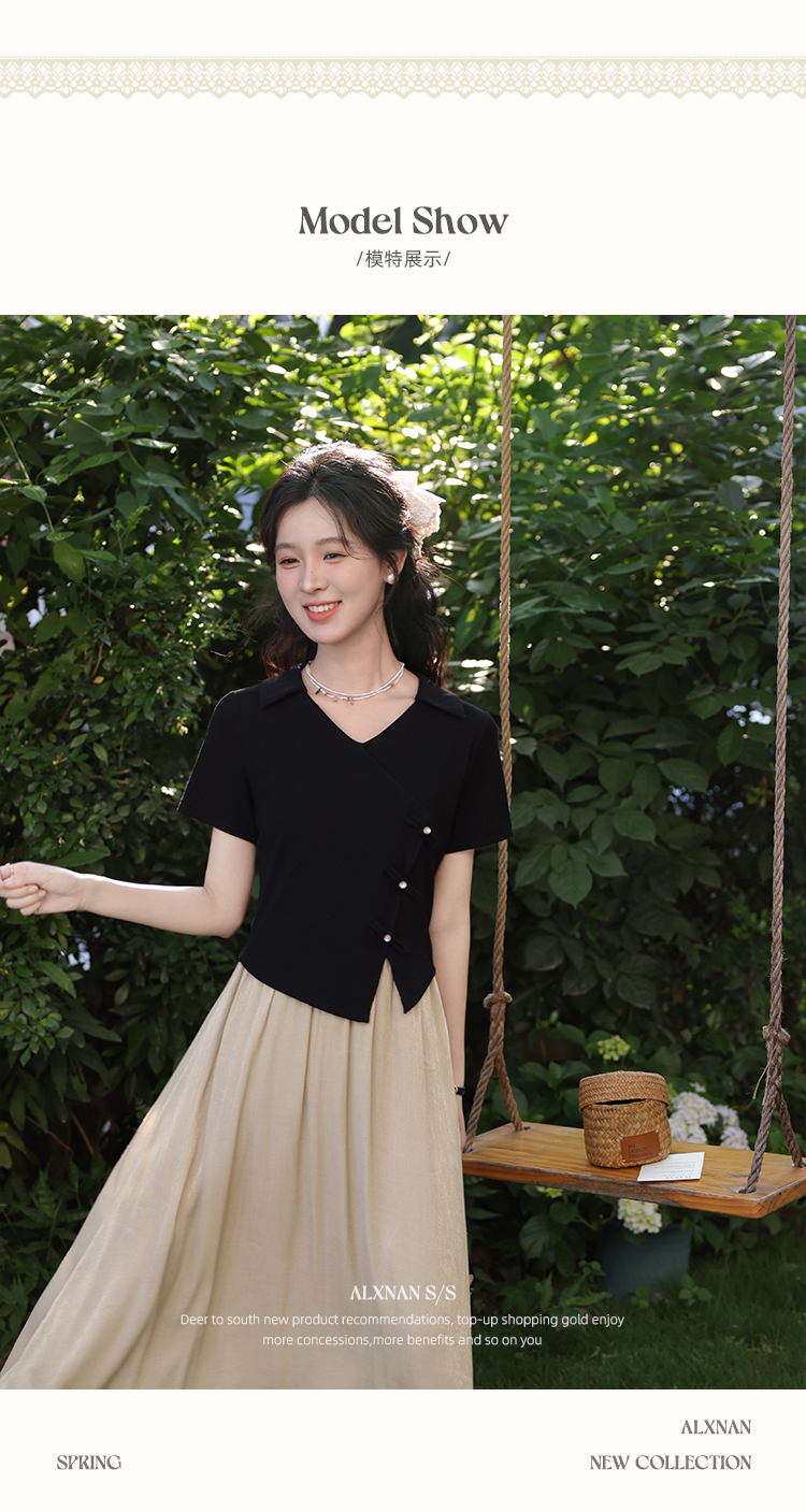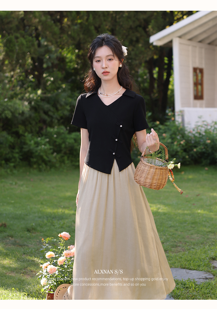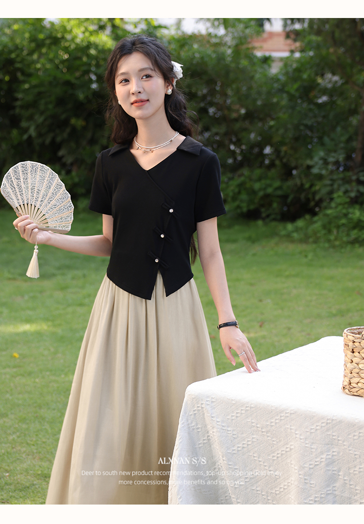 鹿向南「游园惊梦」气质假两件黑杏拼接短袖连衣长裙A字显瘦女夏