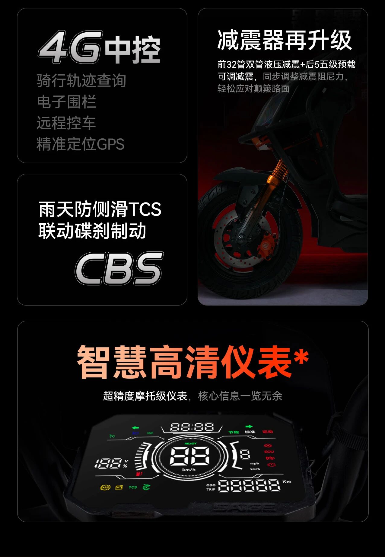 其他配置:4G蓝牙中控、电控坐垫锁板、液晶仪表