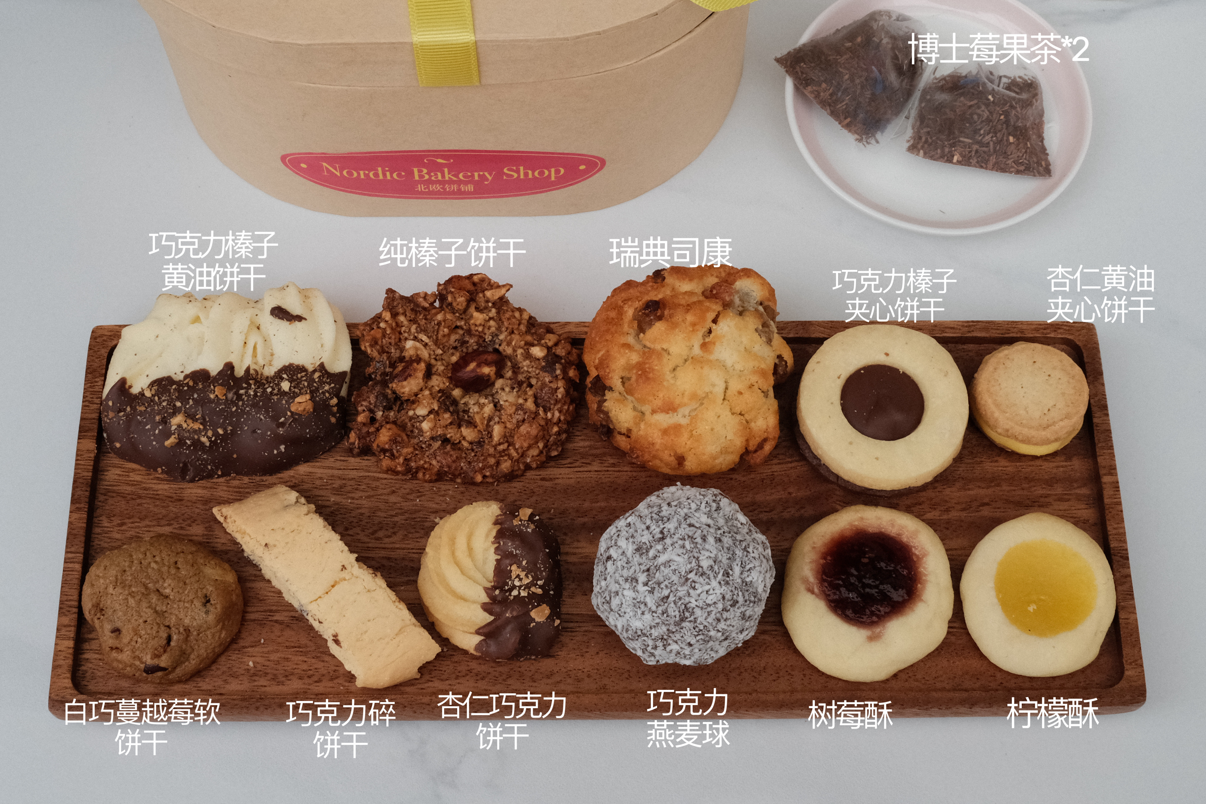 北欧饼铺的Fika礼盒包含:九块传统北欧手工饼干、一块瑞典司康、一个巧克力燕麦球以及两包瑞典路易波士莓果茶包。无论是与朋友、家人一起,还是独自享受,这个礼盒都非常适合营造一个惬意的Fika时光。