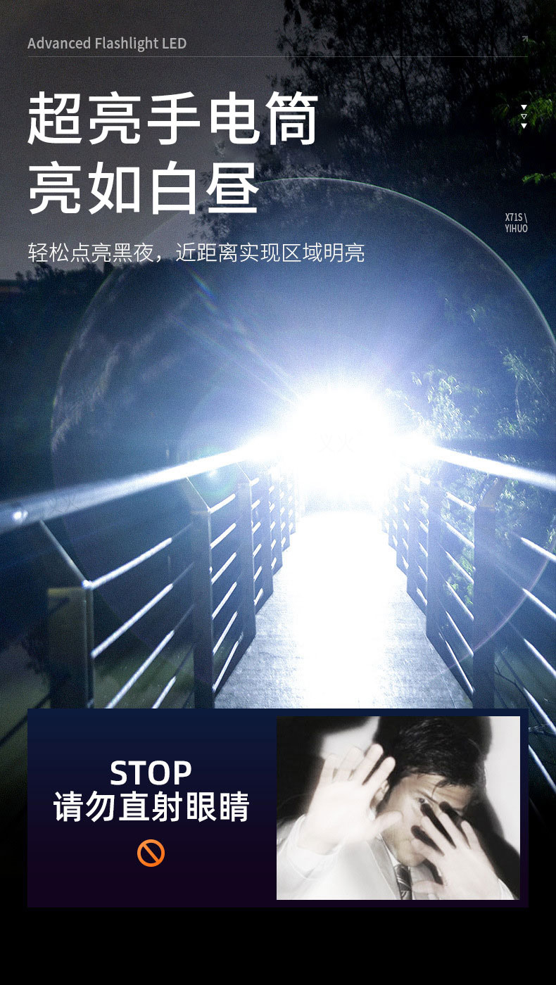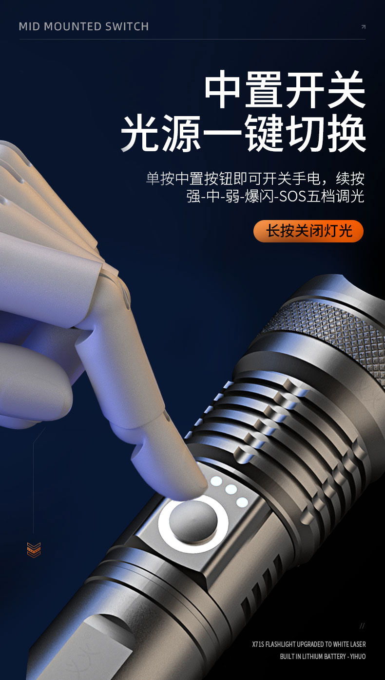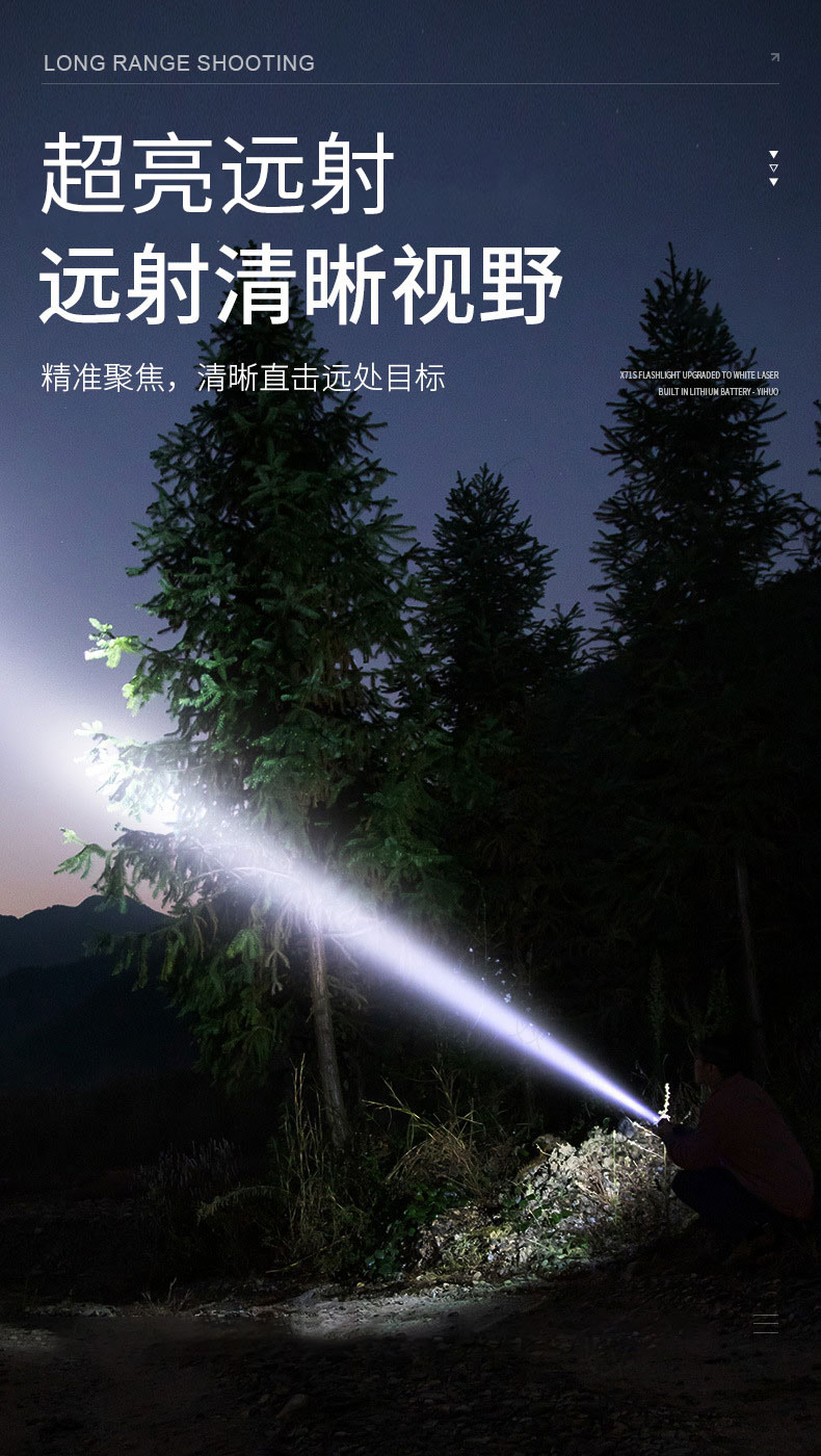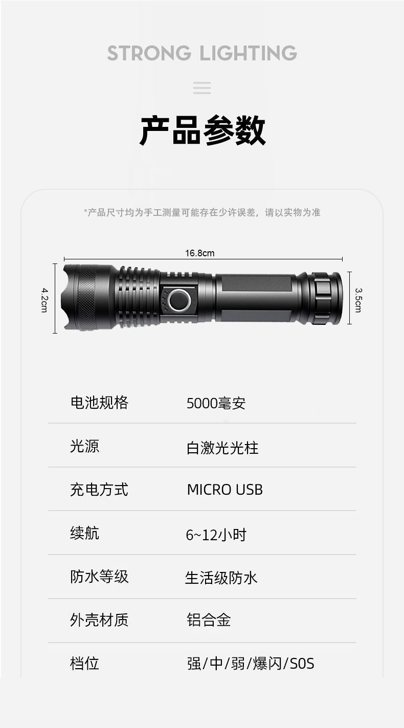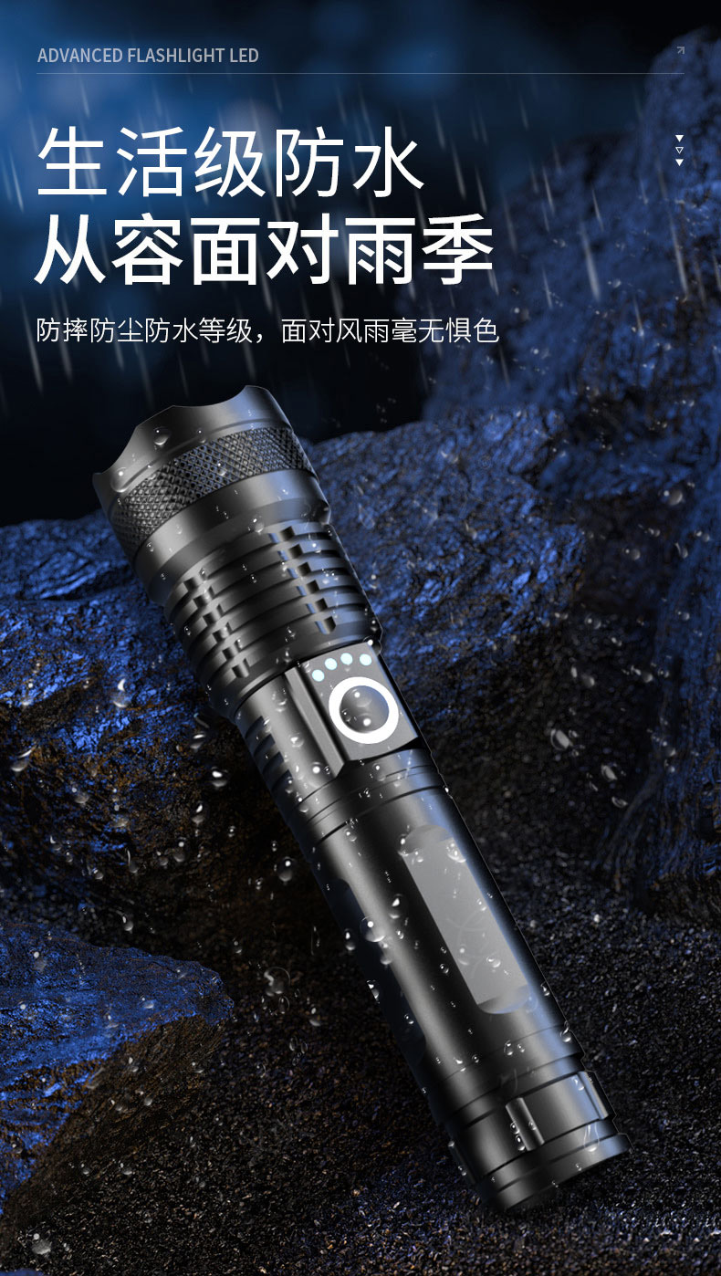 铝合金充电式强光手电筒 5000毫安长续航 超亮白光 可变焦 5种光源模式 亮如白昼