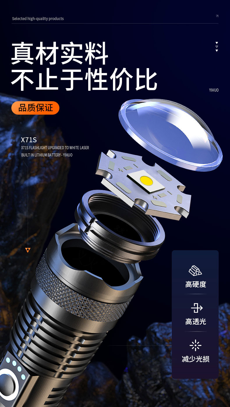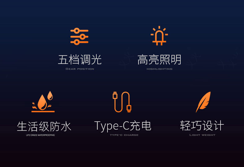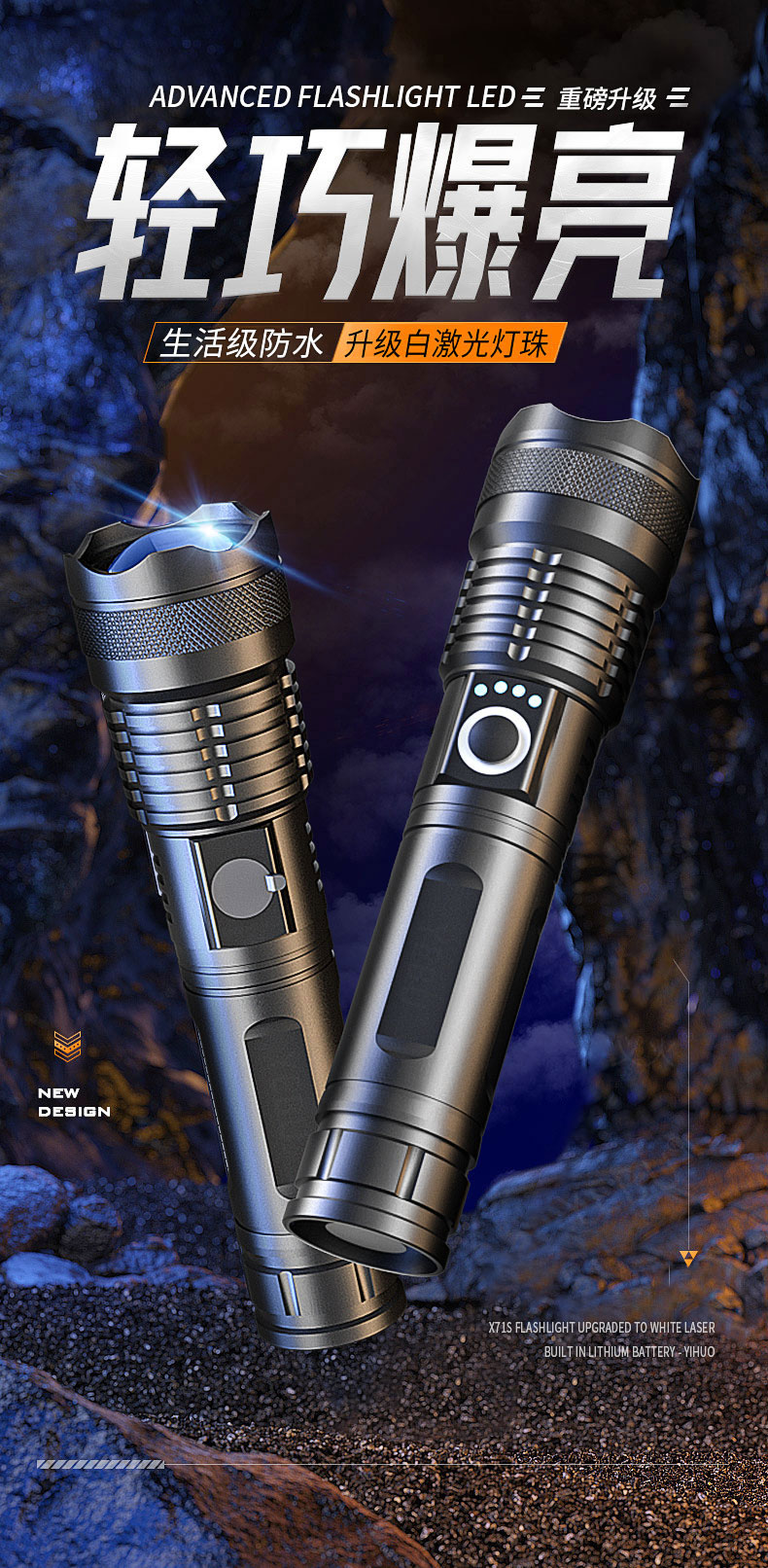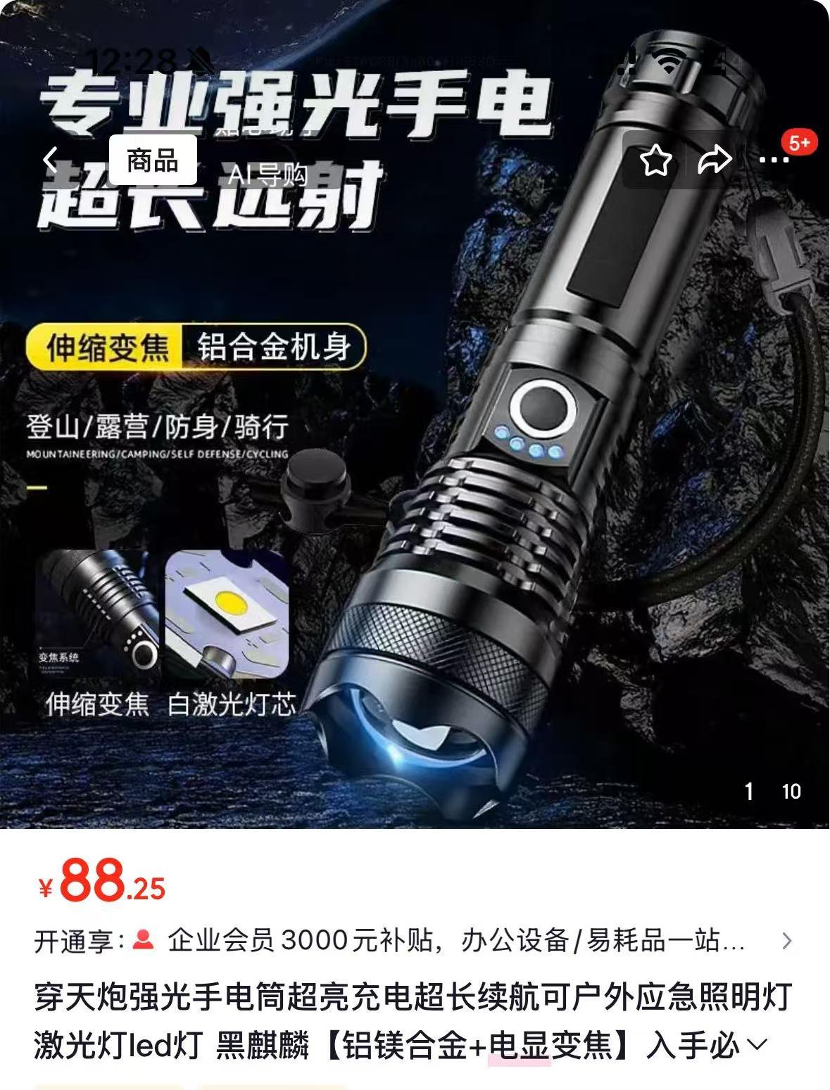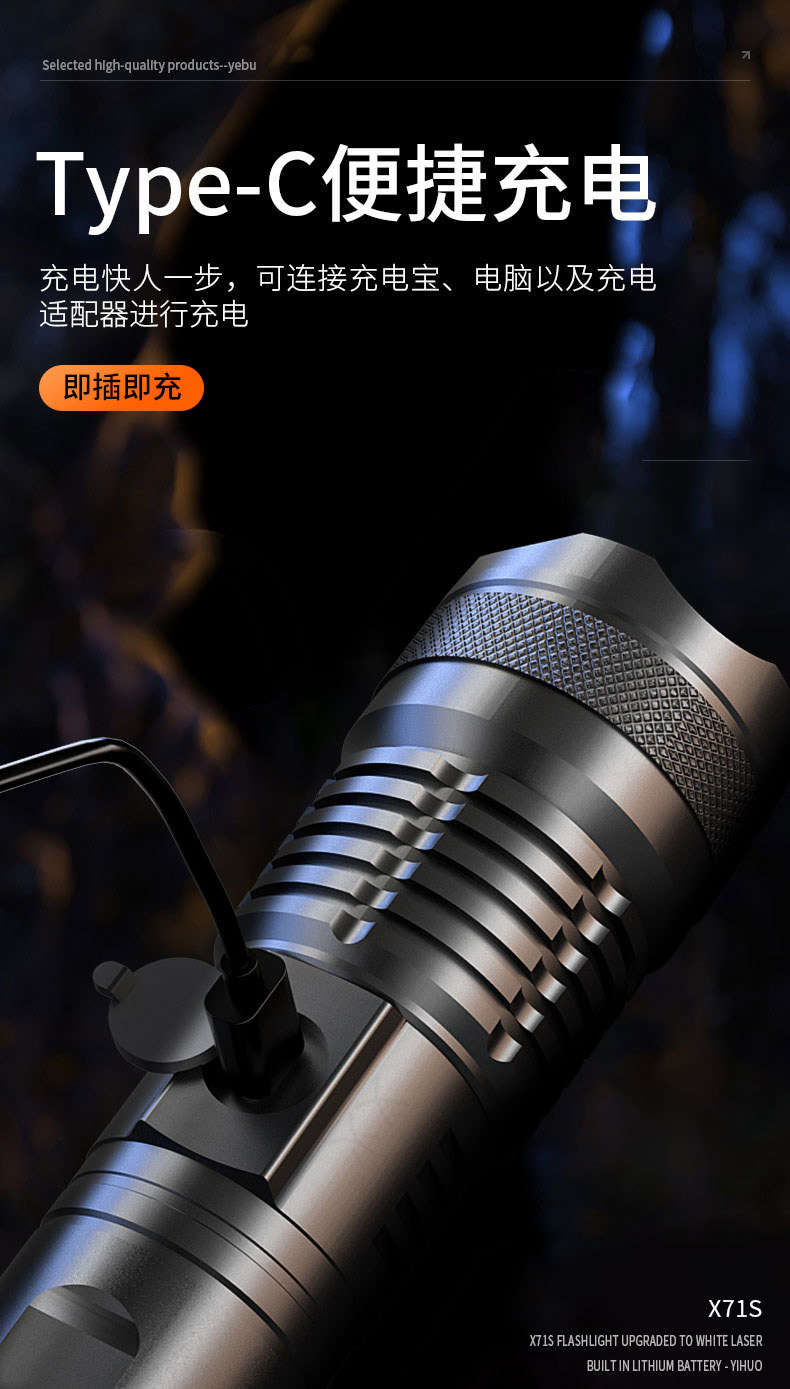 铝合金充电式强光手电筒 5000毫安长续航 超亮白光 可变焦 5种光源模式 亮如白昼