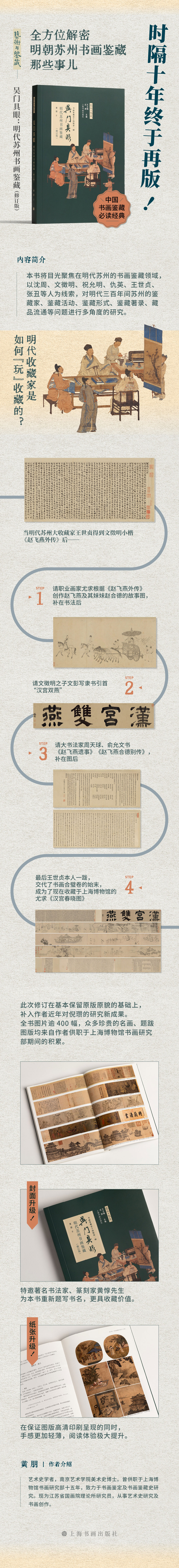 《吴门具眼:明代苏州书画鉴藏》首次出版于2015年,一经上市即以翔实的史料钩沉、藏品梳理、藏家交游的爬梳,以及众多难得一见的名画、题跋图版受到学界的广泛关注以及广大读者的支持。在不少高校最新开设的书画鉴定及鉴藏课程中,《吴门具眼》更是被列入了必读书单,被读者誉为“了解明代苏州书画鉴藏圈的最/佳读物”。甚至,在二手书市场上,本书的价格已被炒到了两到三倍。应广大读者对该书重版的强烈呼声,本社经过与作者黄朋女士的多番协商校订,终于推出了《吴门具眼:明代苏州书画鉴藏》(修订版)。此次修订在基本保留原版原貌的基础上,将作者黄朋女士近年的相关研究以及研究新成果补充进书中,增减了少量的图版;特邀著名书法家、篆刻家黄惇先生为本书重新题写封面书名,更具收藏价值;通过严格的成本把控,将定价从原版的288元调整至228元,希望有更多的读者、学子可以接触到这部优秀的书画鉴藏专著。【前言/序言】: