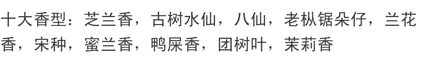 【产品名称】十大香型(芝兰香,古树水仙,八仙,老锯朵仔,兰花香,宋种,蜜兰香,鸭屎香,团树叶,茉莉香)