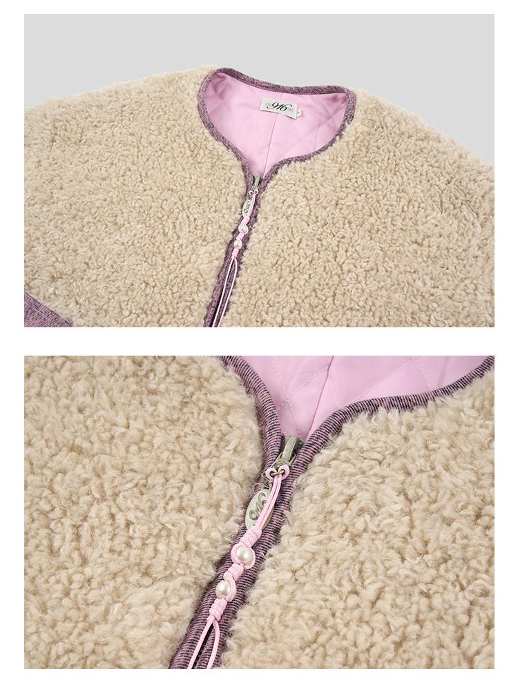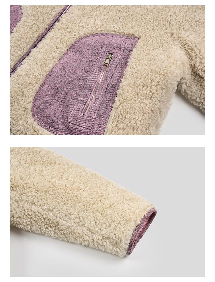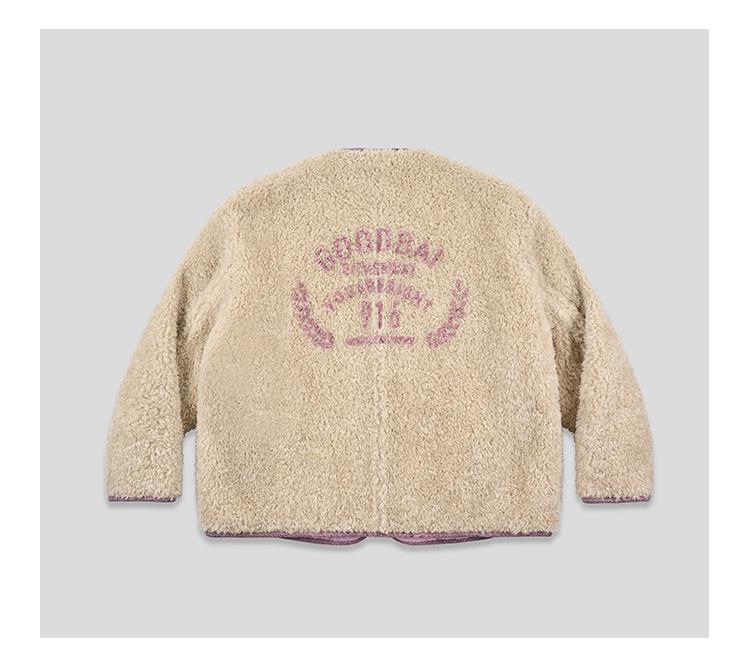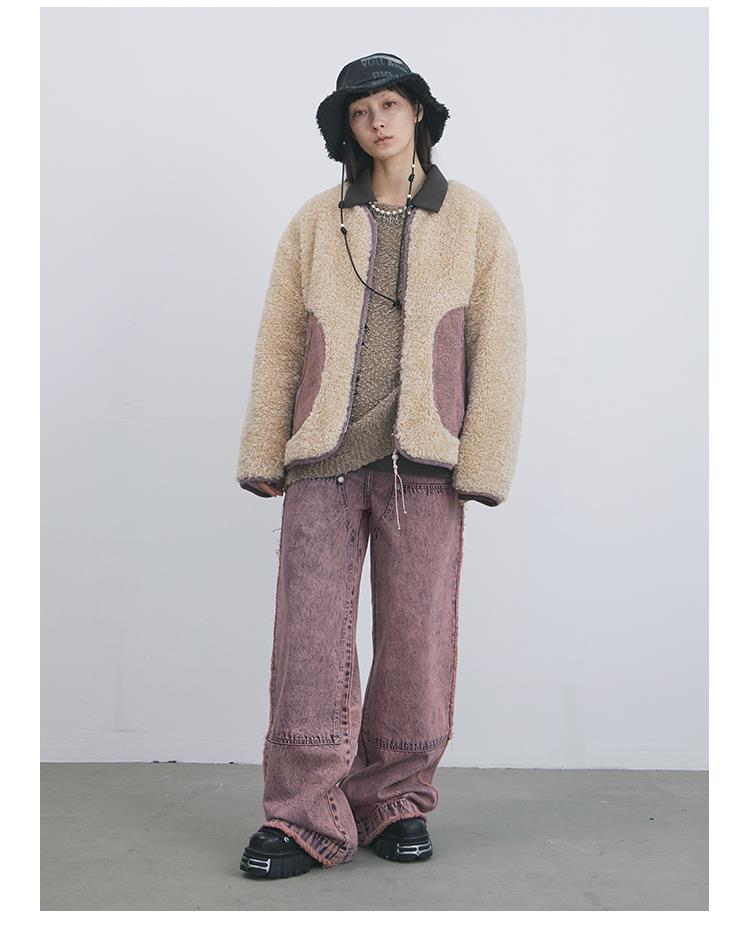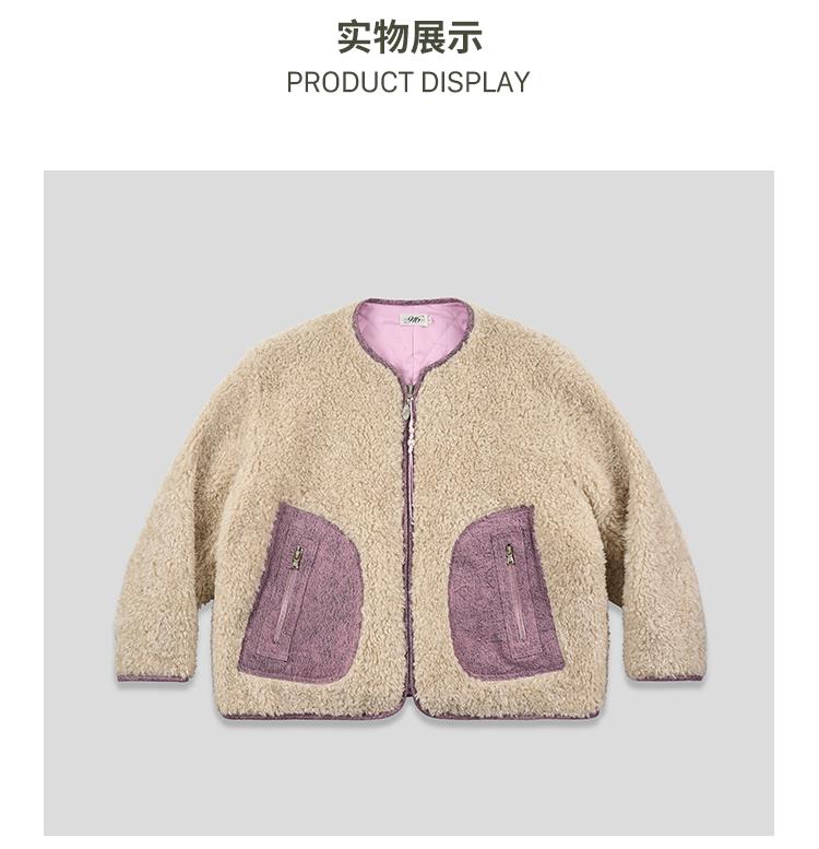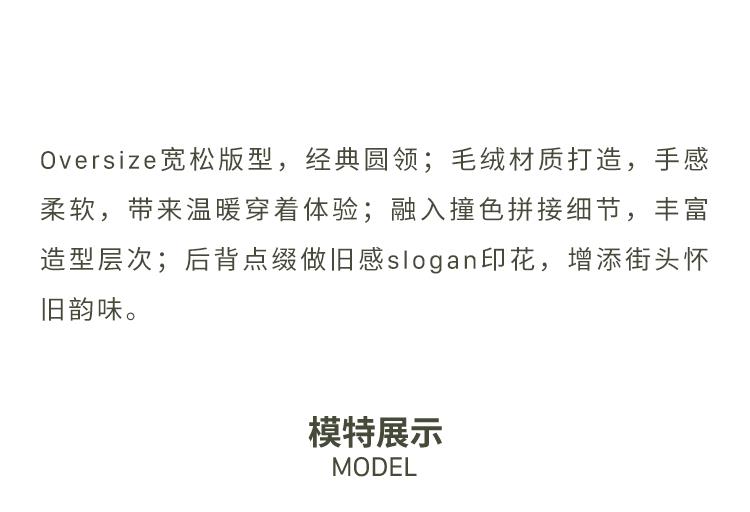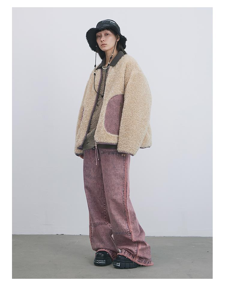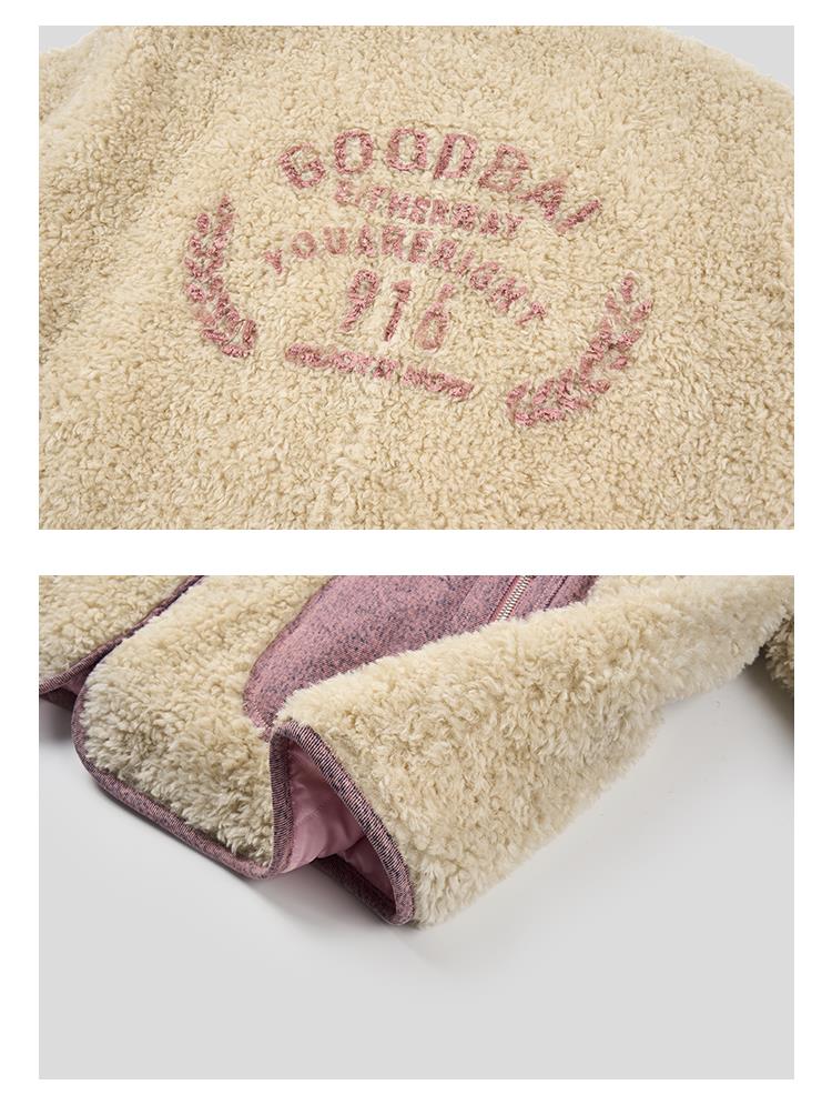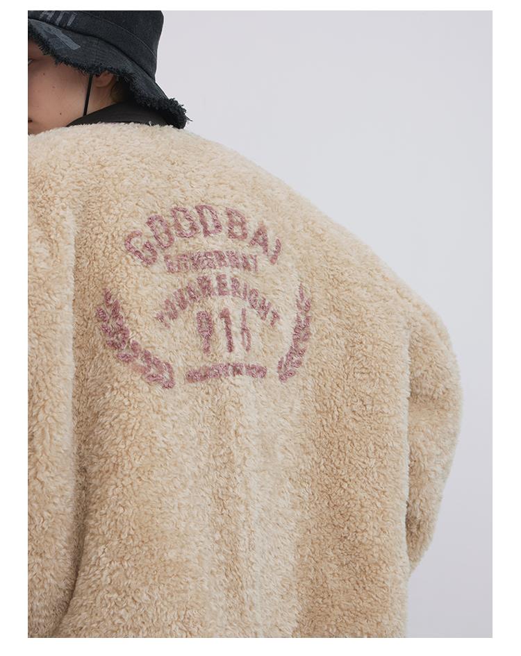GOODBAI 916 slogan做旧印花拼接oversize圆领仿羊羔绒外套