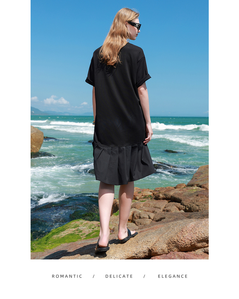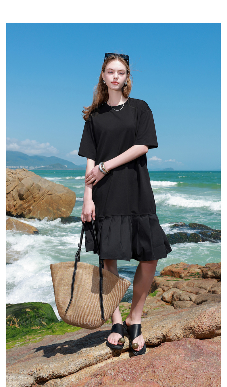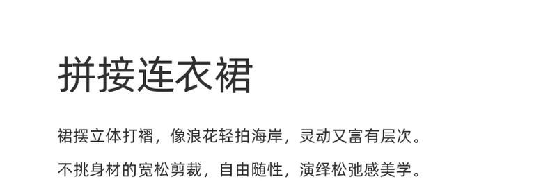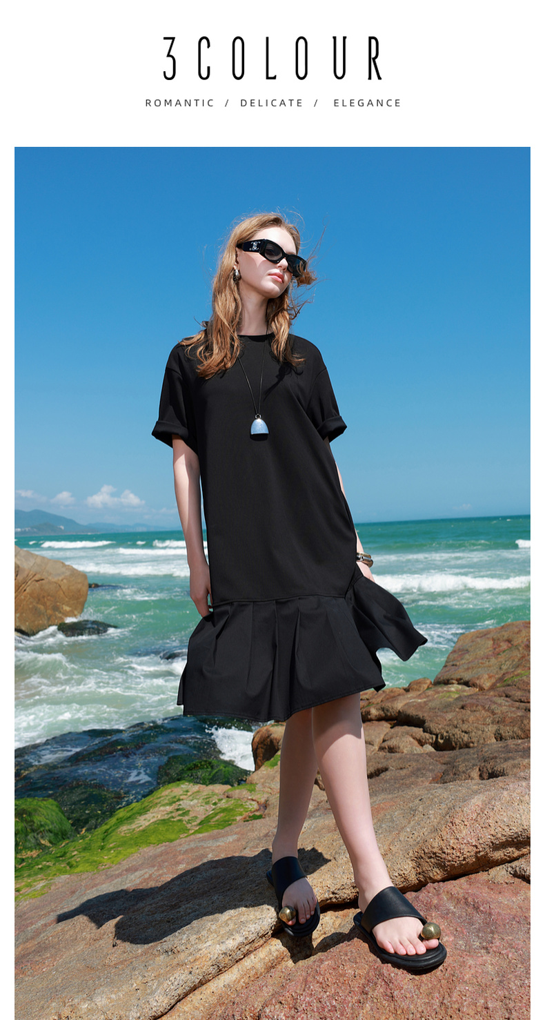 三彩2025夏季新款拼接连衣裙宽松落肩袖直筒裙中裙休闲M