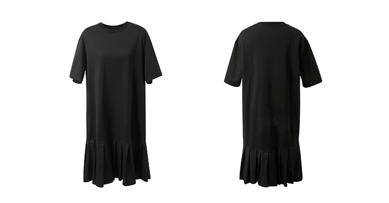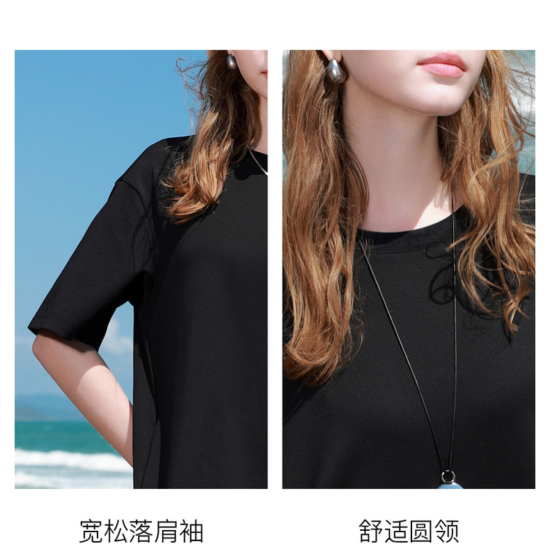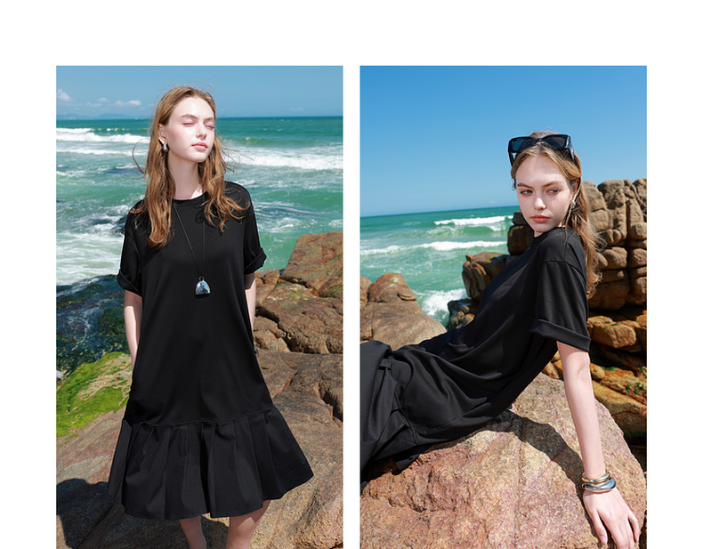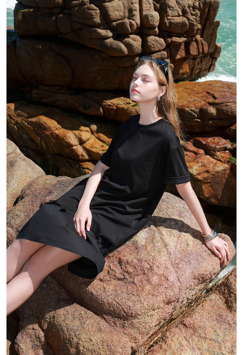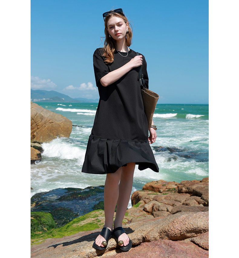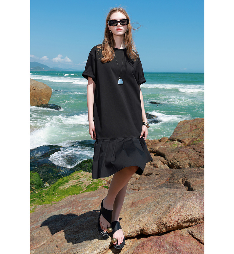 三彩2025夏季新款拼接连衣裙宽松落肩袖直筒裙中裙休闲M