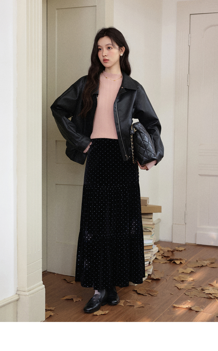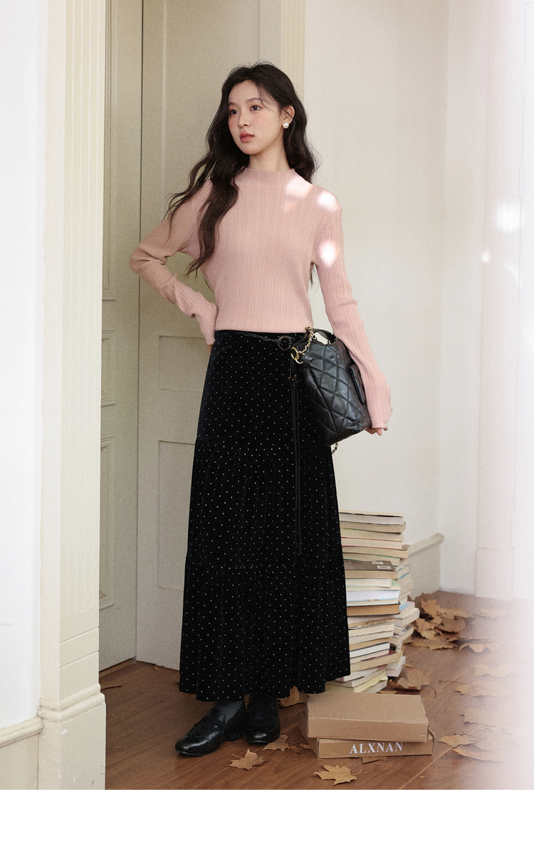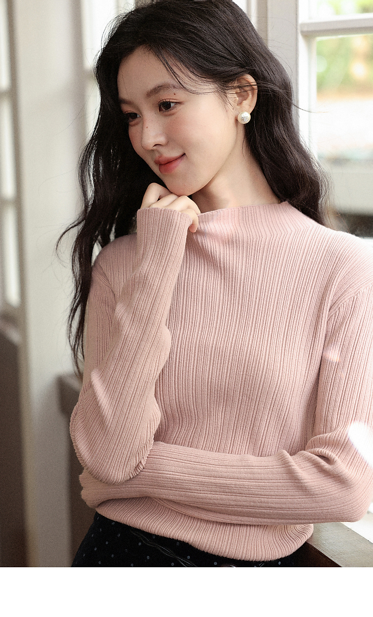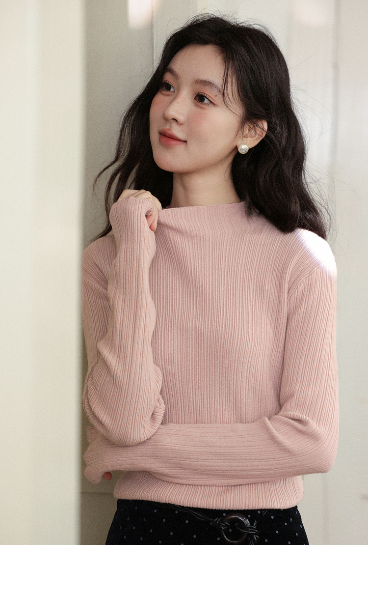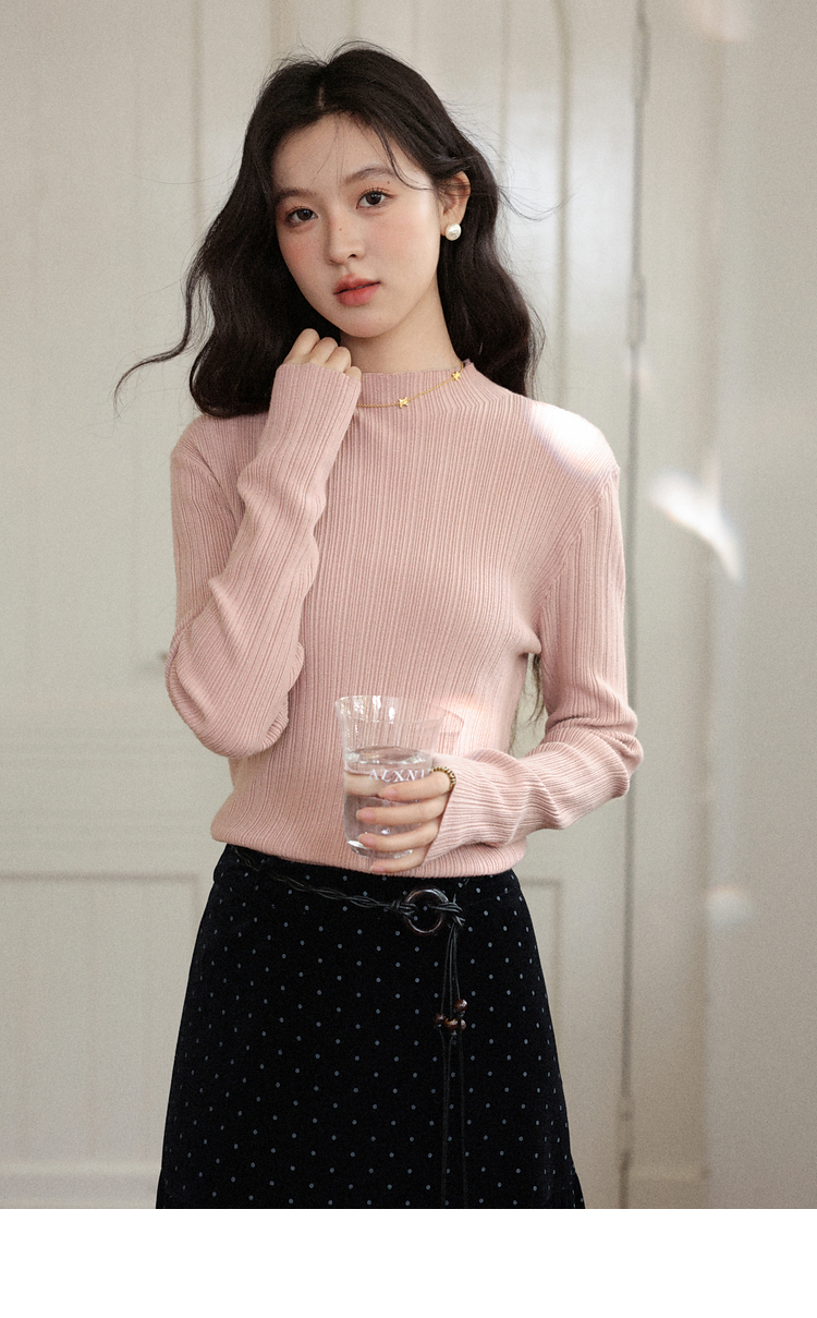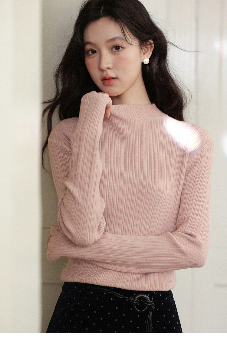 鹿向南「桃雾心笺」粉色半高领长袖t恤女秋巨好看修身打底衫上衣