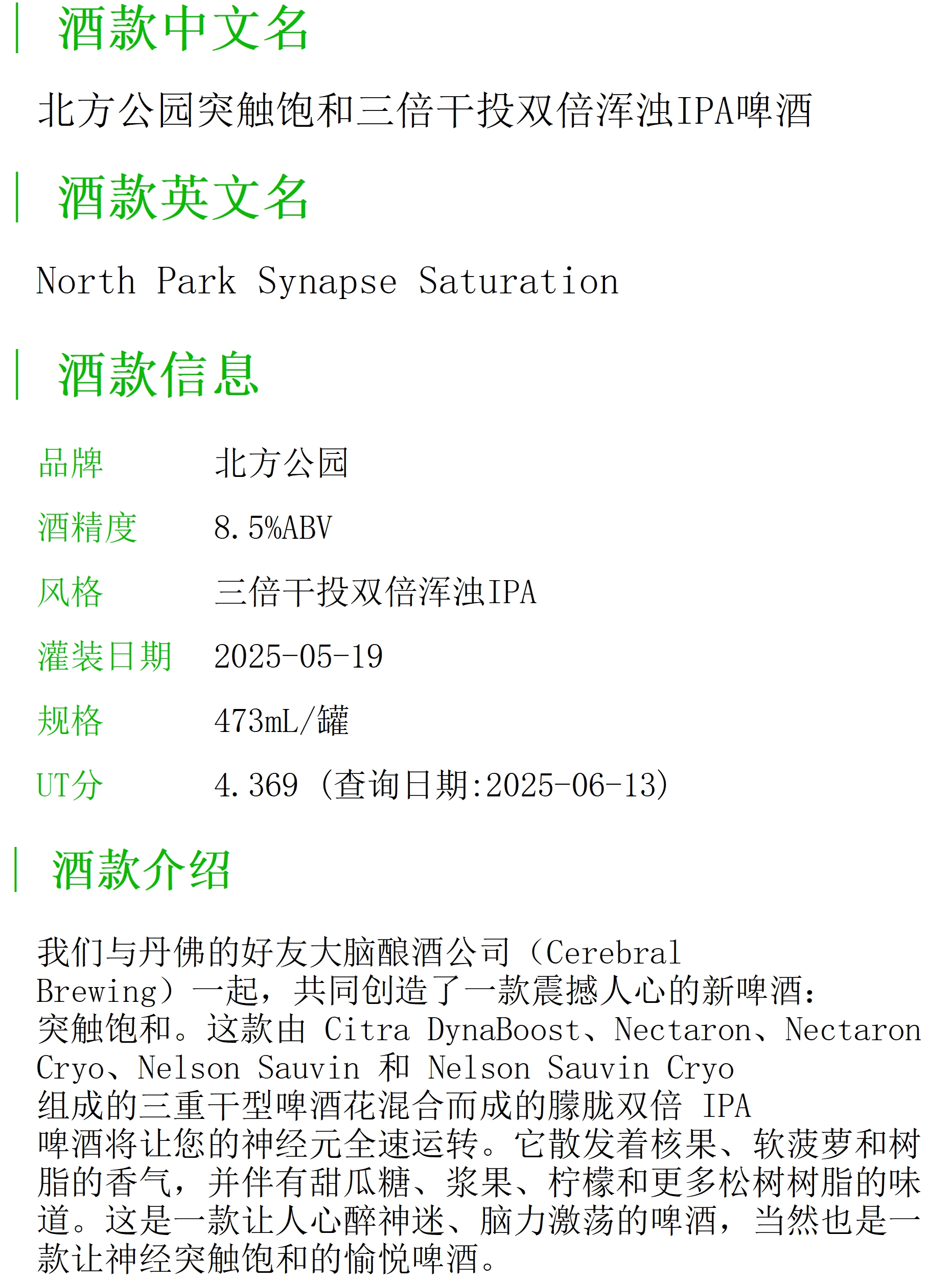 北方公园突触饱和三倍干投双倍浑浊IPA啤酒
