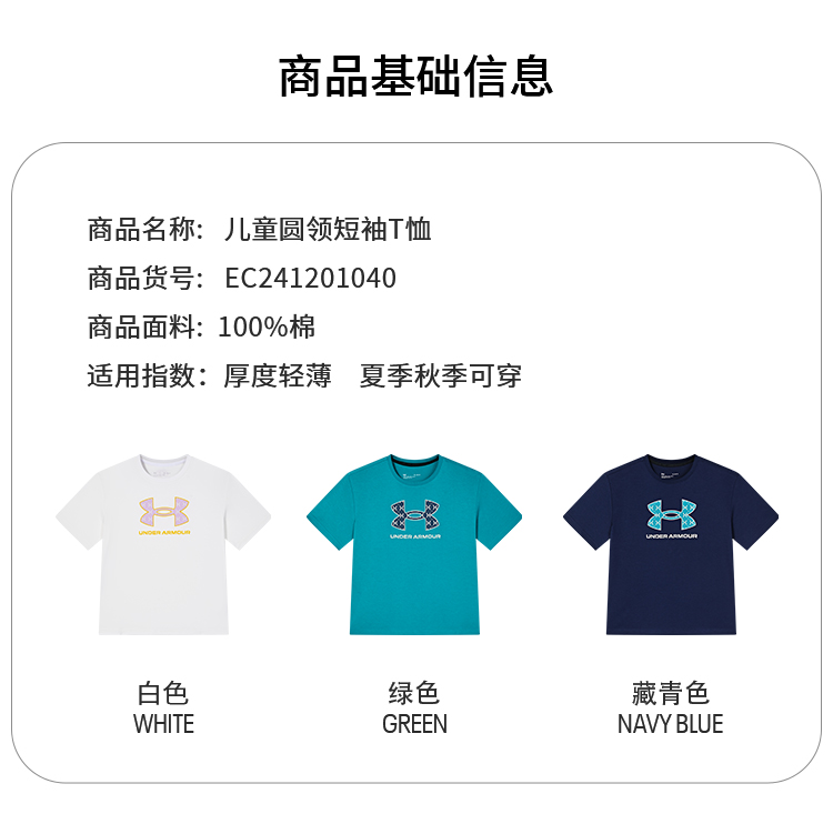 【推荐商品十一】安德玛儿童纯棉百搭圆领短袖T恤241101019