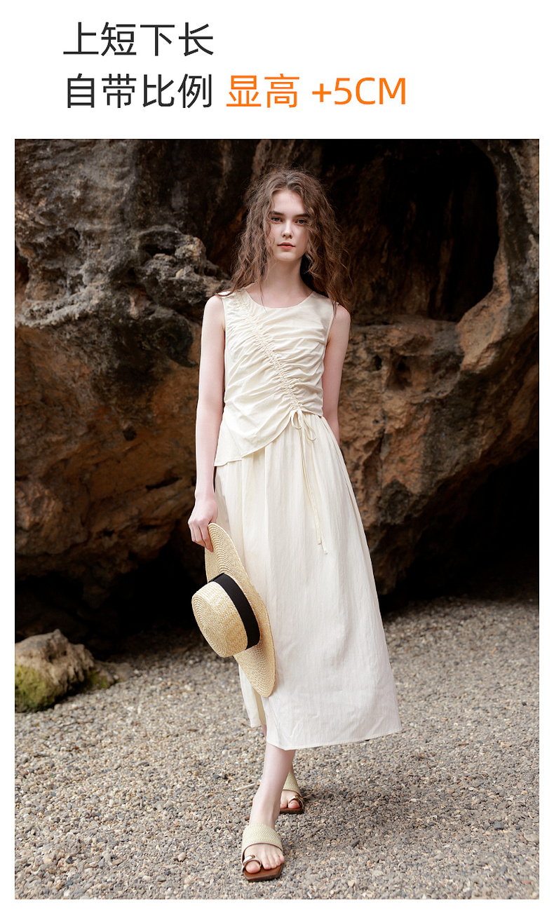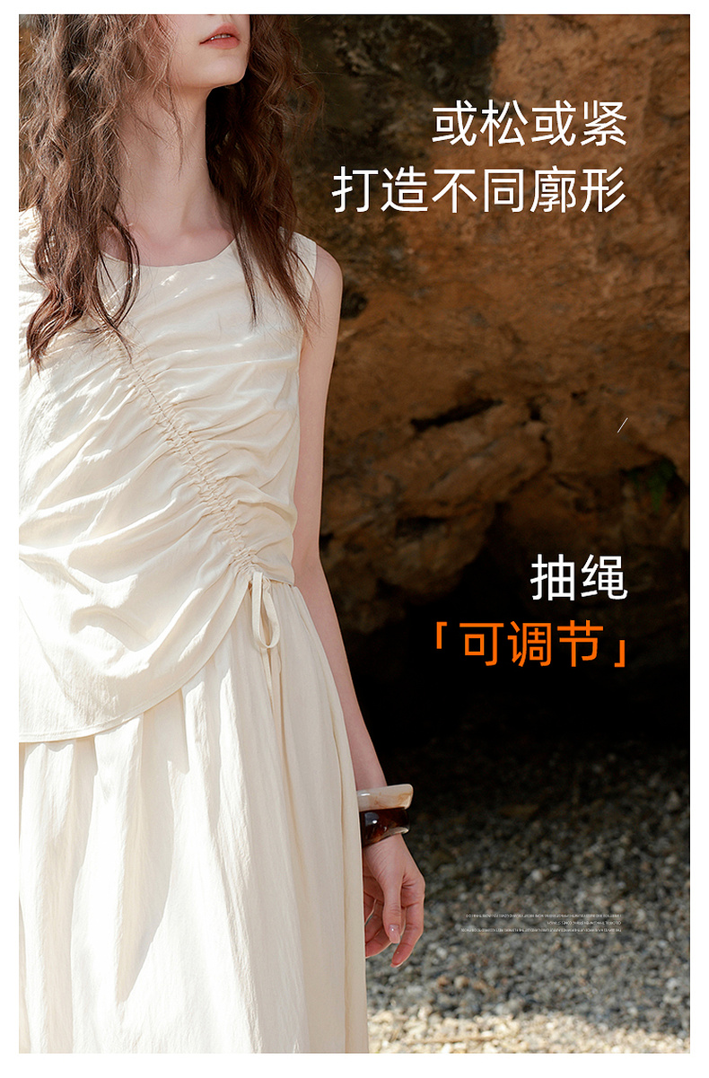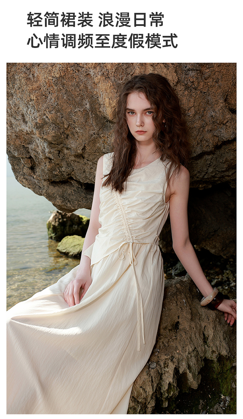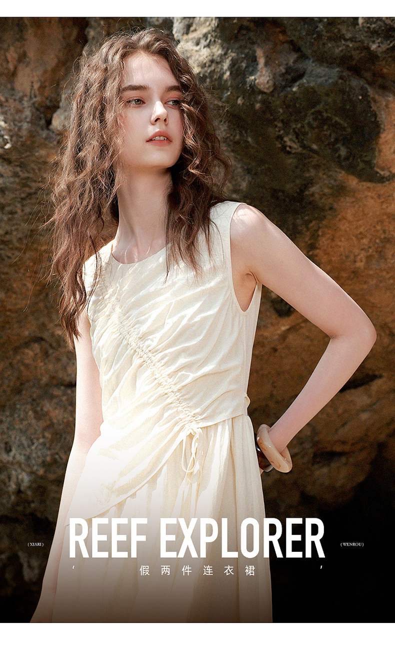 三彩独醒2025夏季新款假两件连衣裙抽绳背心裙收腰A字裙长裙F