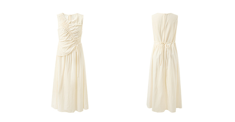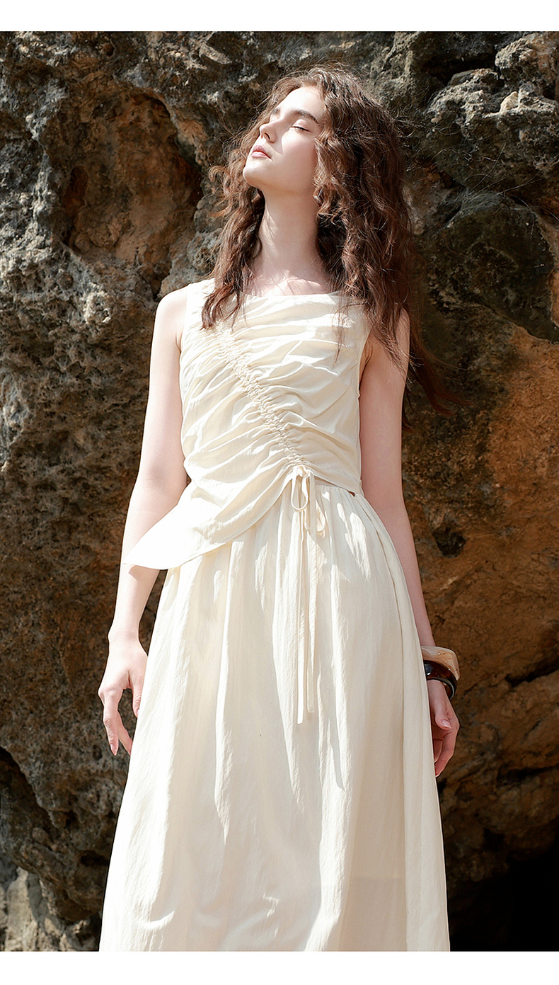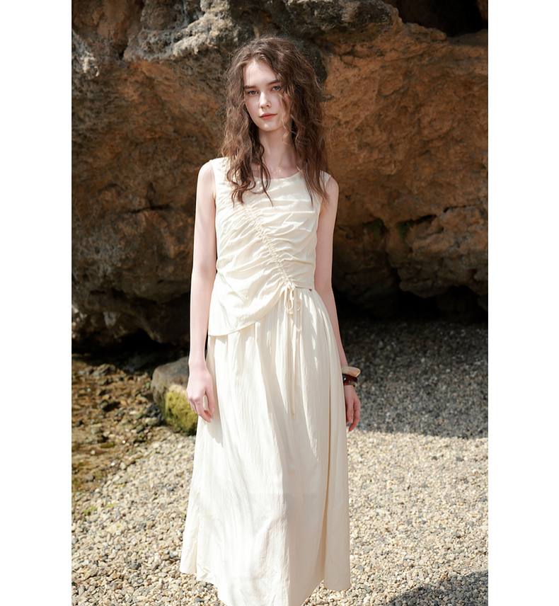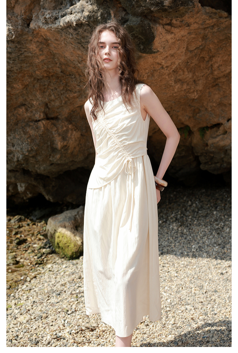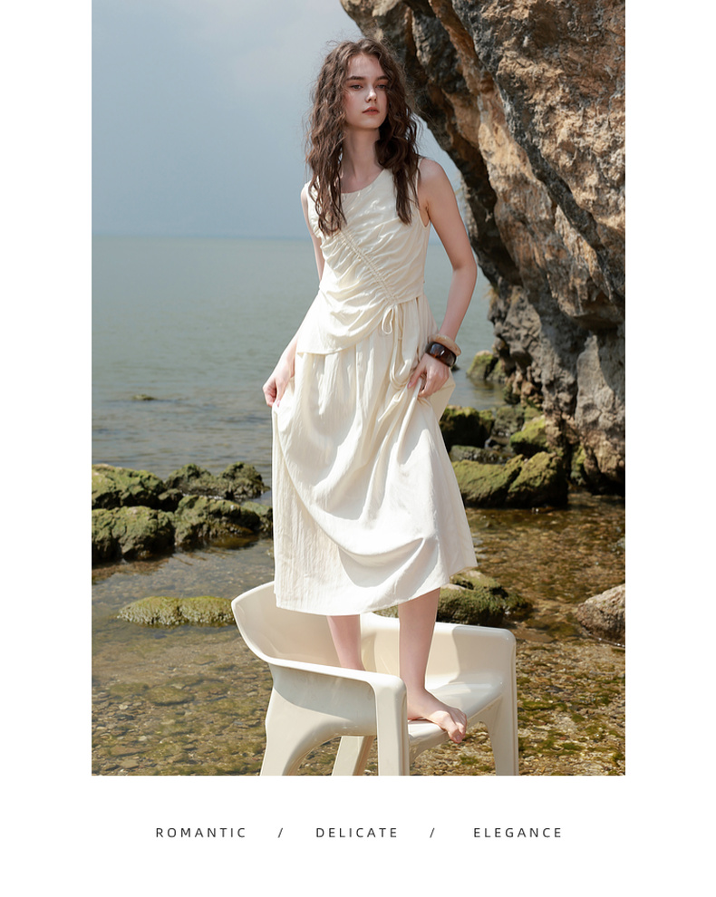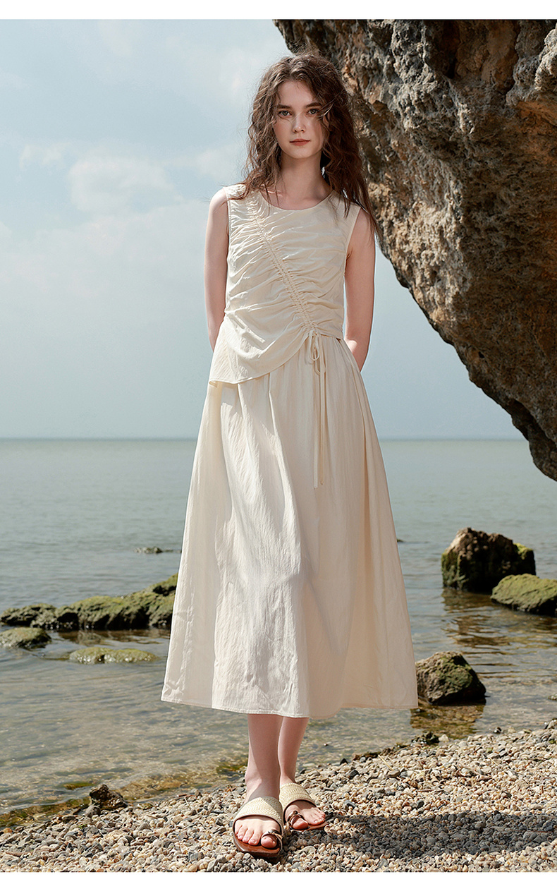 三彩独醒2025夏季新款假两件连衣裙抽绳背心裙收腰A字裙长裙F