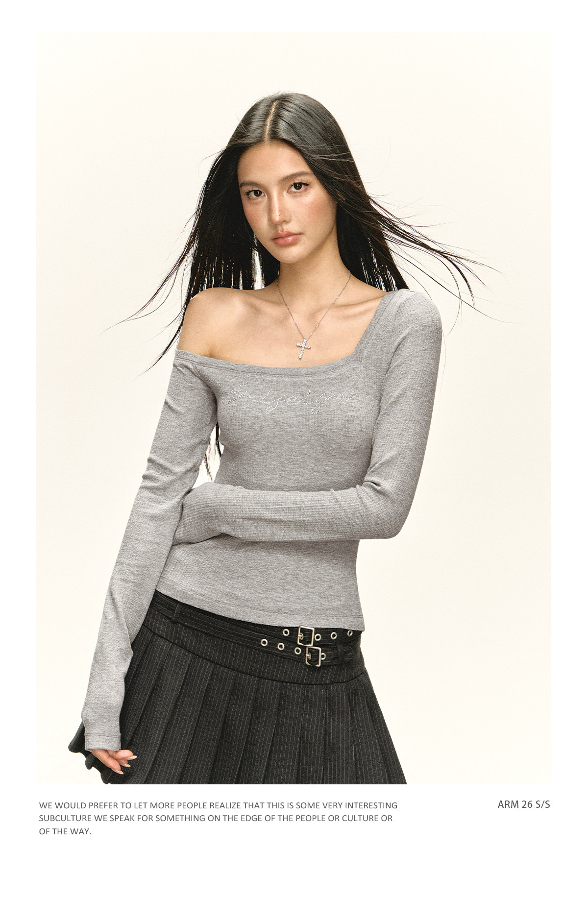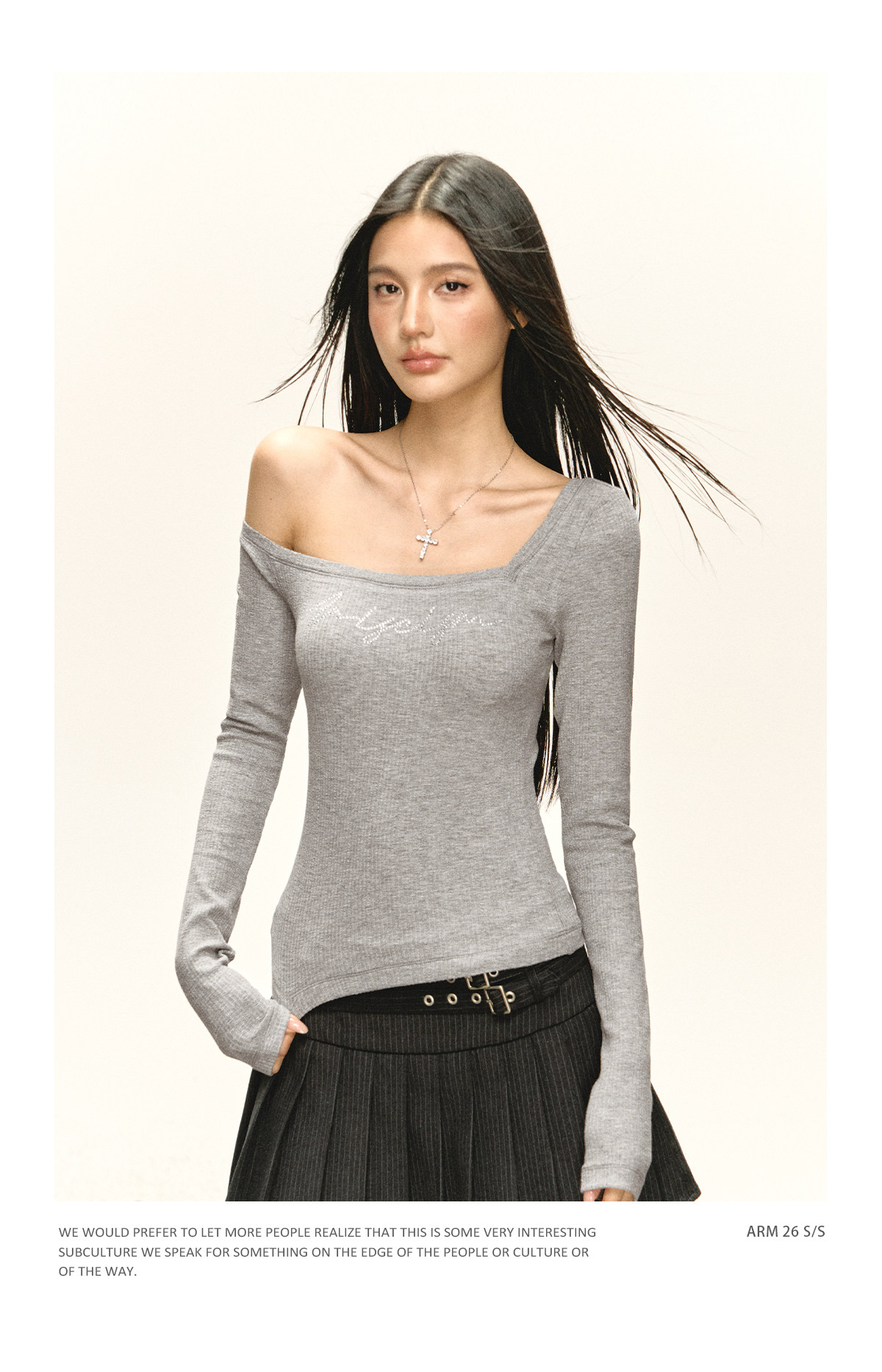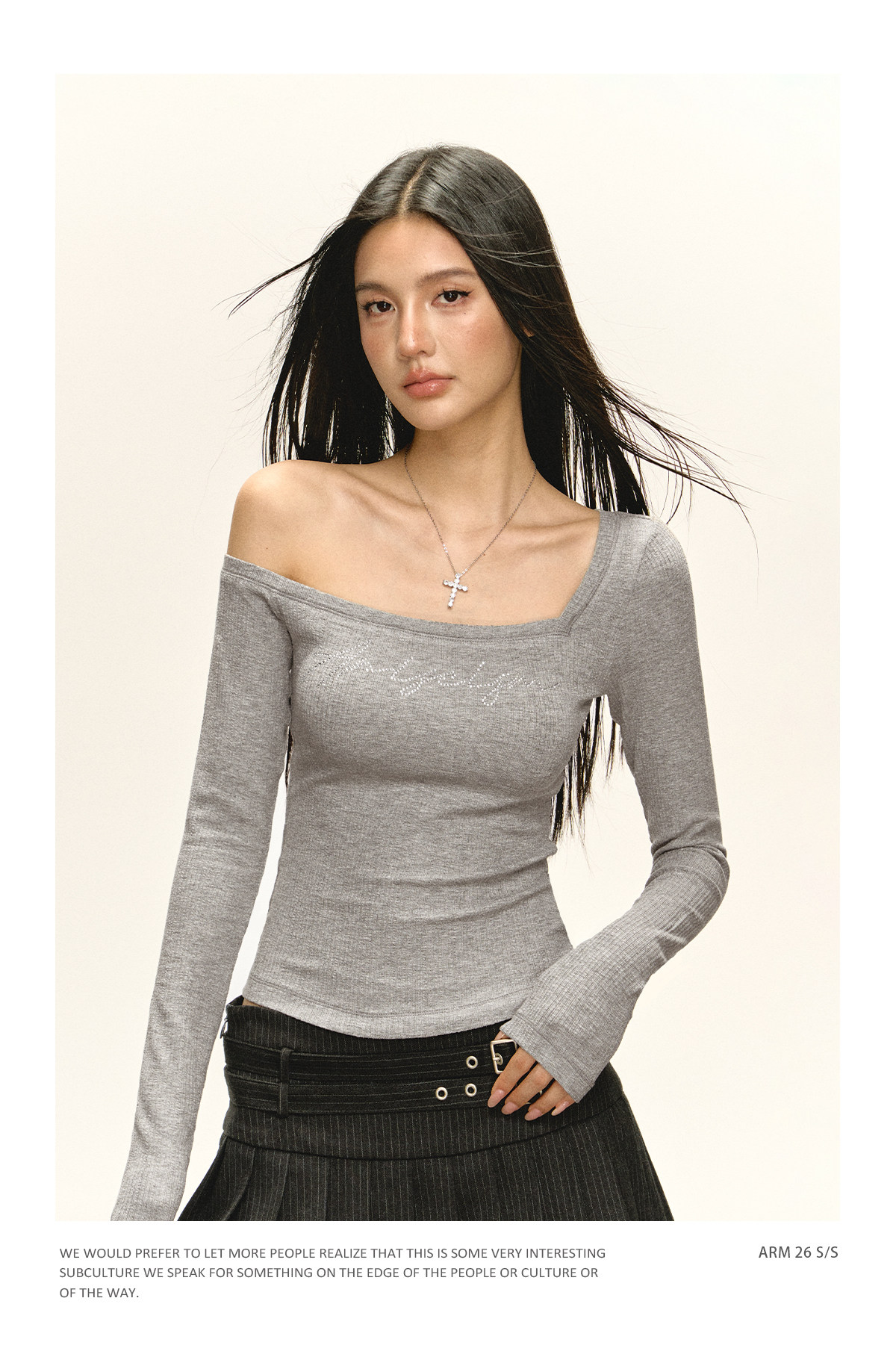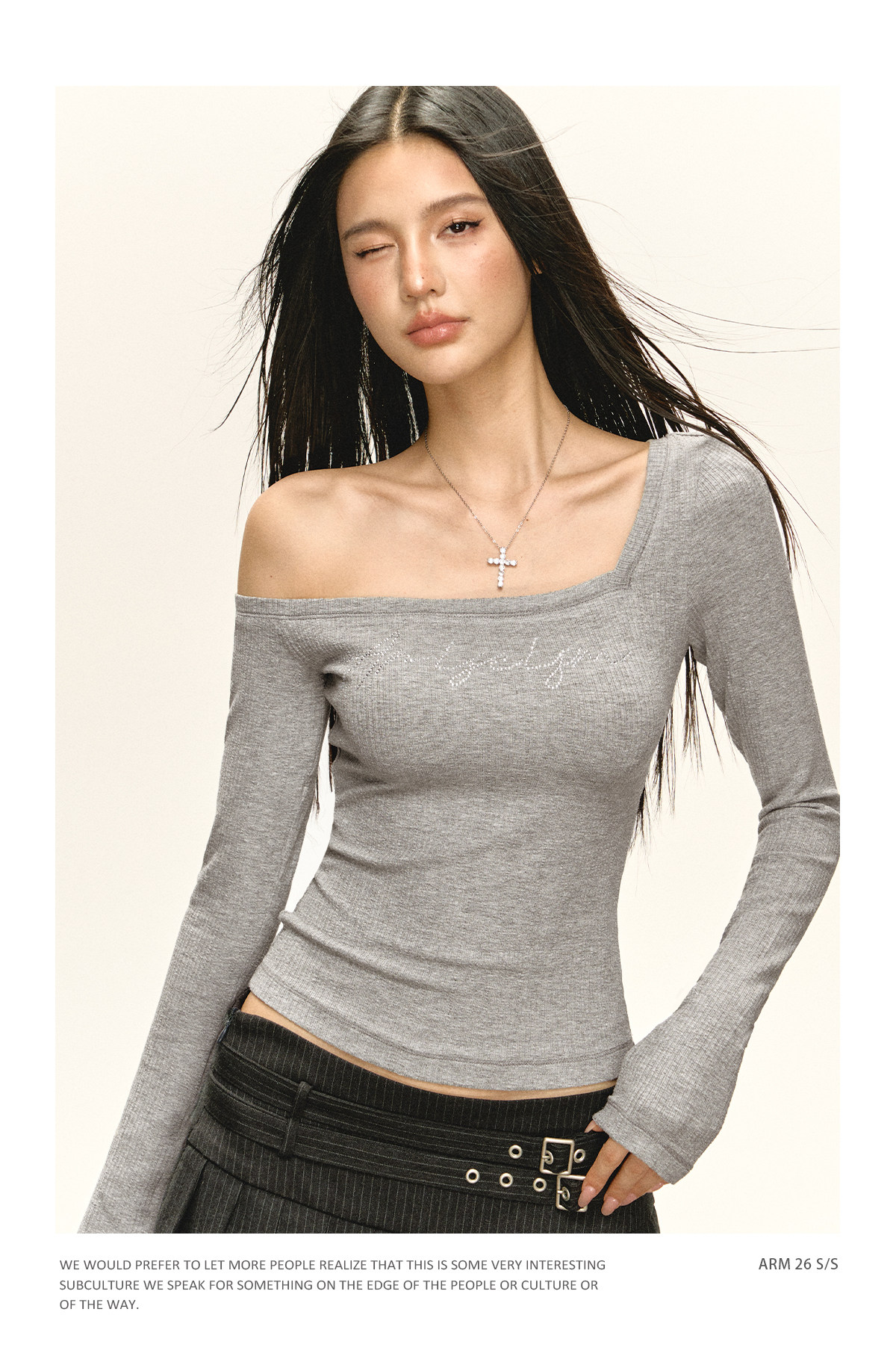 Ariseism 美式复古设计感斜肩长袖T恤女春季新款修身外穿打底上衣