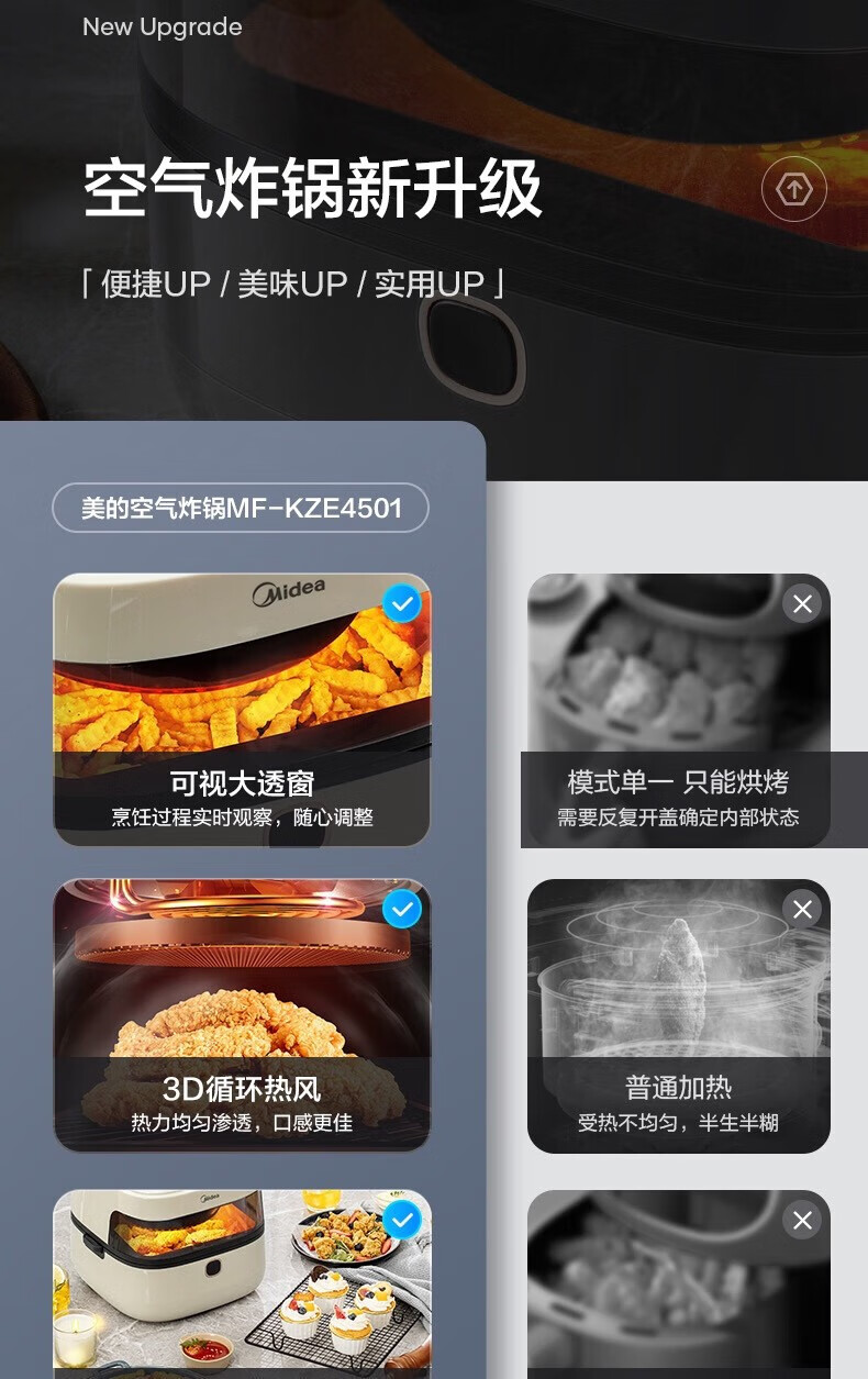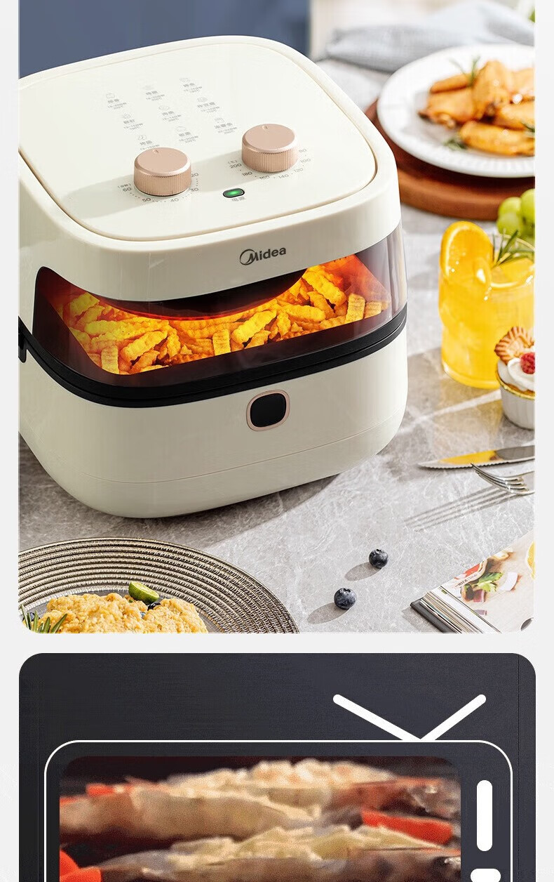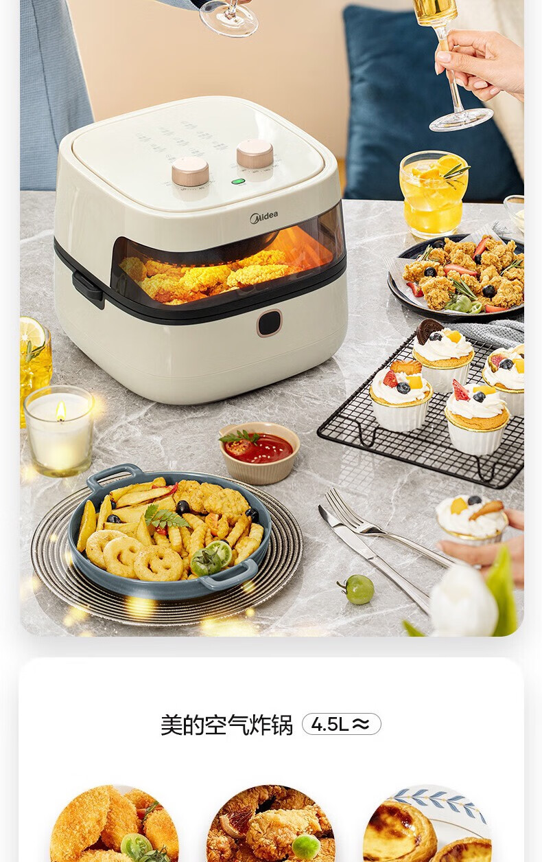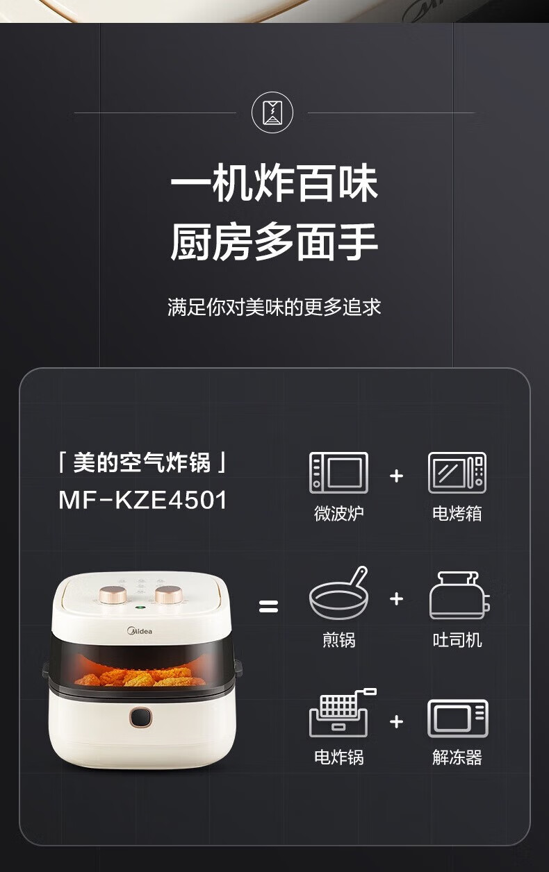 美的(Midea) 超嫩力空气炸锅家用一体多功能wifi可视化7L家用大容量 蒸汽烤箱智能wifi 无油低脂不粘薯条机 KZE4501W【旋钮4.5升】