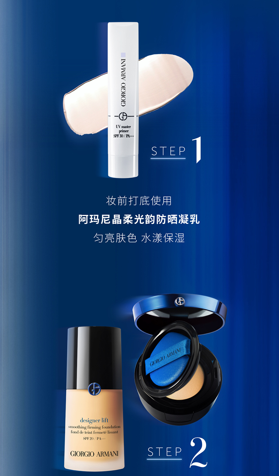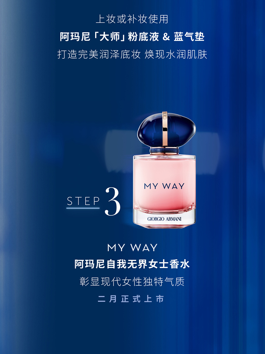 阿玛尼大师轻垫精华粉底液(蓝气垫)亦可搭配粉底刷涂抹,打造高度遮瑕的专业妆容。