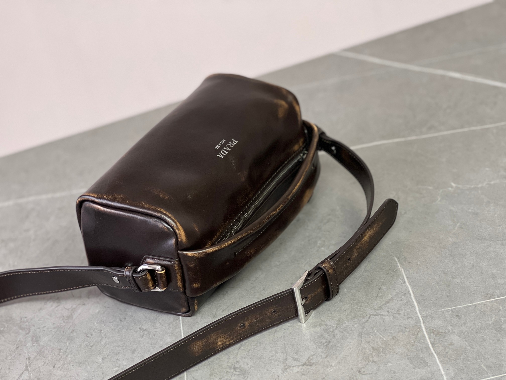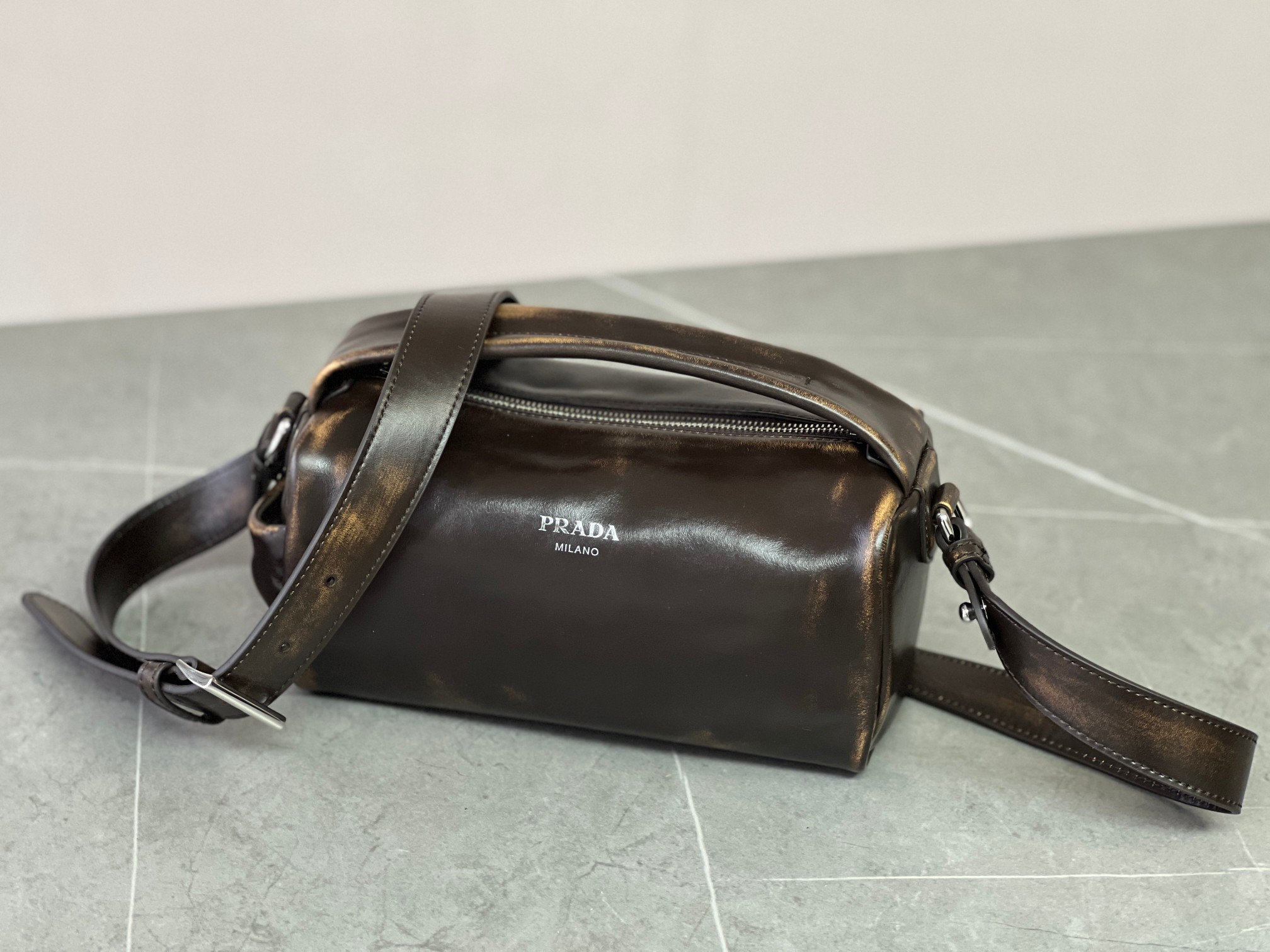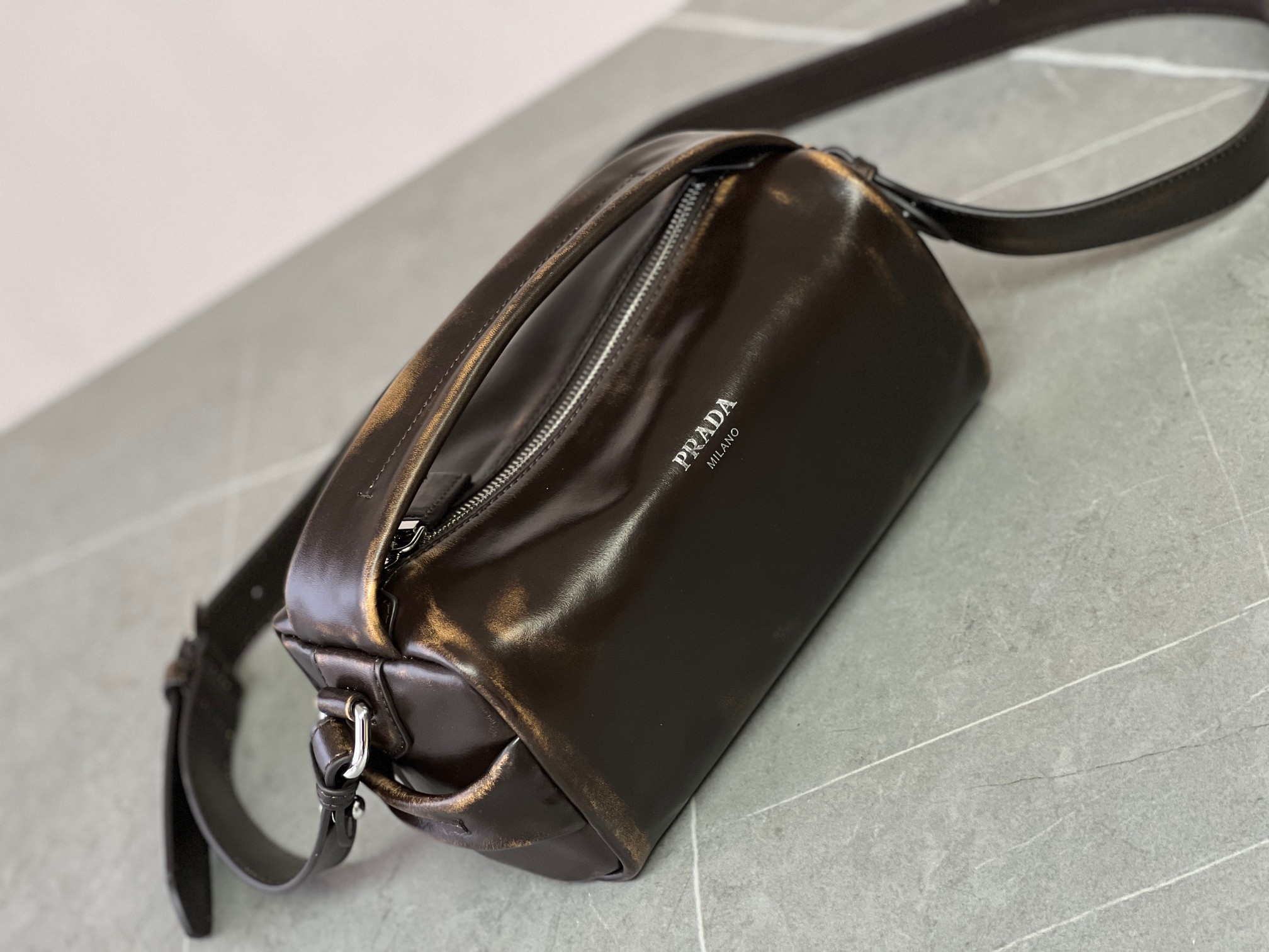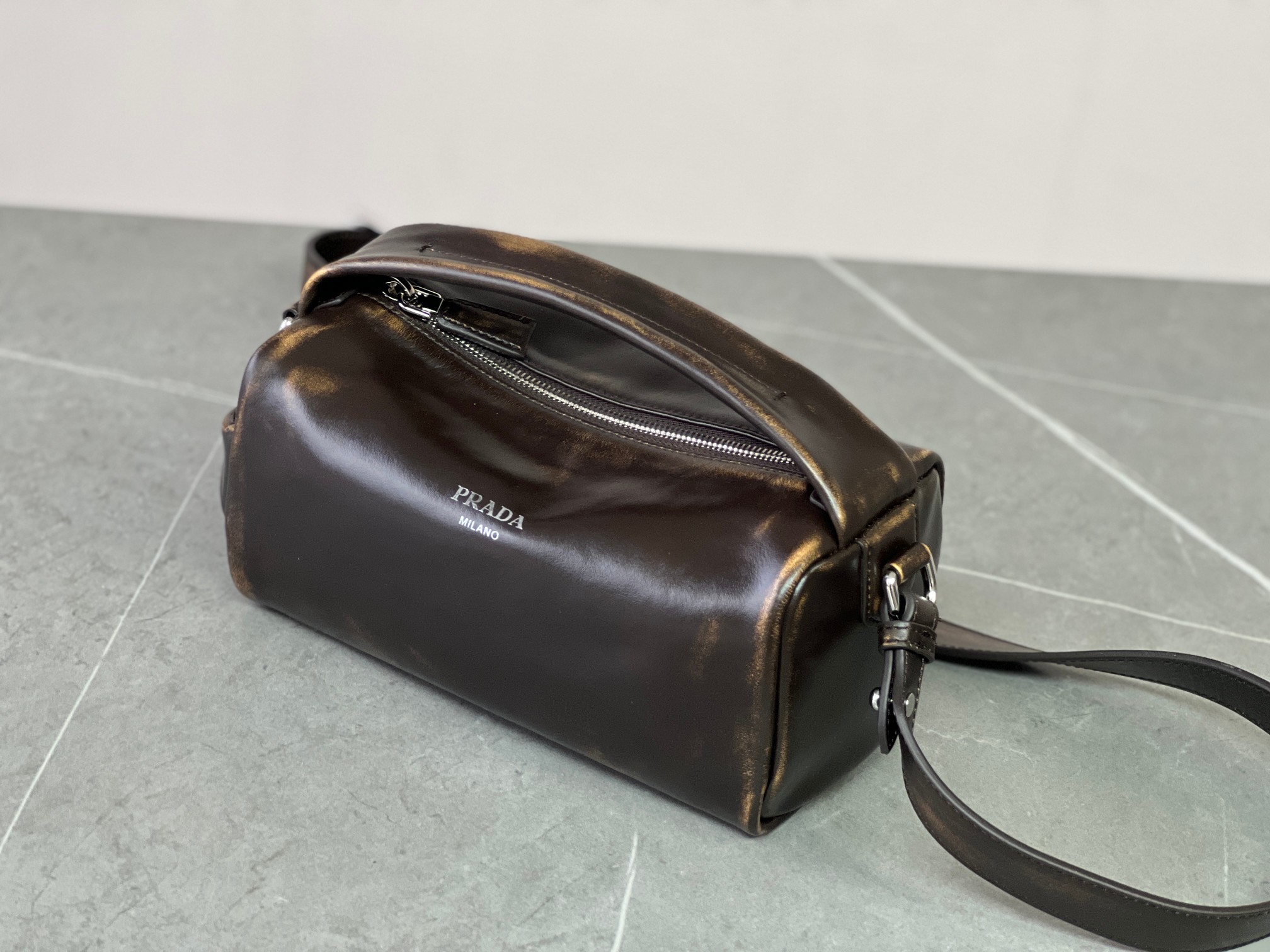 P 家 25秀款旧油蜡皮饭盒包!男女同款 纯原渠道货来的,这质感无法抗拒,这只“旧包” 爱了爱了~巧克力色复古做旧小包,复古与未来的双重视觉碰撞!