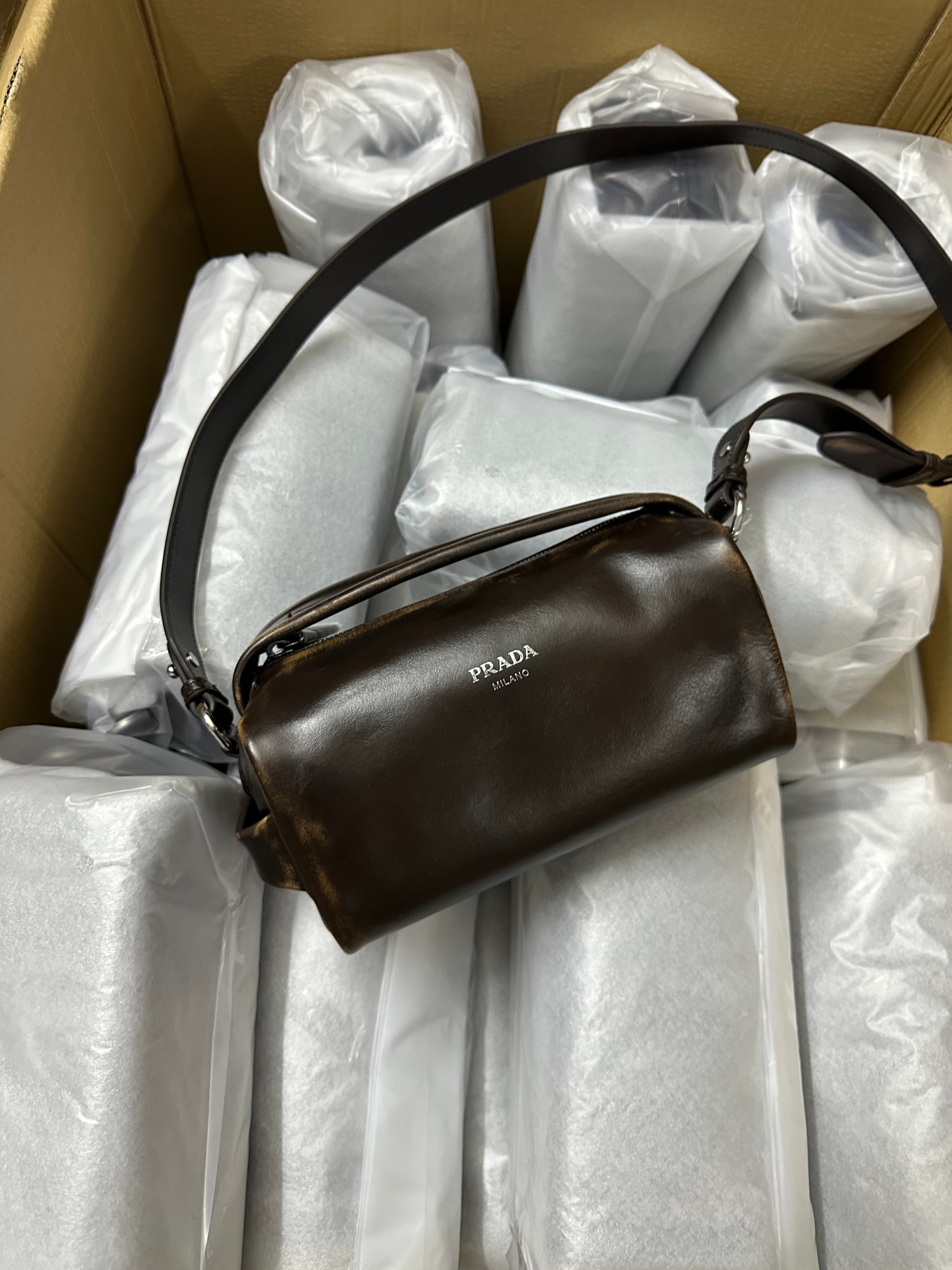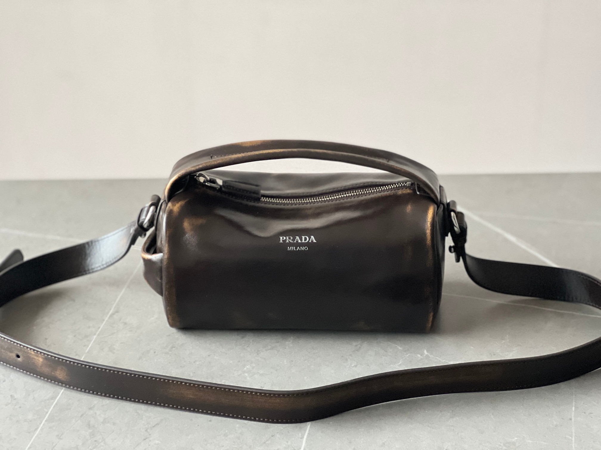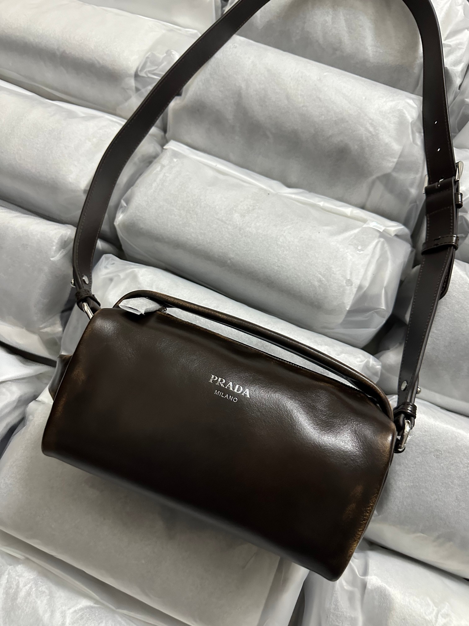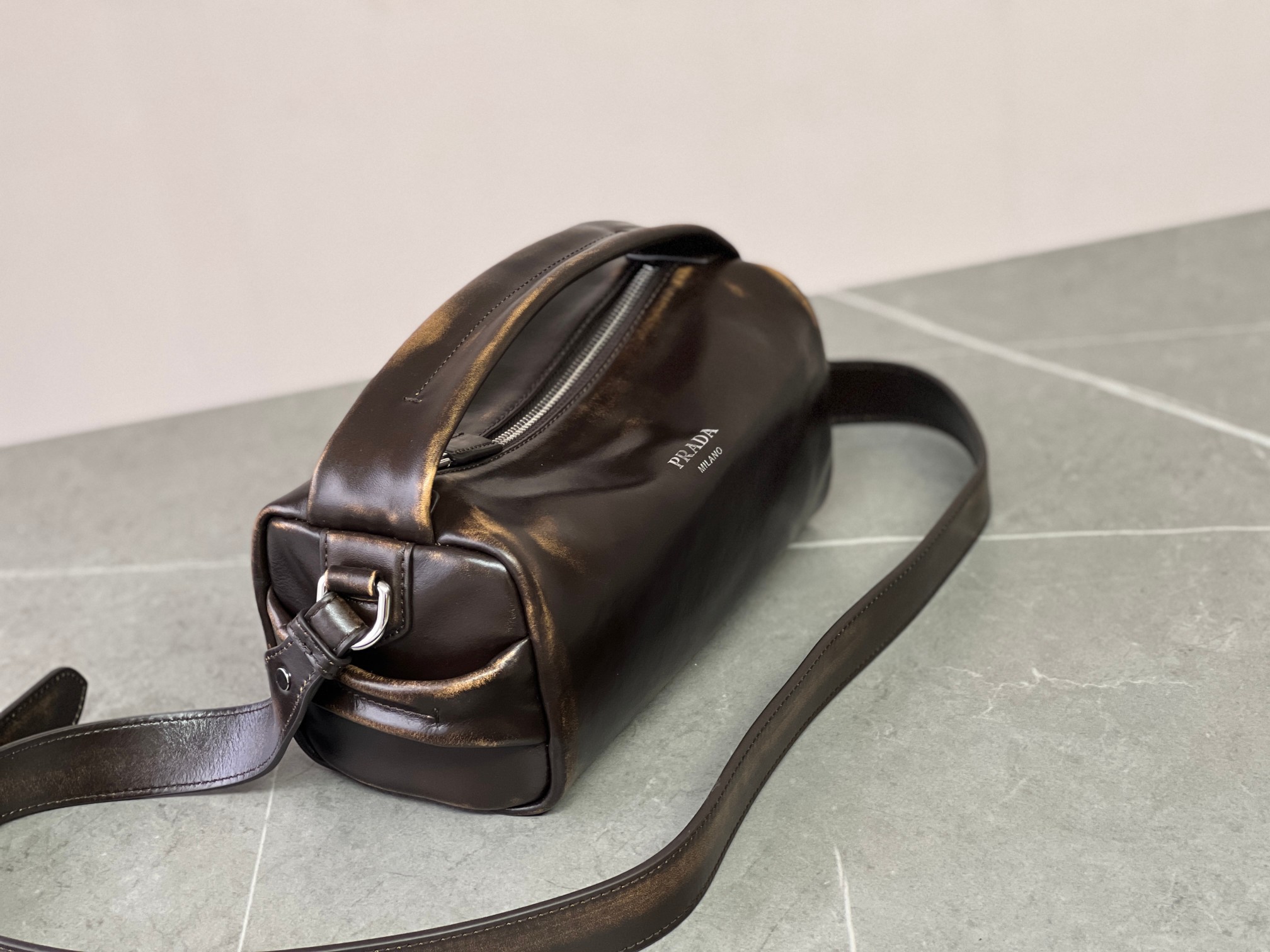 P 家 25秀款旧油蜡皮饭盒包!男女同款 纯原渠道货来的,这质感无法抗拒,这只“旧包” 爱了爱了~巧克力色复古做旧小包,复古与未来的双重视觉碰撞!