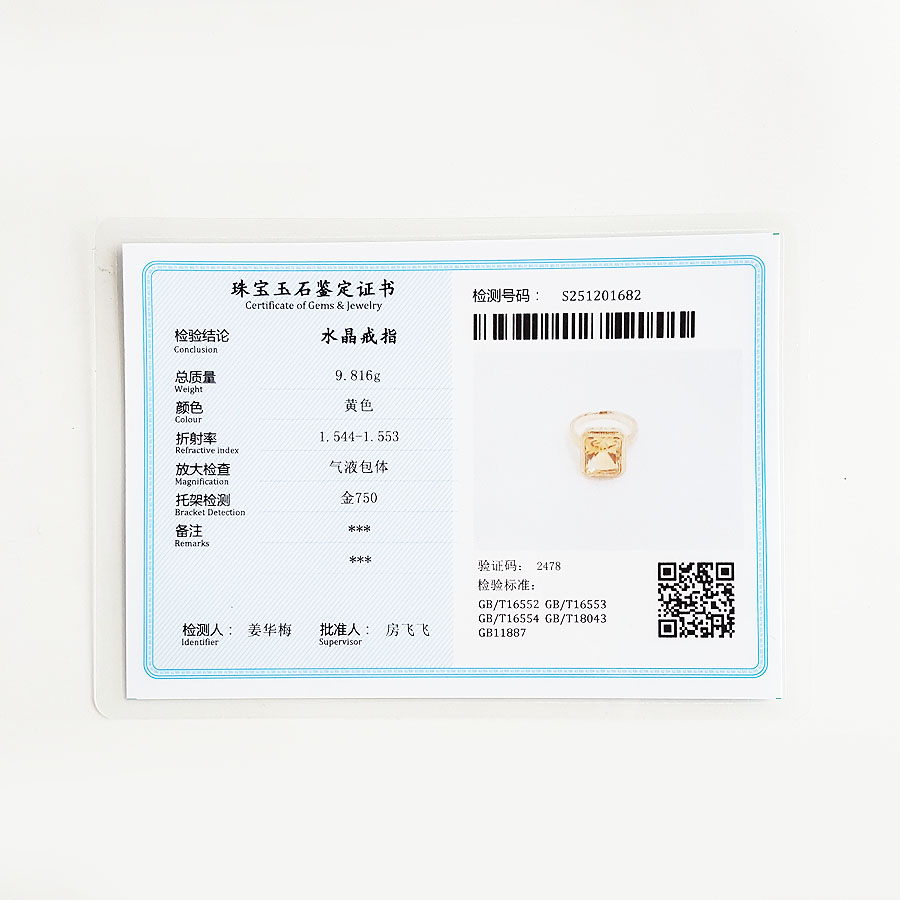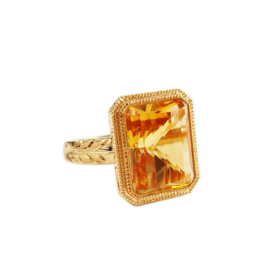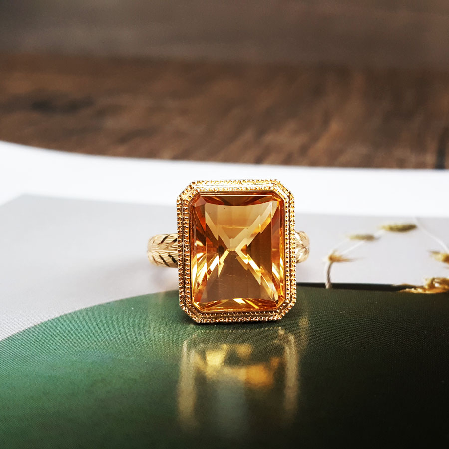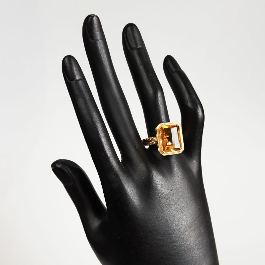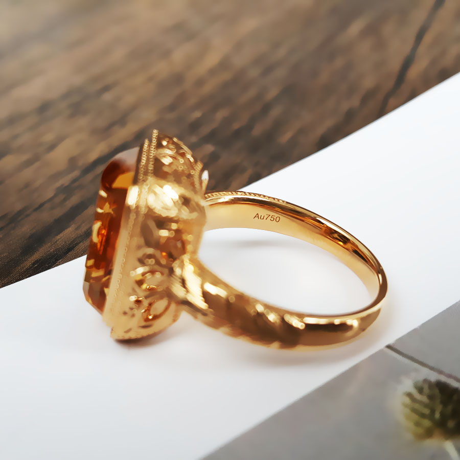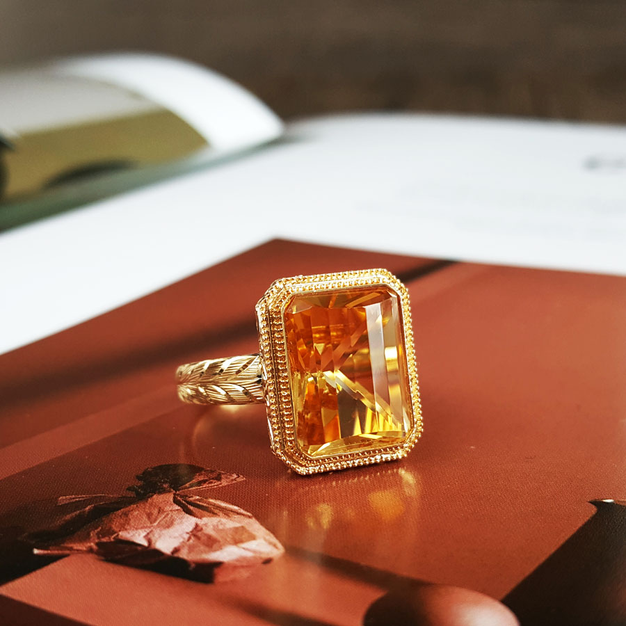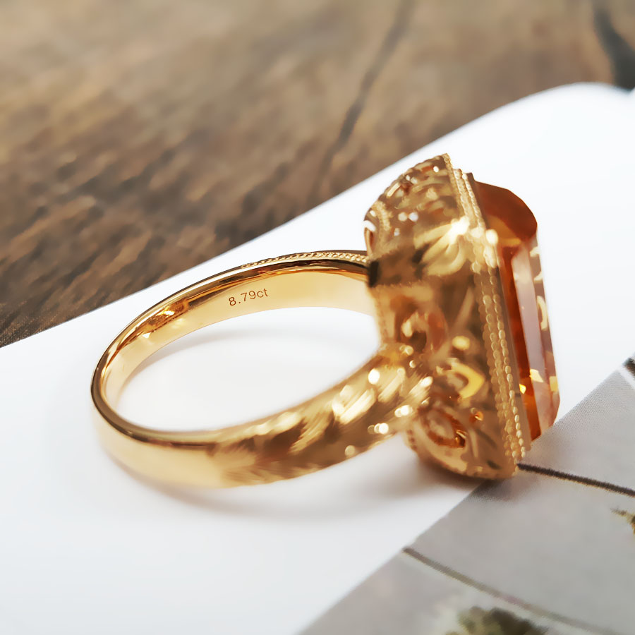 名称 | AU750黄金镶天然镂空设计师款近全净体8.79克拉黄水晶戒指 |