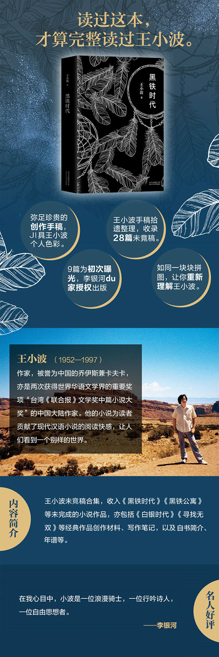 王小波小说、随笔未竟稿合集,收入《黑铁时代》《黑铁公寓》等未完成的小说作品,亦包括《白银时代》《寻找无·双》等经典作品创作材料、写作笔记,以及题材罕见的对科学论文的眉批、自书简介、年谱等。其中,《一个愤世嫉俗的人》《海鬼》《大学四年级》等9篇根据手稿整理的未竞稿为SHOU次出版。本书充满了王小波作品中一以贯之的幻想与批判,清晰勾勒了王小波的创作版图,令读者得以一窥其日臻成熟的创作过程。