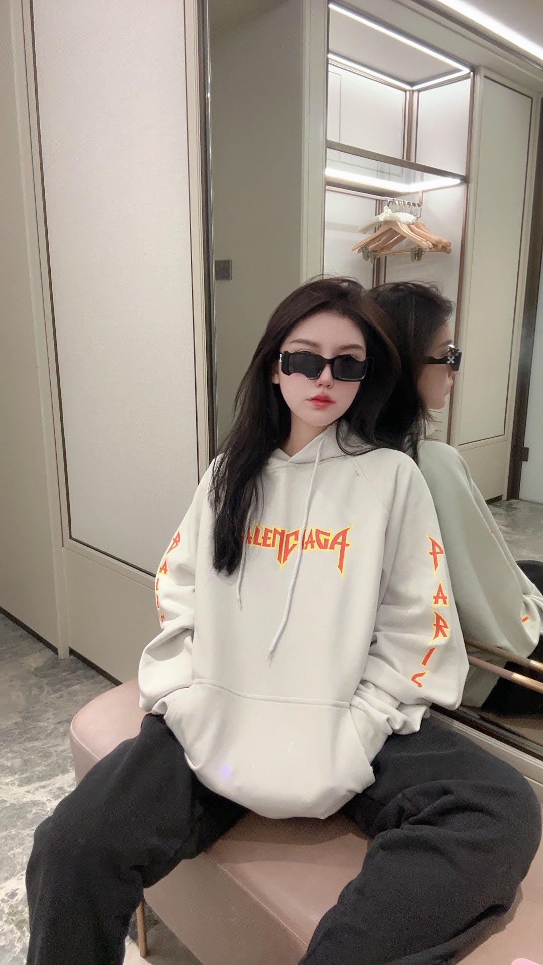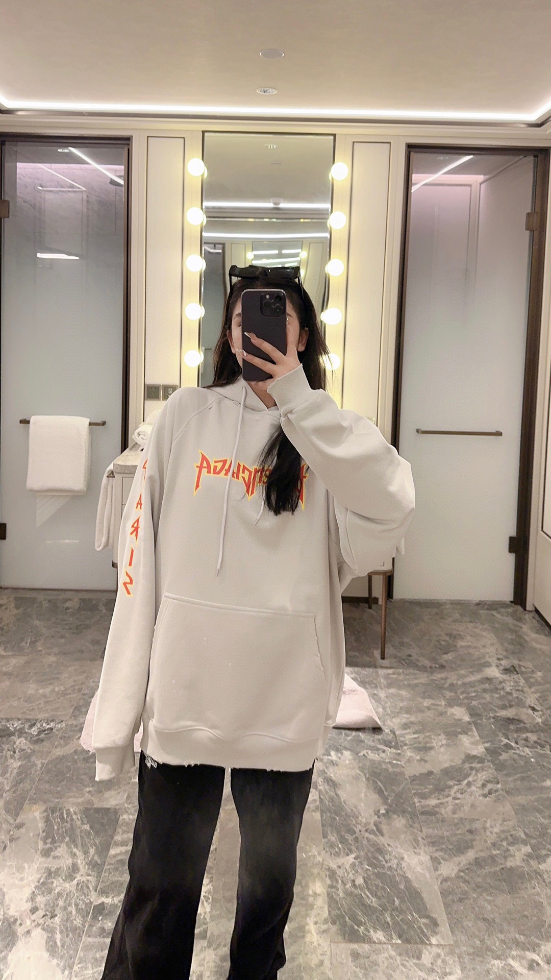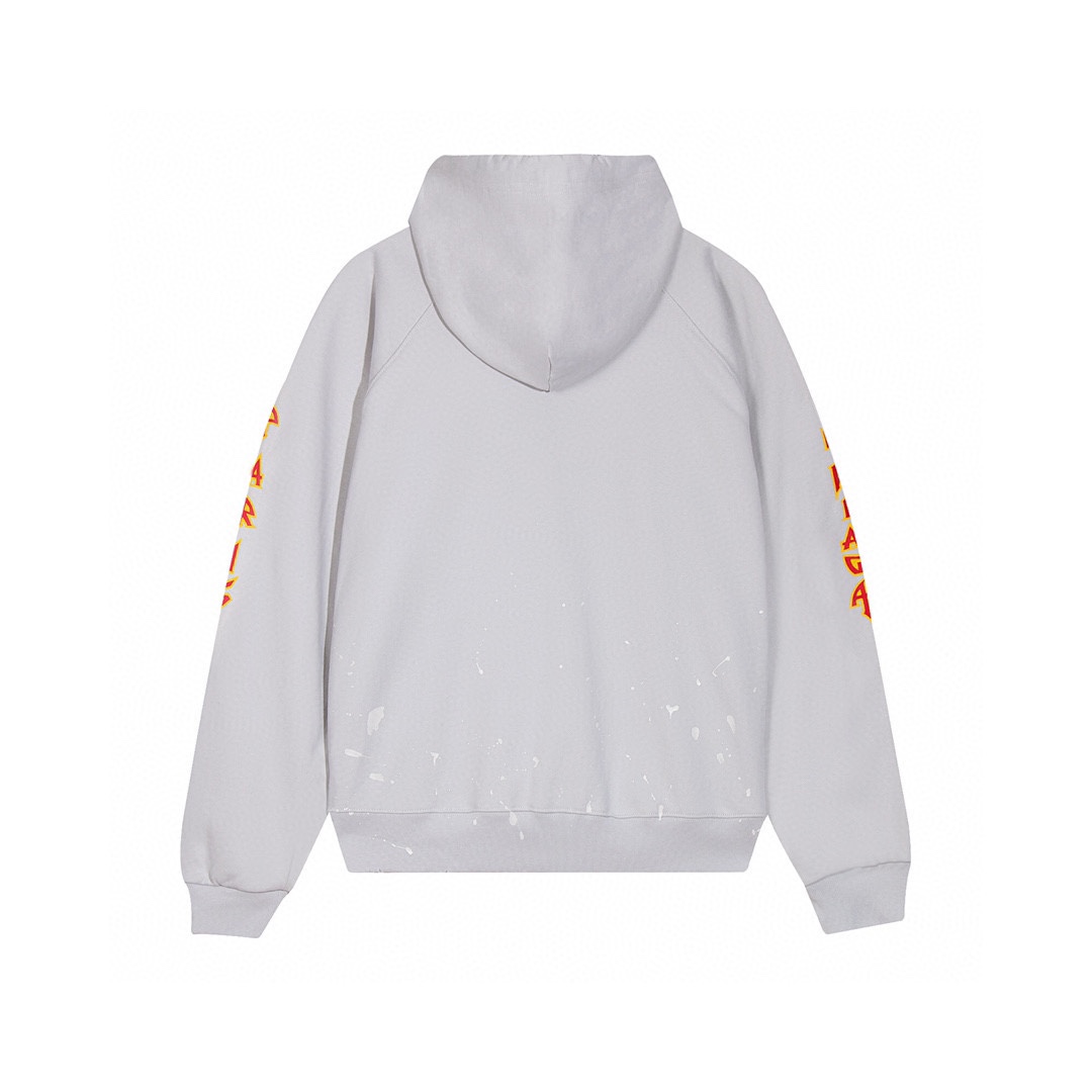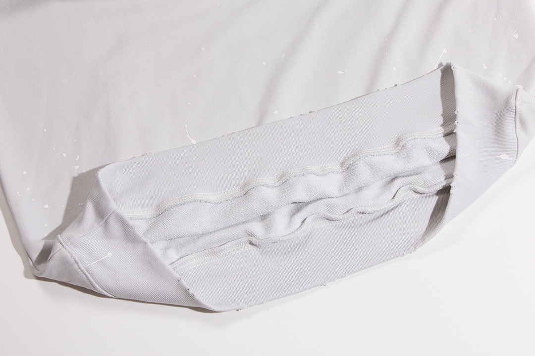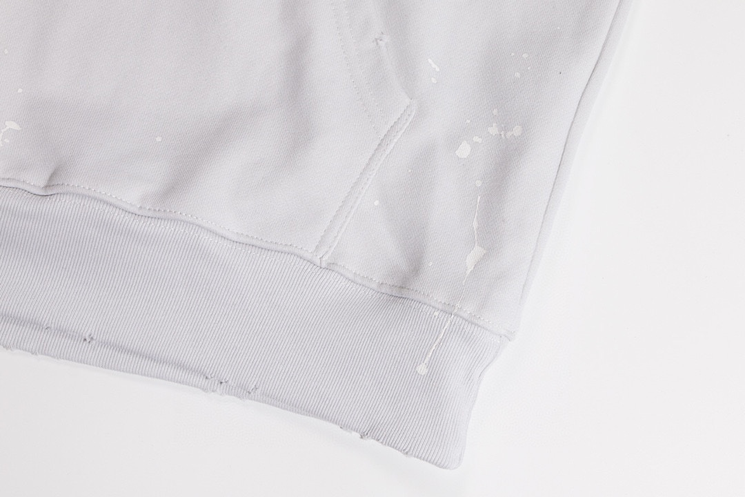 前幅左右手臂采用拉裂工艺印花-巴黎英文字母logo 重工洗水磨烂破洞 下摆喷墨工艺 多种工艺成本极高 成衣效果完美 独家对版定织定染纯棉毛圈面料 克重520g 质感舒适厚实 os落肩宽松版型 顶级工艺顶级做工 欢迎对比 男女同款