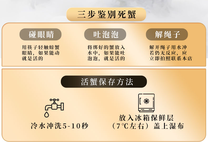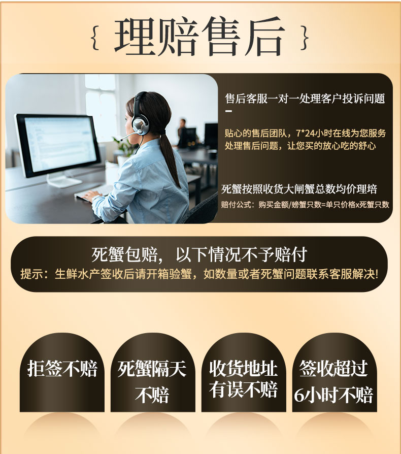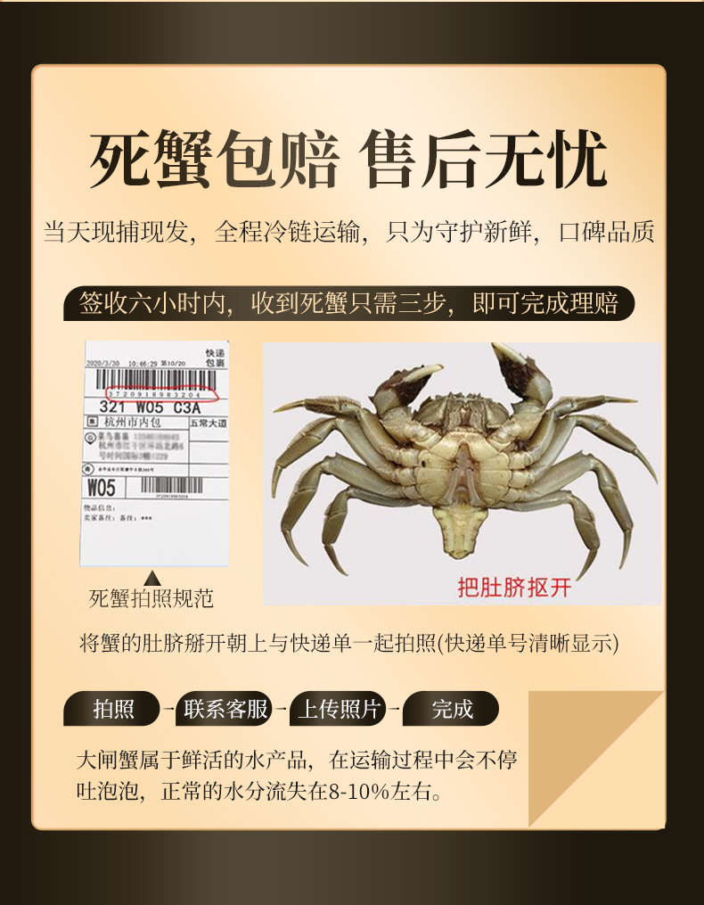 【售后标准】:死蟹包赔,收到后6小时内开箱,有死蟹,死蟹肚皮朝上连同发货箱子物流面单一起拍照,核实赔付。