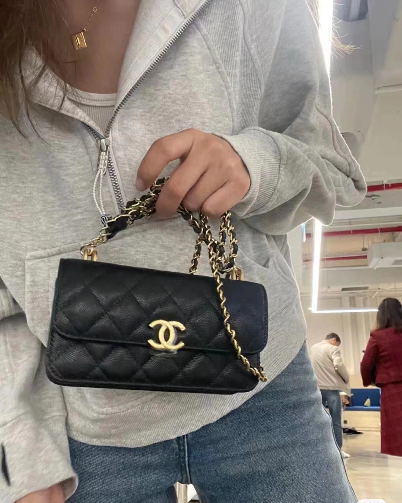 本季大爆款,意大利荔枝纹小牛皮,实物特别大气的一个颜色,mini的尺寸更显小巧,可以轻松放下promax的手机📱,经典的𝗖𝗙包型大logo磁扣,搭配双C 编织提手,打破了经典的链条设计,既有浓郁的秋冬韵味,又是满满的复古感,经典又与众不同