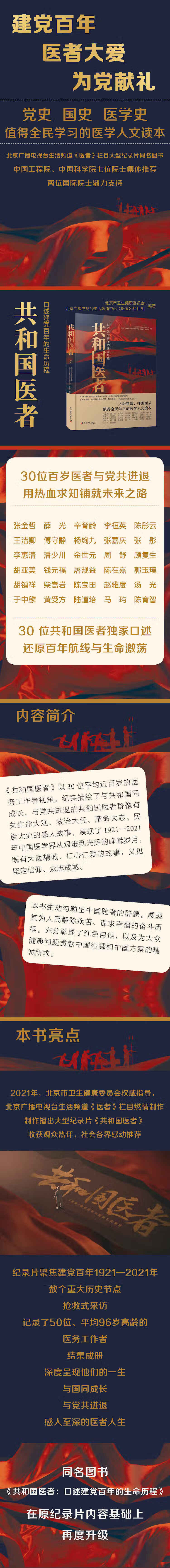 《共和国医者:口述建党百年的生命历程》以30位平均年龄近百岁的医务工作者视角,纪实描绘了与共和国同成长、与党共进退的中国医者有关生命大观、救治大任、革命大志、民族大业的感人故事,展现了1921-2021年中国医学界从艰难到光辉的峥嵘岁月,既有大医精诚、仁心仁爱的故事,又见众志成城的坚定信仰。 《共和国医者:口述建党百年的生命历程》中生动勾勒出中国医者的群像,展现其为人民解除疾苦、谋求幸福的奋斗历程,充分彰显了红色自信,以及为大众健康问题贡献中国智慧和中国方案的精诚所求。 30位共和国医者口述,还原百年航线与生命激荡,一生与党共同进退,用热血与求知,铺就未来之路。北京广播电视台生活频道中心《医者》栏目大型纪录片同名图书,中国工程院、中国科学院七位院士集体推荐,两位国际院士鼎力支持,大医精诚,择善而从,值得全民学习的医学人文读本! 建党百年,医者大爱。 《共和国医者:口述建党百年的生命历程》以30位平均年龄近百岁的医务工作者的视角,采用纪实的形式描绘了那些与共和国同成长、与党共进退的中国医者有关生命大观、救治大任、革命大志、民族大业的感人故事,展现了1921-2021年中国医学界从艰难走向光辉的峥嵘岁月。这些植根沃土的篇章,既有关于大医精诚、仁心仁爱的故事,又有关于坚定信仰、众志成城的故事,还有关于人民至上、生命至上的故事,更有关于人类使命、中国价值的故事,于细微之处见精神,真实生动地勾勒出中国医者群像,展现了他们为大众解除疾苦、谋求幸福的奋斗历程,充分彰显了中国医者的红色自信,以及终为大众健康问题贡献中国智慧和中国方案的精诚所求。