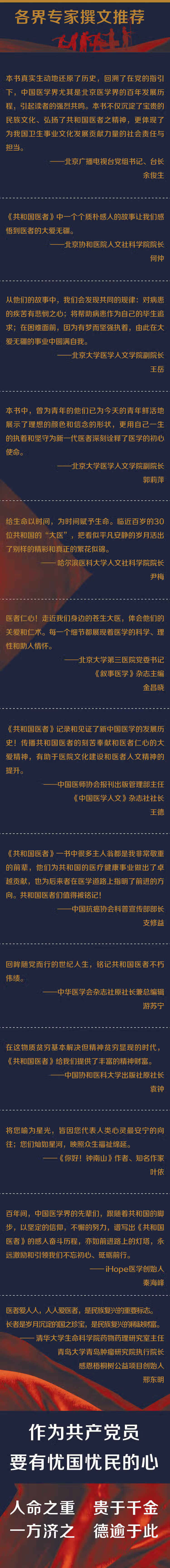 写在前面 明朝裴一中《言医·序》曾言:“学不贯今古,识不通天人,才不近 仙,心不近佛者,宁耕田织布取衣食耳,断不可作医以误世!医,故神 圣之业,非后世读书未成,生计未就,择术而居之具也。是必慧有夙因, 念有专习,穷致天人之理,精思竭虑于古今之书,而后可言医。” 中华上下五千年,医学文明源远流长。八国联军的洋枪洋炮、侵华 日军的铁蹄践踏、战争的硝烟、历史的黑暗,都无法湮没中华民族的灵 魂延续和中国医者的精神传承。 《共和国医者》作为建党百年的献礼巨制,得到了北京市卫生健康委 员会的全方位指导与帮助。秉承着审慎严谨、深度挖掘、于细微之处见 精神的原则,采用人物为体、故事为用的叙事形式,展现了 1921—2021 年以来中国医学界从艰难走向光辉的峥嵘岁月,不论是在面对敌人炮火 时,还是在重振民族复兴伟业时,总有这样一些“共和国医者”,坚定地 矗立在那里,与党共进退,与国同担当。 值得一提的是,书中记录了 30 位平均年龄近百岁的医学大家,记录 了他们为大众解疾苦、谋幸福,勤耕不辍、身体力行、奉献一生的感人 故事。其中许多极具重磅的人物,本身就是承载国家记忆、彰显民族信 仰的永恒力量。 《共和国医者》张金哲特辑写道,“那是 1951 年的秋天,抗美援朝战争刚刚经历 过五场大规模战役。中国人民志愿军力挽狂澜,将以美国为首的“联合国军”从鸭 绿江边打回到三八线。也就是这一年,张金哲以一名普通外科医生的身份,踏上了 战场。” 《共和国医者》李桓英特辑写道,“1958 年,37 岁的李桓英游历了大半个欧洲, Z终在莫斯科登上了回国的火车,她的目的地是新中国的首都——北京。彼时,新 中国百废待兴,急需海外学子归来,支持建设。钱学森、邓稼先等科学家纷纷回 国,开启了我国科研事业的新局面。李桓英也同样向往着素未谋面的新中国。她谢 绝了世界卫生组织高薪续约的挽留,从伦敦到巴黎,再到罗马,她几乎跑遍了整个 欧洲。Z终,她从莫斯科坐上火车,奔向了祖国的怀抱。” 《共和国医者》辛育龄特辑写道,“辛育龄赶到了,战友们、连长也来了,但可 惜,白求恩也是真的走了,世上再没有任何力量能留住他。听说白求恩在病痛的折 磨下、死神的到来前,仍坚持抢救了 13 位伤员,并努力撰写治疗疟疾的讲课提纲 后,这些男子汉,哭得长跪不起。” 《共和国医者》陈彤云特辑写道,“丈夫走后的世界,陈彤云要一个人去面对了。 那时陈彤云不过 39 岁,几年后,带着 3 个幼小子女的她,被调至北京中医医院。从 此,她潜心研习中医皮肤病的诊疗和研究,并在中医大家赵炳南的指导下,逐步形 成了以治疗损容性皮肤病为主的临床特色。这一坚持,就是整整 76 年。” 《共和国医者》钱元福特辑写道,“此后,中国全方位地走向世界,世界卫生组 织看到中国结核病防治过程中的有效经验,决定遴选一位一流的公共卫生专家。钱 元福,正是他们要找的人选。” 书中那些植根沃土的故事,那些择善而从的篇章,全方位展示了共和国医者 的大医精诚与济世情怀,更彰显了中国医者的红色自信、金色品质,引导读者建立 对百年生命历程及医学发展的客观认知,在助力全社会形成尊医重卫良好风气的同 时,带给更多人有关民族大义、救治大观的感悟和力量。 北京市卫生健康委员会党委书记 钟东波
