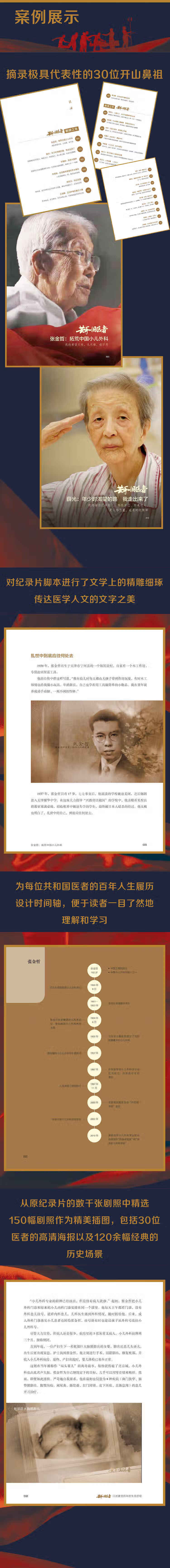 期颐之年 张金哲:拓荒中国小儿外科 我的希望只有,儿无痛,母不悲 薛光:年少时渴望的路?6?9 我走出来了 我感谢你们年轻人,牺牲自己、照亮别人,是人格力量,也是时代精神 辛育龄:医学兴国梦 我始终以白求恩精神作为我一生的座右铭和旗帜,就两个字——奉献 李桓英:走进麻风患者的冬去春来 入党和做研究一样,都是追求真理 陈彤云:世纪回答 她知道,远方的哈玉民会问什么问题,她也早就想好了,应如何回答 王洁卿:见识护理的真正力量 终身纯洁,忠贞职守,勿为有损之事,勿取服或故用有害之药 傅守静:走向世界与看向世界 在走向世界之前,她首先选择了,看向世界 鲐背之年 杨绚九:小事不小?6?9 关乎中国营养学的未来 在树荫之下乘凉的我们,始终不能忘记,那一个又一个的杨绚九 胡亚美:什么威胁儿童健康?6?9 我就去攻克什么 见不得孩子受半点委屈,面对恶疾,她毅然决然地开始摸索 张彤:以吾之信仰?6?9 照亮吾之热爱 张彤的一生,没有成为生活的爱子,但她从未徘徊,奋力燃烧着生命 张嘉庆:此生努力?6?9 重振外科 不管风平浪静还是波涛汹涌,始终不变的是他那份潇洒和淡然 李惠清:大人不在?6?9 孩子也要在 时至今日,这些“延安娃”,每每回忆起保育院的“老阿姨”,依然会泪流满面 潘少川:我与中国小儿骨科的故事 做到思想与知识的独立,也将自己所学悉数传授给了他的学生 金世元:人命至重?6?9 一方济之 为了采药,金老行走的路程可能比李时珍还要多 周舒:保持一颗好奇心 研究者要保持一颗好奇心,要勤于思考,要多问几个为什么,要没有私心 顾复生:Z喜欢听到那一声“ 顾大夫” 此一生,她都为病人服务 钱元福:关于结核病这一课 爱国是我的第一奋斗目标 屠规益:我都同意?6?9 世界就不进步了 他怒斥,“论证不严谨,结论误导医师和患者” 陈在嘉:非同一般的决心 她说临床案例如同毛线球的一头,追根溯源,另一头连接的可能就是本质 郭玉璞:一切为了病人 郭玉璞的一生,正如其名,美玉藏于石中,平和质朴,敛尽锋芒 胡镇祥:做一名合格的医生 他常常夜不能寐,在无数个寂静的夜晚,思考着科室的未来 柴嵩岩:以精诚?6?9 立如山 人生的每次选择,都是逆流而上 赵雅度:付出所能付出的全部 你被选定了,成为咱们中国自己培养的第一代神经外科大夫 陈宝田:守护中国之心 与老师并肩作战,建立起中国自己的胸科基地,是他一生的远大追求 汤光:用我所学?6?9 尽我所能 总要有人扶助病人穿越生死的考验,总要有人陪伴祖国走过阵痛的年代 于中麟:我无法前行?6?9 我终将前行 共产党员要为党的事业奋斗终身,所谓终身,就是一辈子,到死为止 黄受方:病理学的中国梦 要立足于世界先进行列,让别人来学习我们。我能做的就是,一刻不休 陆道培:“中国骨髓移植之父” 如今,91 岁的陆道培医生如是说:“想医学的问题,读医学的书。” 耄耋之年 马玙:舍己身?6?9 知所痛 我叫马玙,是防痨战线上的一个老兵 陈育智:为了哮喘患儿的明天 她有一个动作,给孩子看病时要先焐热听诊器
