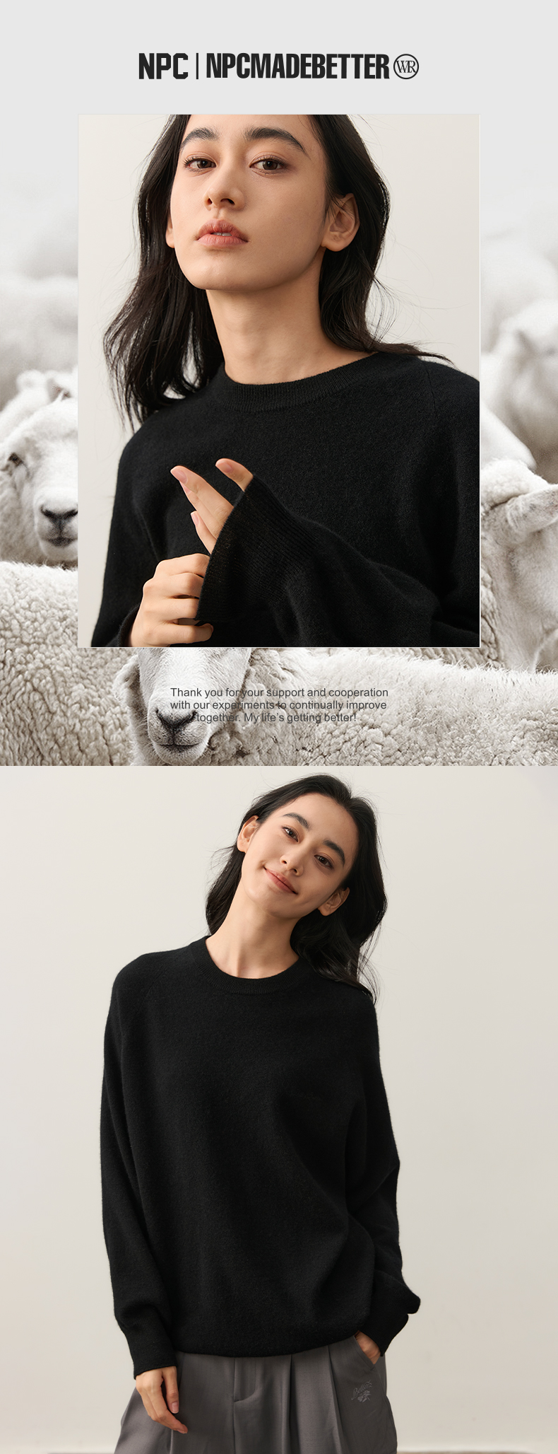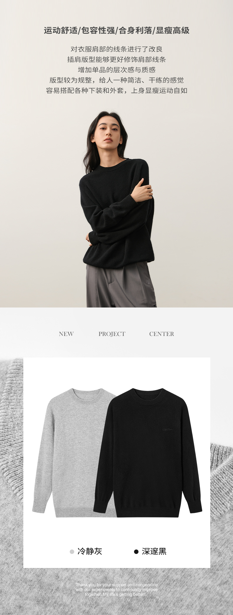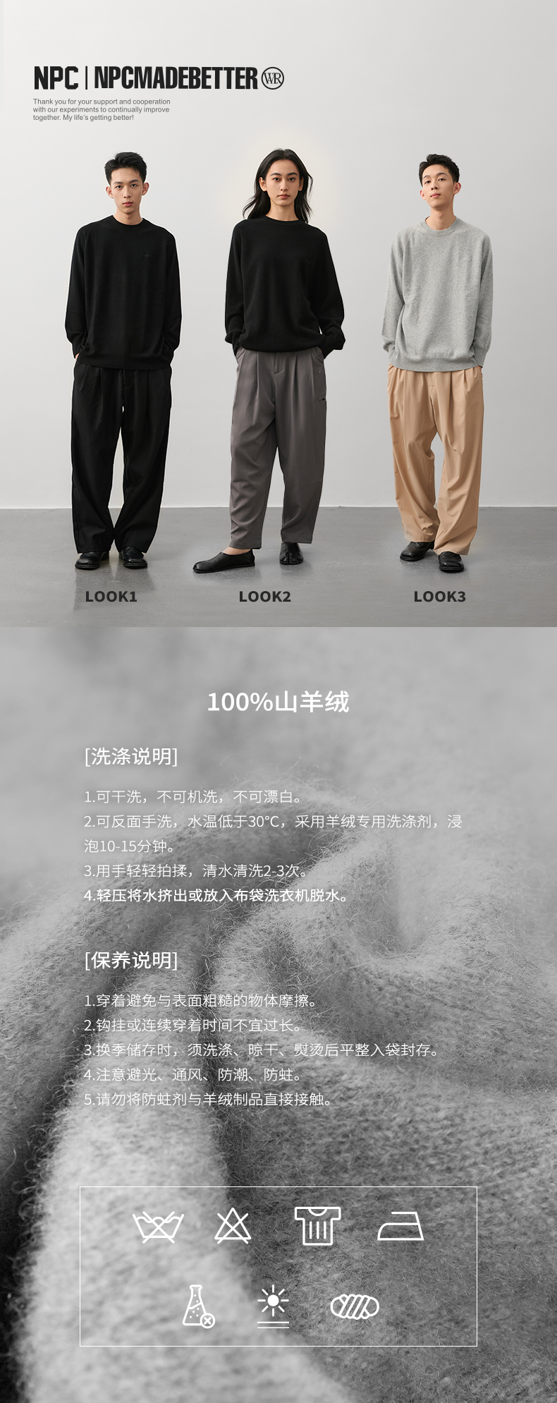 NPC潮牌字母刺绣100%山羊绒圆领羊绒衫男插肩袖简约保暖NP49SW01
