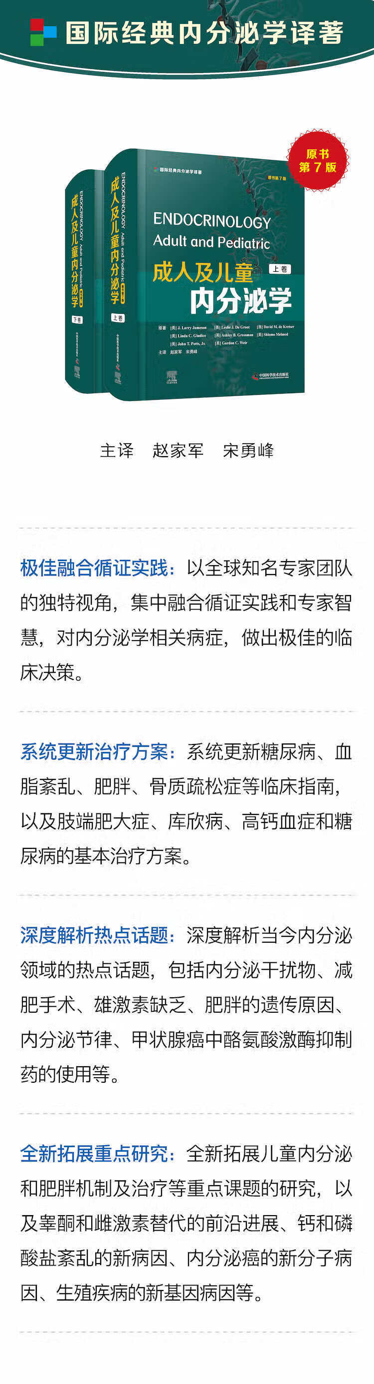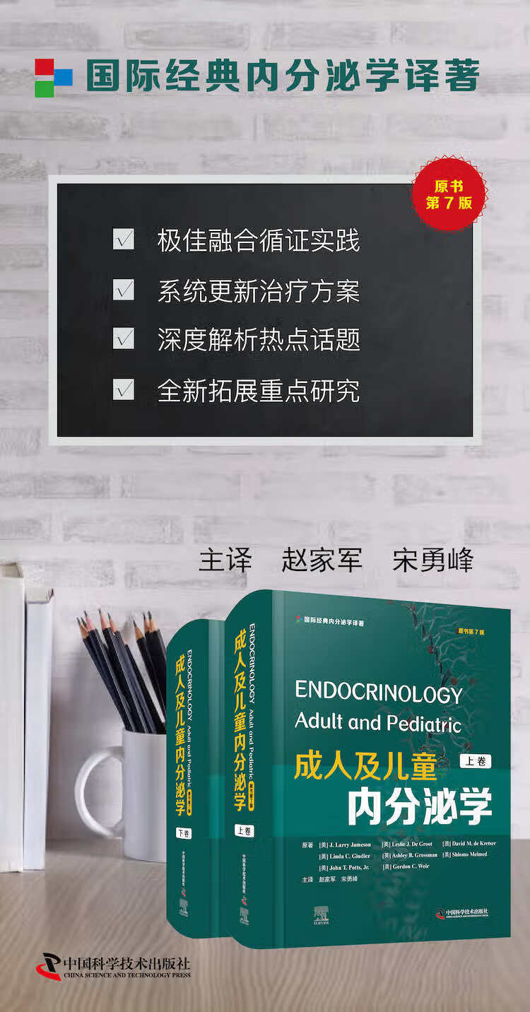 本书引进自世界Z名的 Elsevier 出版集团,由多位国际Z名的内分泌专家共同编写,是一部经历了 40 余年学术辉煌的国际经典权威内分泌学著作。 全新第 7 版,分上、下两卷,共十六篇 154 章,内容极为丰富,涵盖了内分泌在临床与基础研究的新进展。与前一版相比,对原有章节进行了大量更新,新增了代谢手术、内分泌环境干扰物、兴奋剂等内容,充分体现了内分泌学及相关学科近几年来的理念更新及技术进步。 参与本书的翻译人员均为内分泌学界的Z名专家学者,他们在忠于原著的基础上,力求贴近国内语言表述习惯和实际诊疗情境,旨在服务广大涉足内分泌学科的医务工作者,为内分泌学及相关专业临床医师、护理人员及研究人员了解本学科Z新发展、解决疑难诊治问题提供参考。