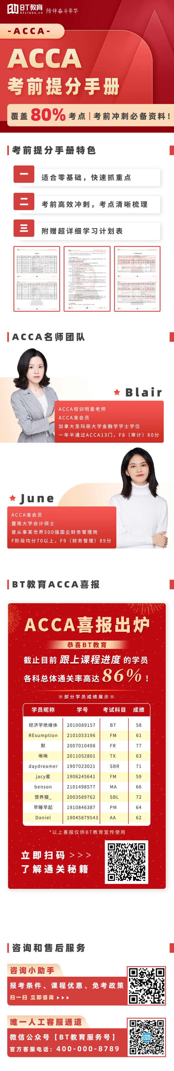 答:学习是一件很谨慎的事情,请务必认真考虑。一旦报名即表示下定决心要坚持到考场。电子资料一经购买,概不退换!购买前请到官网试听BT教育ACCA公开课。